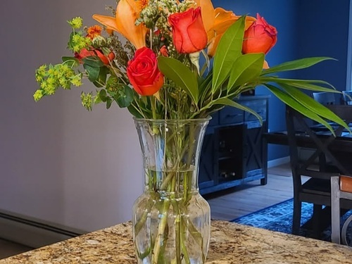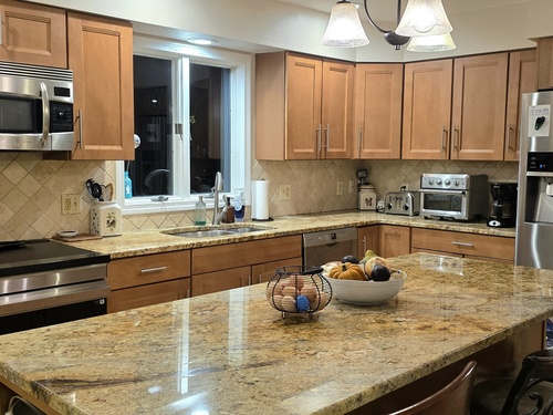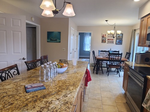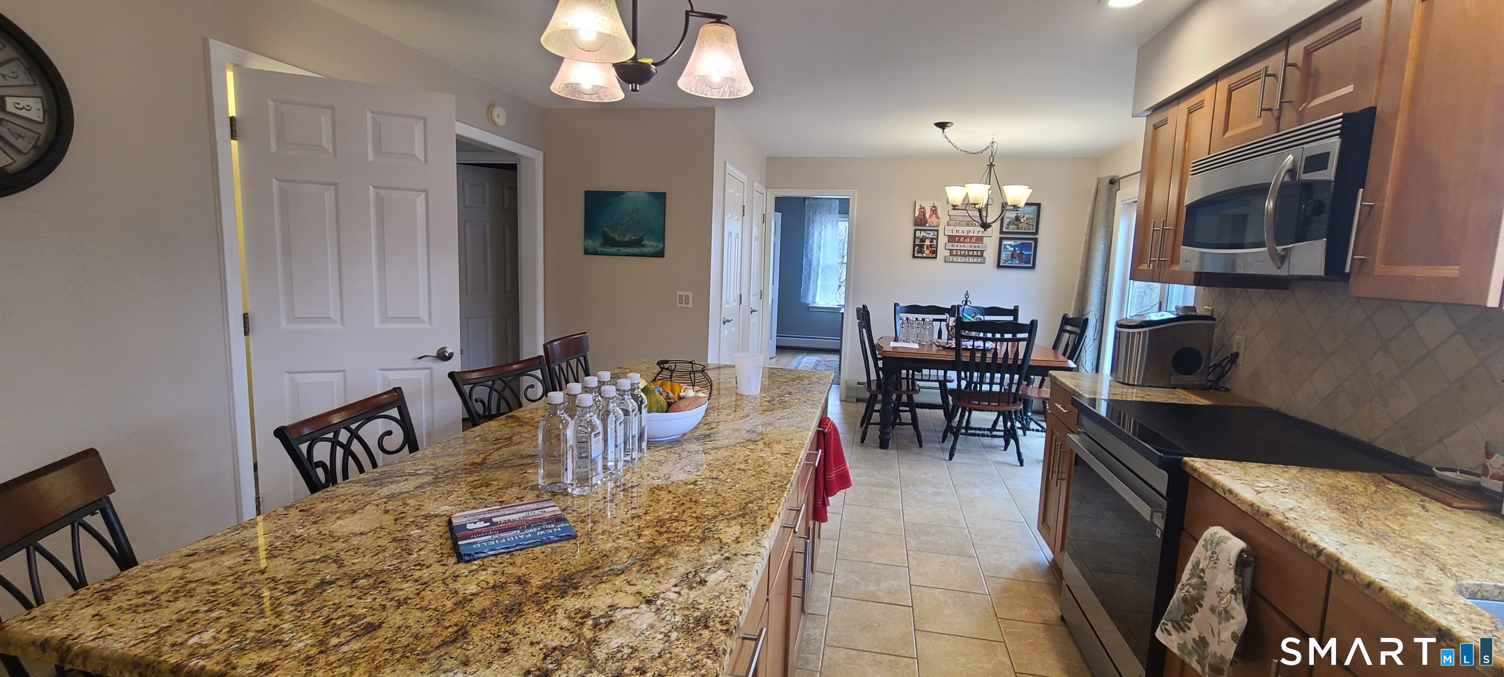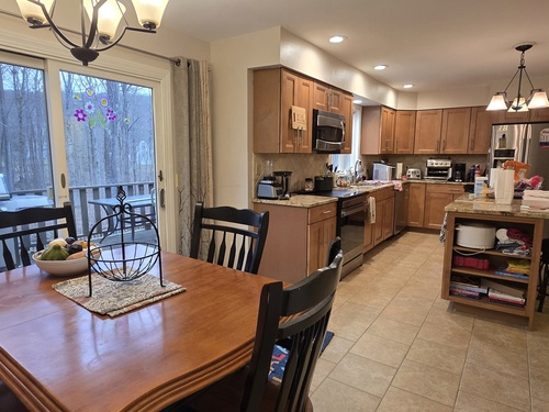 Balcony/Deck, Granite Counters, Dining Area, Island, Pantry, Tile Floor