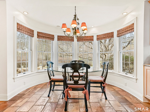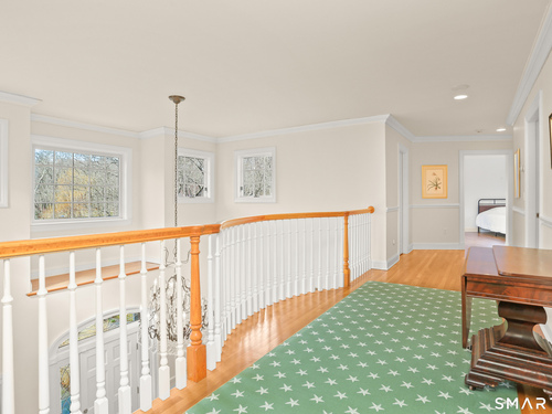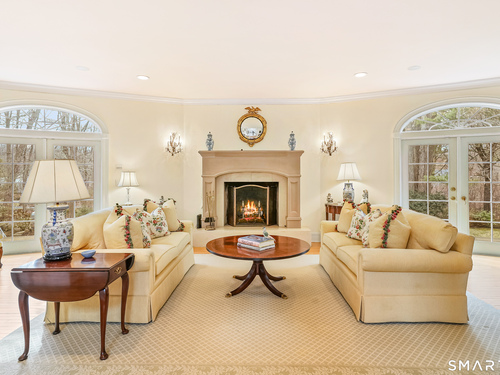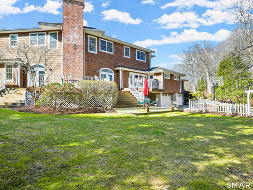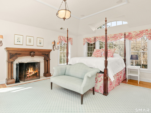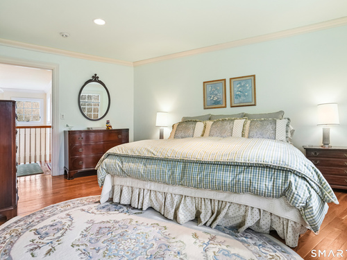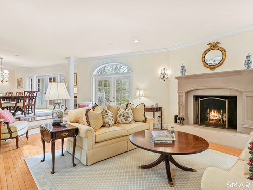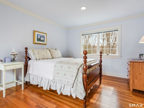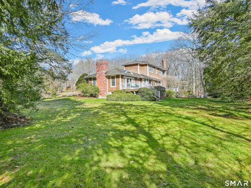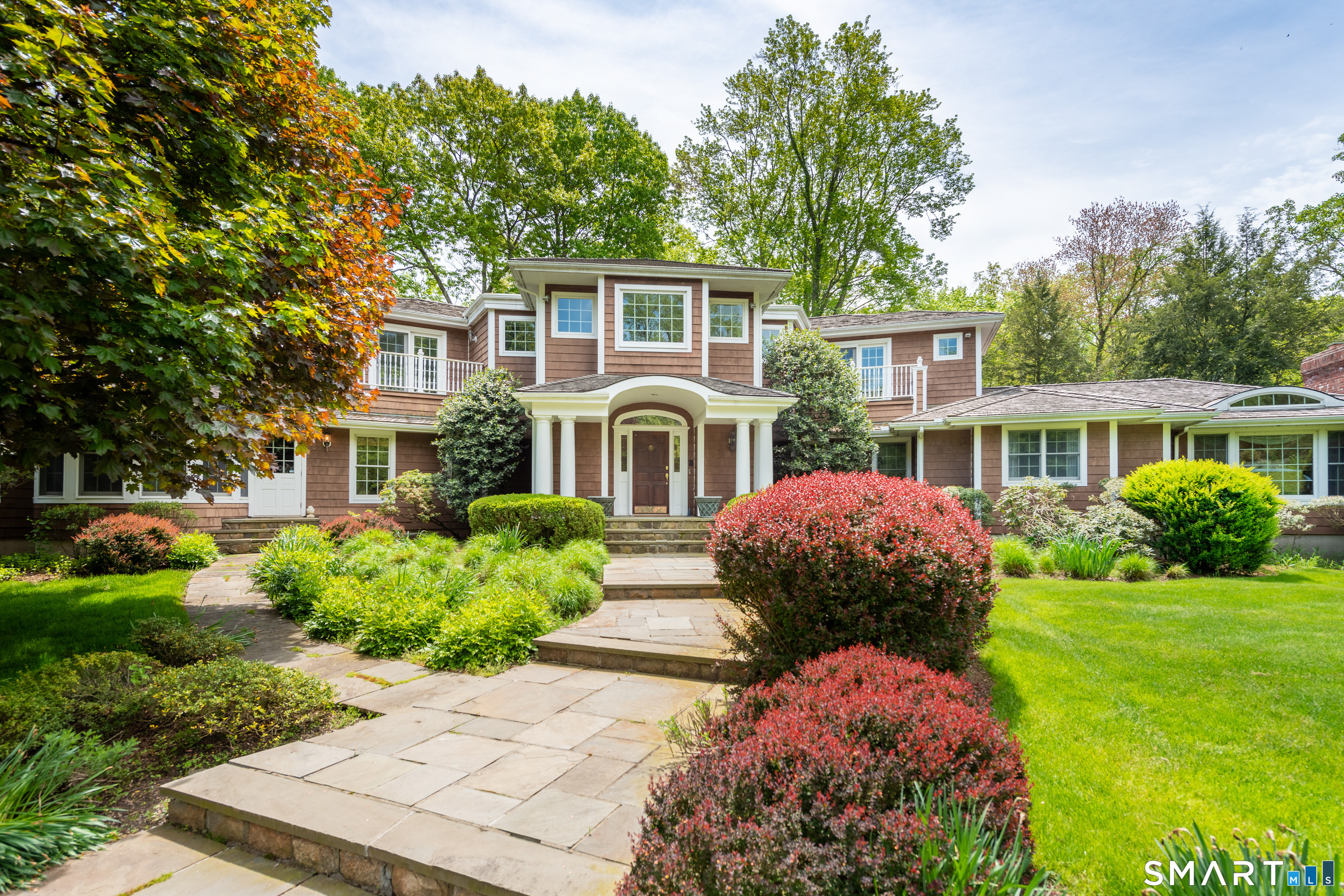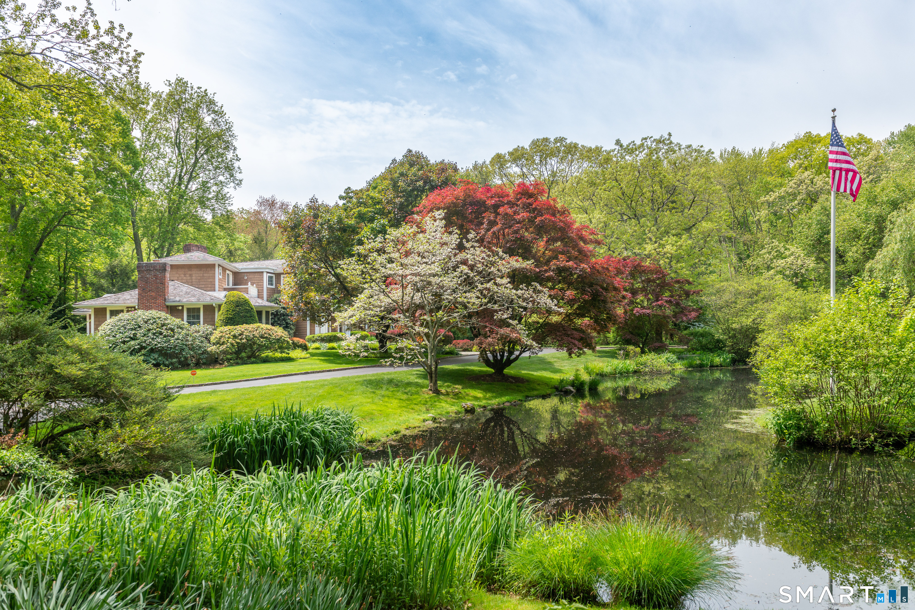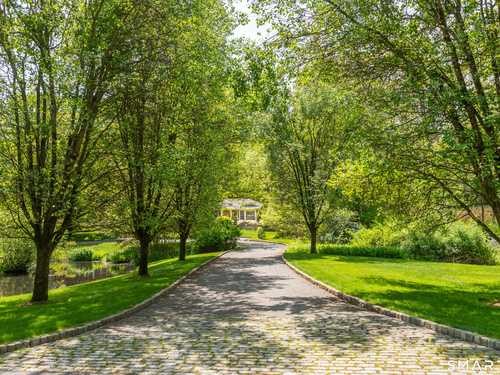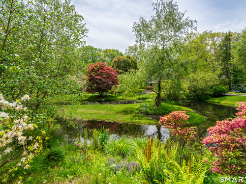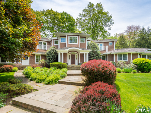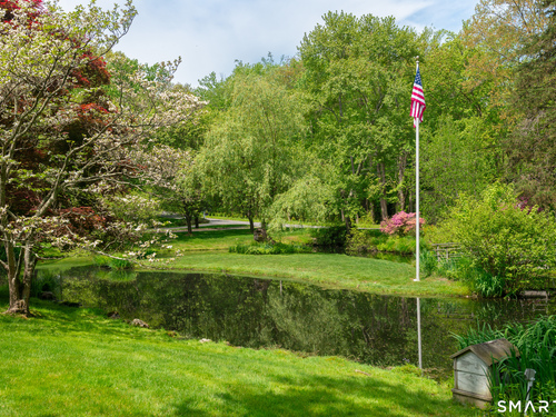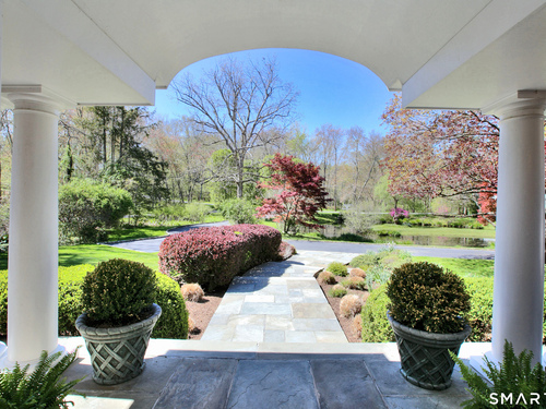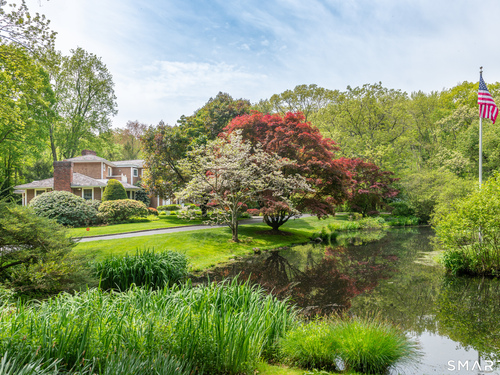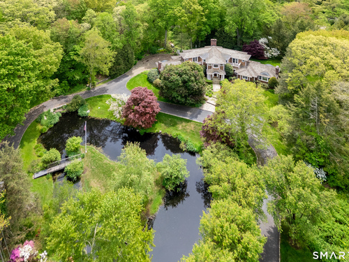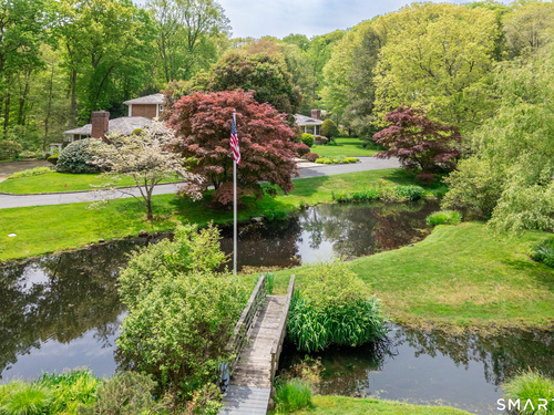 Set on a beautifully scenic 2.35-acre lot on a tranquil circle near Laurel Reservoir, this exceptional property stands as the pinnacle of curb appeal, with a picturesque pond (and private island accessed by a footbridge) leading to the home's grand facade. Completely reimagined and remodeled in 1998 by distinguished architect, Carol Kurth, and renowned builder, Joseph Sisca, the home was awarded the Society of American Registered Architects' Design Award of Merit for superior achievement and professional design excellence. The gracious two-story foyer welcomes visitors into the open concept living and dining rooms. The spacious chef's kitchen, featuring an eat-in breakfast nook with panoramic windows, adjoins an inviting family room with fireplace. Privately positioned on the main level, the primary suite includes a fireplace, private deck, and large bathroom with radiant floor heating. The upper level provides four additional bedrooms; two with ensuite baths and private balconies. The expansive finished lower level adds a rec room with wet bar, gym, workshop, and wine cellar. Beautifully integrated with its natural surroundings, the property offers exceptional privacy, scenic views, and inviting indoor-outdoor living throughout the seasons. The garage is equipped with a Tesla charging station.