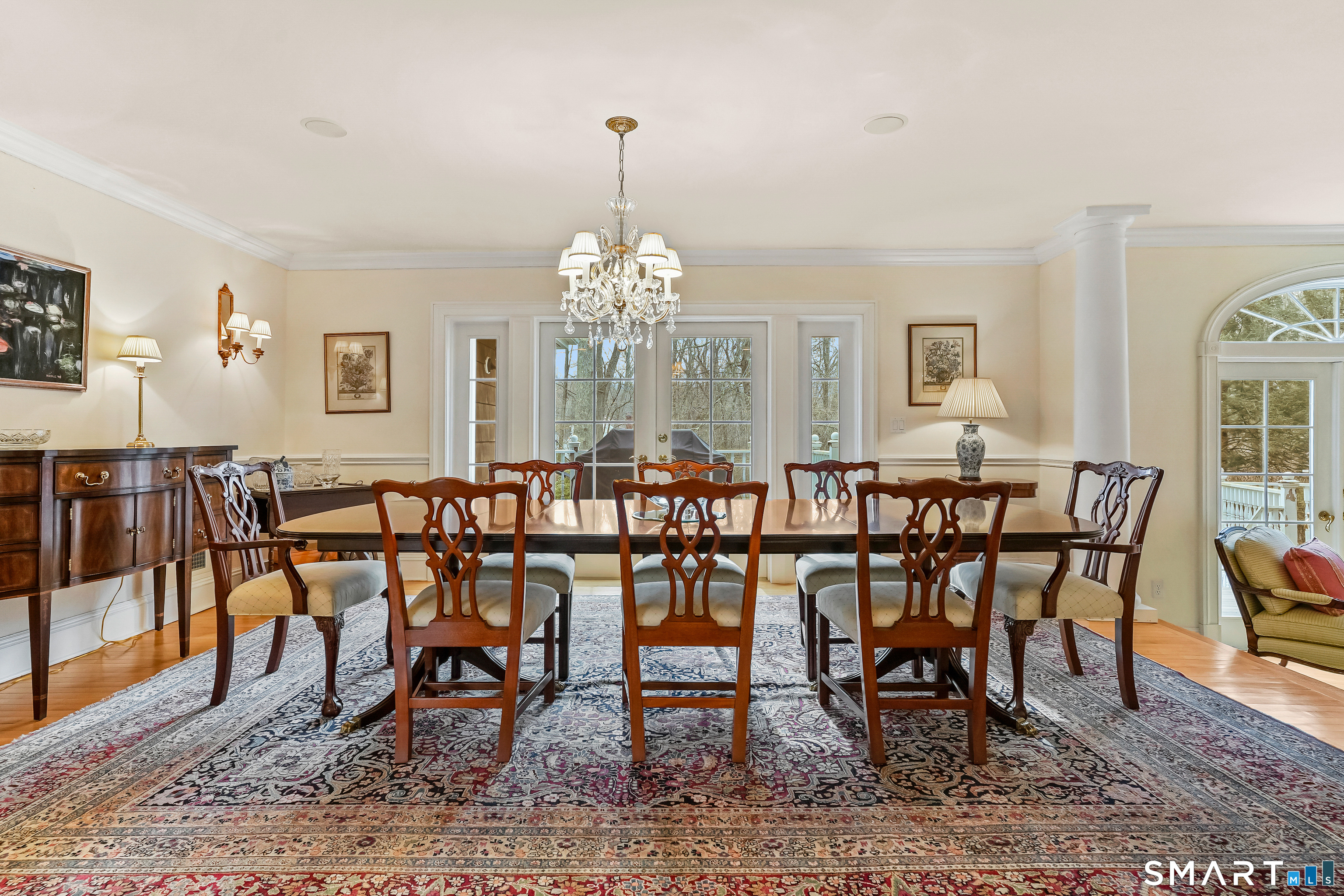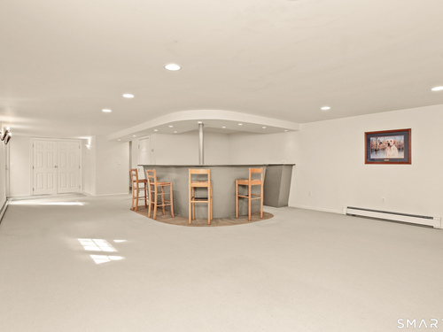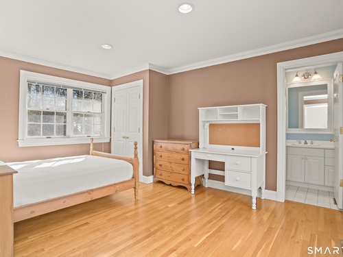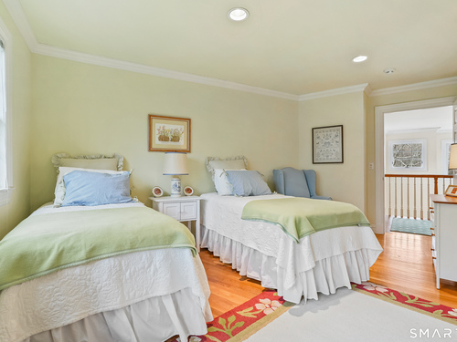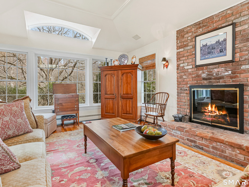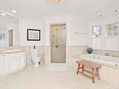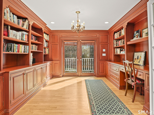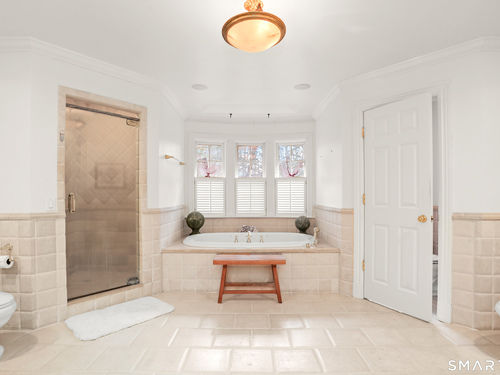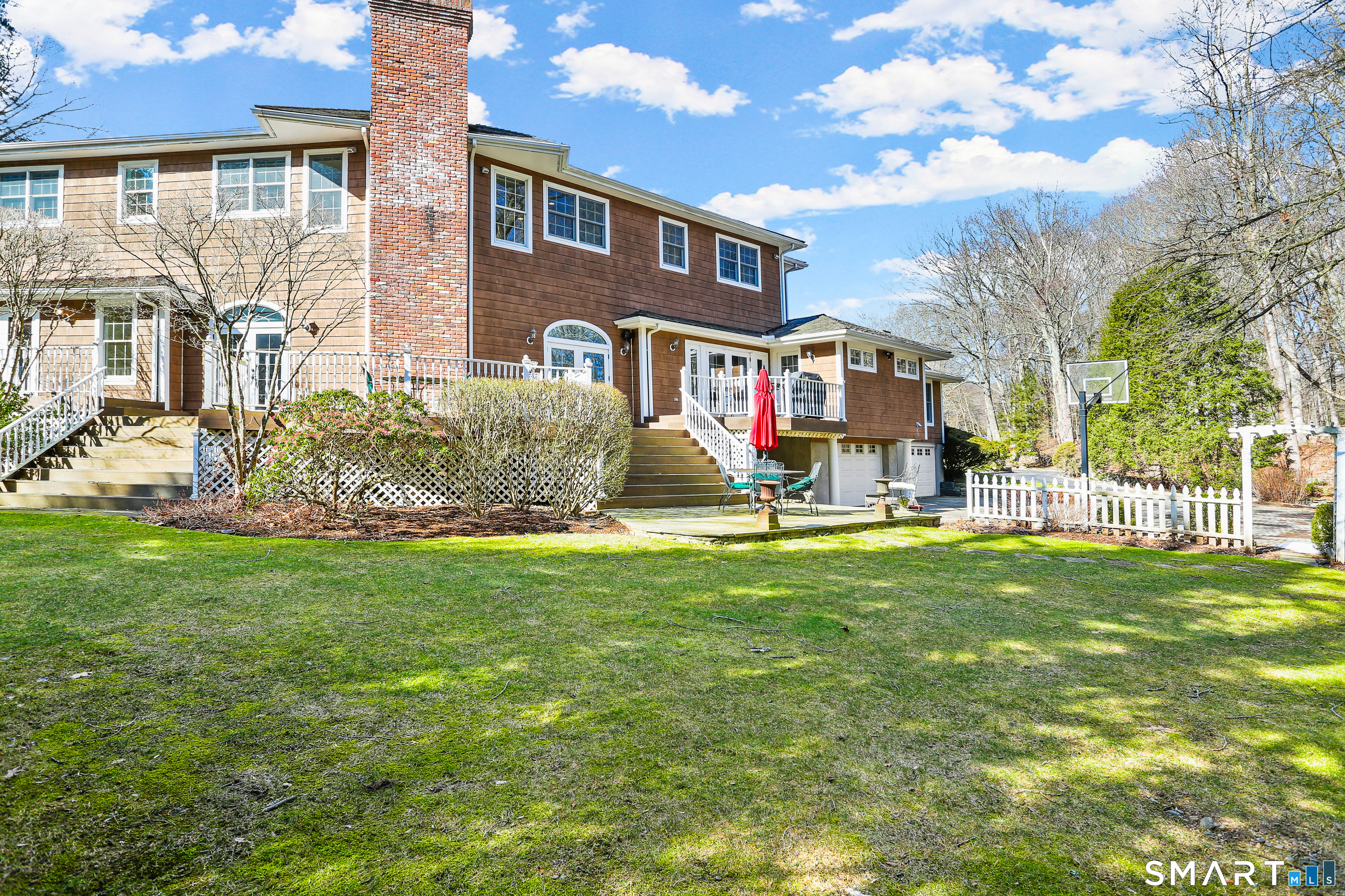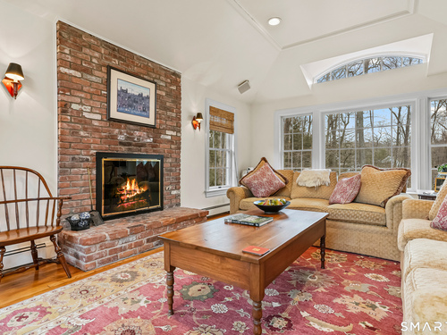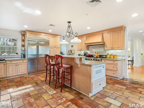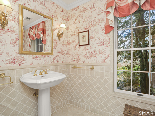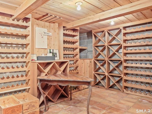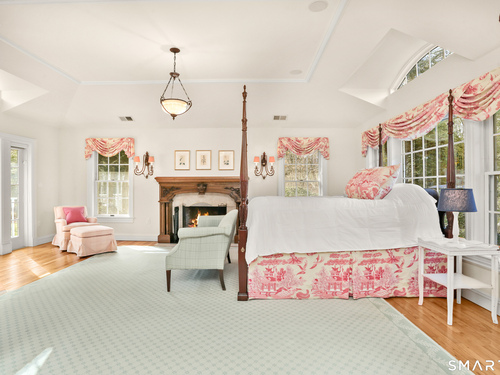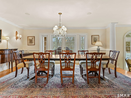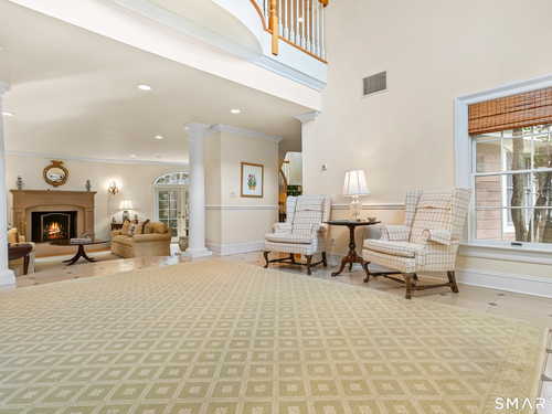 Set on a beautifully scenic 2.35-acre lot on a tranquil circle near Laurel Reservoir, this exceptional property stands as the pinnacle of curb appeal, with a picturesque pond (and private island accessed by a footbridge) leading to the home's grand facade. Completely reimagined and remodeled in 1998 by distinguished architect, Carol Kurth, and renowned builder, Joseph Sisca, the home was awarded the Society of American Registered Architects' Design Award of Merit for superior achievement and professional design excellence. The gracious two-story foyer welcomes visitors into the open concept living and dining rooms. The spacious chef's kitchen, featuring an eat-in breakfast nook with panoramic windows, adjoins an inviting family room with fireplace. Privately positioned on the main level, the primary suite includes a fireplace, private deck, and large bathroom with radiant floor heating. The upper level provides four additional bedrooms; two with ensuite baths and private balconies. The expansive finished lower level adds a rec room with wet bar, gym, workshop, and wine cellar. Beautifully integrated with its natural surroundings, the property offers exceptional privacy, scenic views, and inviting indoor-outdoor living throughout the seasons. The garage is equipped with a Tesla charging station.