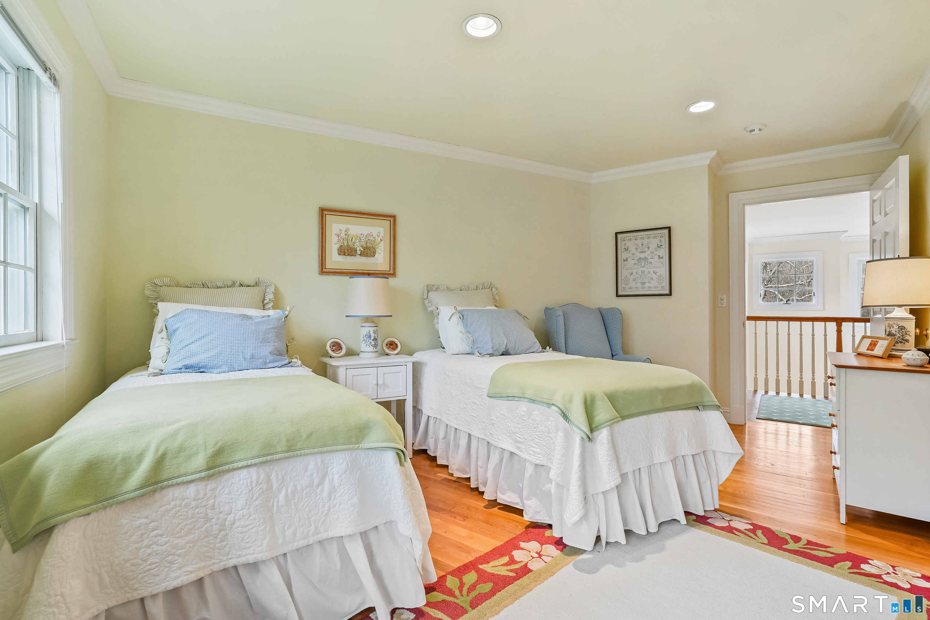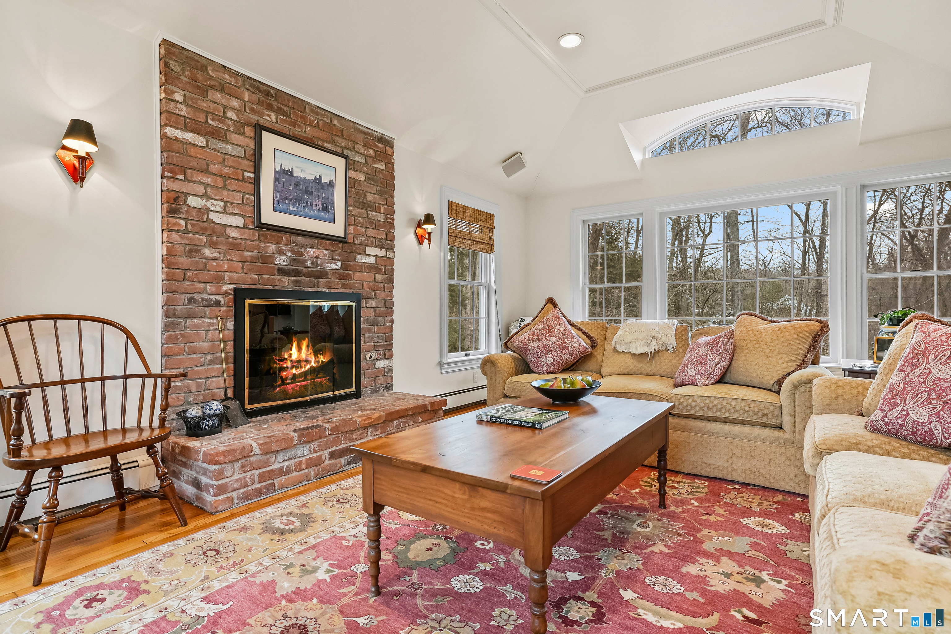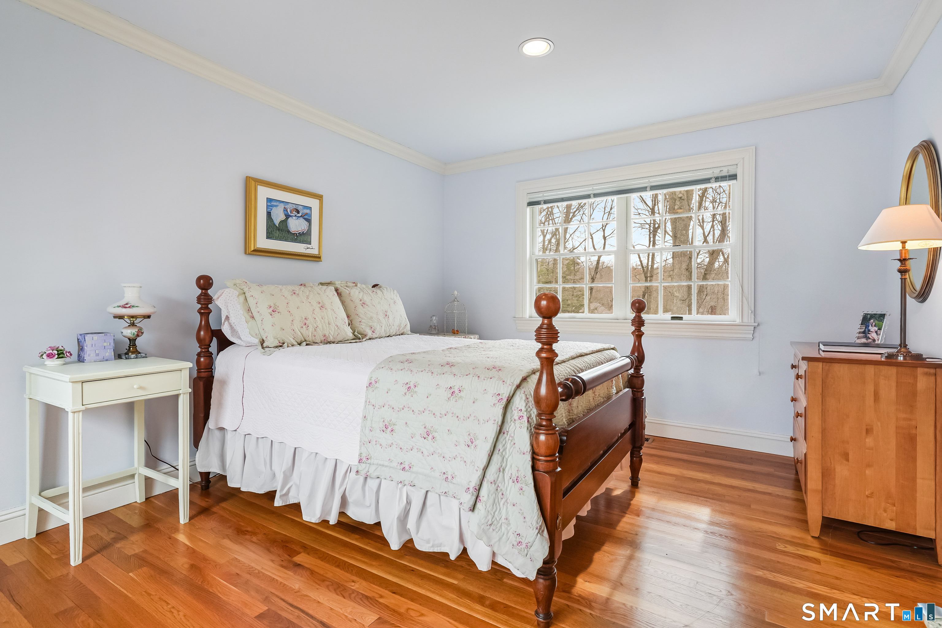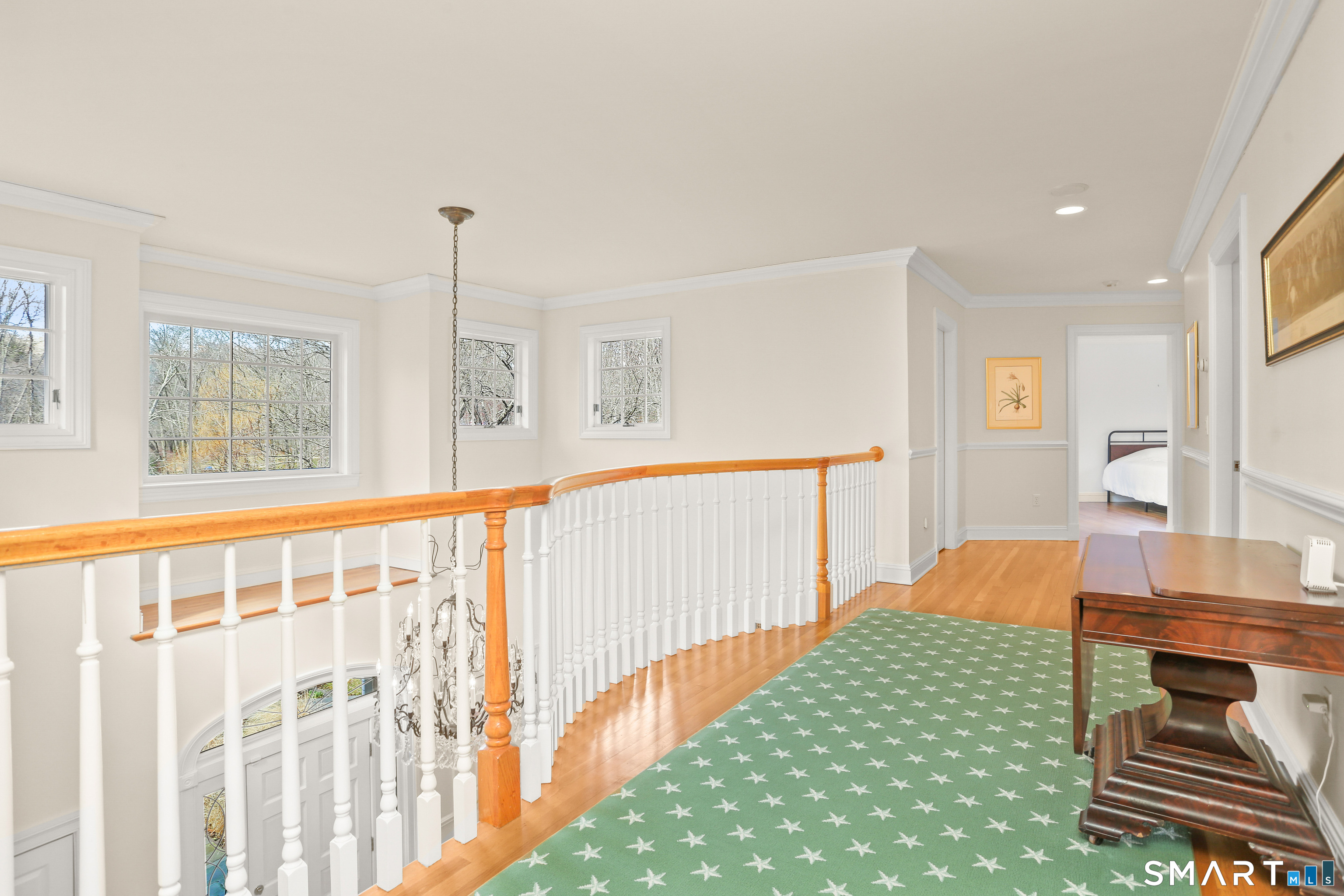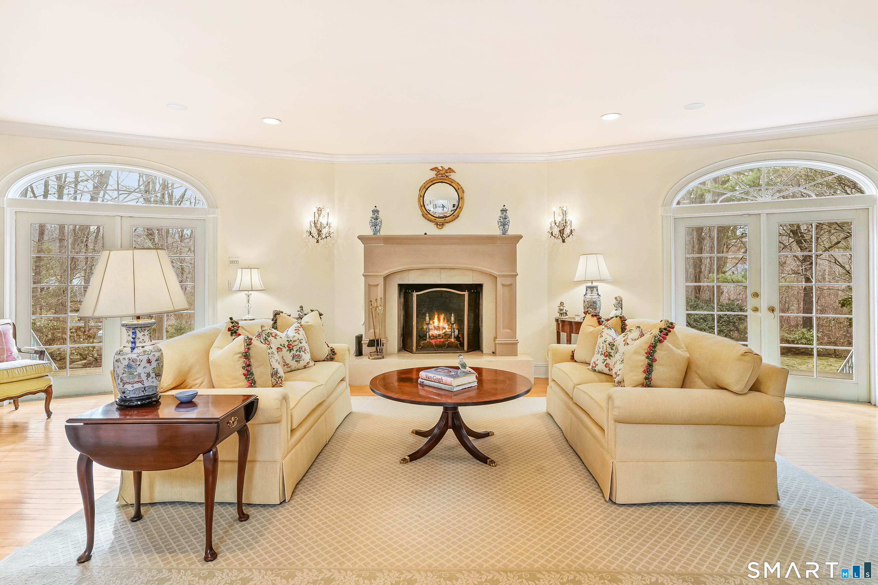 Set on a beautifully scenic 2.35-acre lot on a tranquil circle near Laurel Reservoir, this exceptional property stands as the pinnacle of curb appeal, with a picturesque pond (and private island accessed by a footbridge) leading to the home's grand facade. Completely reimagined and remodeled in 1998 by distinguished architect, Carol Kurth, and renowned builder, Joseph Sisca, the home was awarded the Society of American Registered Architects' Design Award of Merit for superior achievement and professional design excellence. The gracious two-story foyer welcomes visitors into the open concept living and dining rooms. The spacious chef's kitchen, featuring an eat-in breakfast nook with panoramic windows, adjoins an inviting family room with fireplace. Privately positioned on the main level, the primary suite includes a fireplace, private deck, and large bathroom with radiant floor heating. The upper level provides four additional bedrooms; two with ensuite baths and private balconies. The expansive finished lower level adds a rec room with wet bar, gym, workshop, and wine cellar. Beautifully integrated with its natural surroundings, the property offers exceptional privacy, scenic views, and inviting indoor-outdoor living throughout the seasons. The garage is equipped with a Tesla charging station.