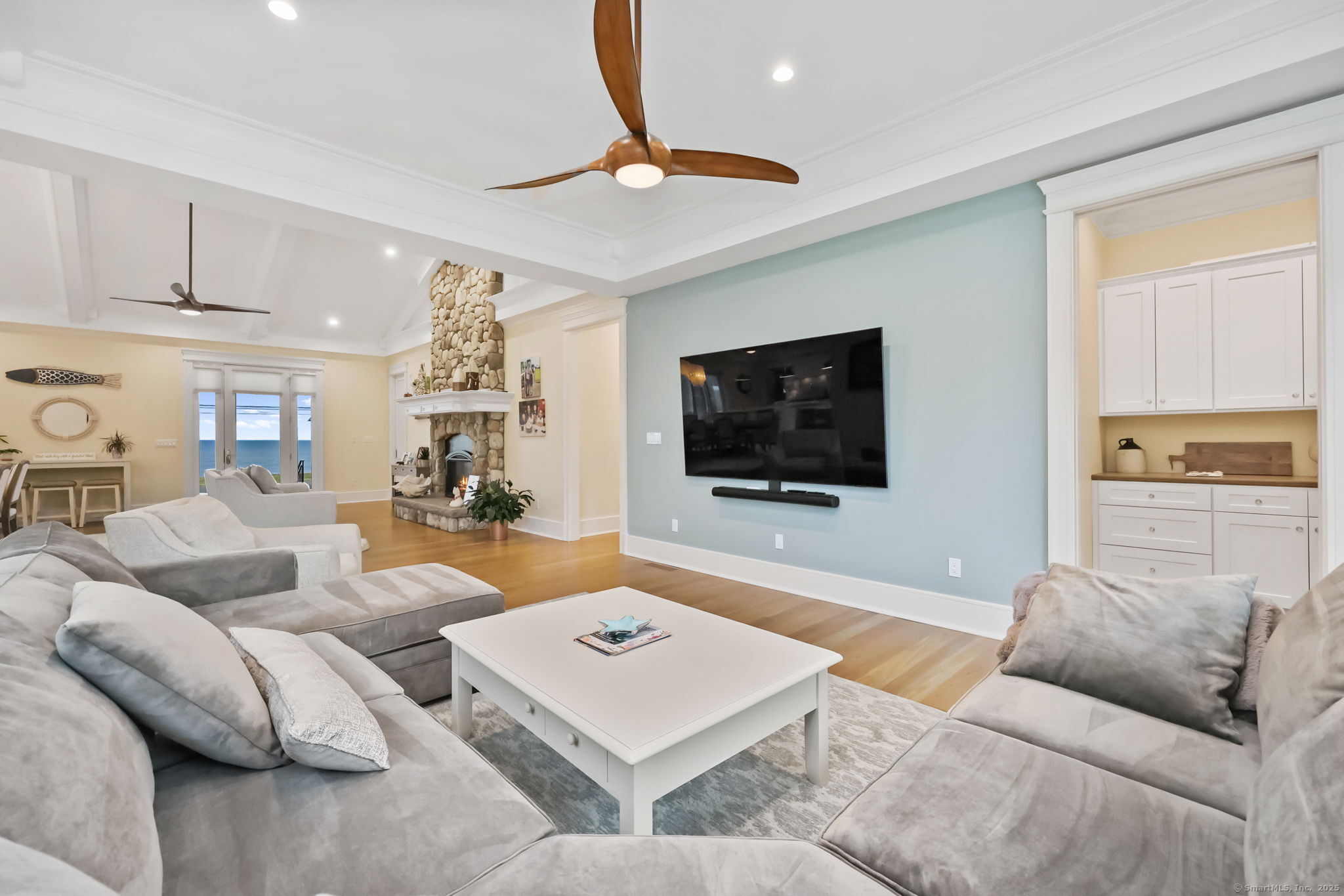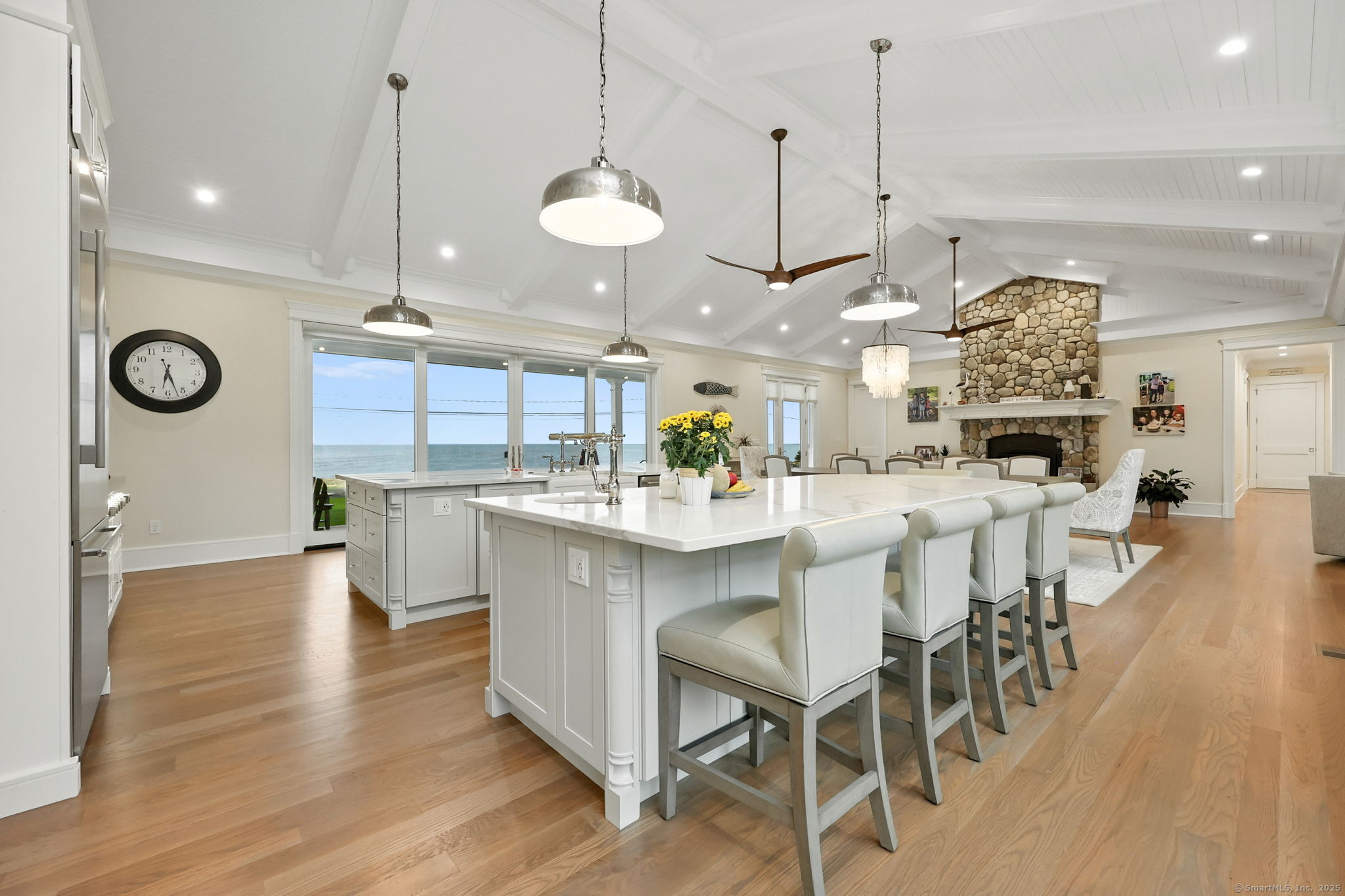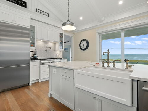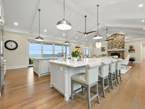 Coastal living meets everyday luxury in this waterfront gem in Lordship - welcome home! This custom-built waterfront home offers finely crafted living spaces, including a 3,700+ sq. ft. ranch-style main level, a framed walk-out lower level, and a private 2,000 sq. ft. multi-purpose area, which is framed out and drywalled to serve as 1,000 sq. ft. of living space and 1,000 sq. ft. of storage space. The waterfront views of this property are breathtaking! Designed with vaulted ceilings, White Oak floors, Marvin windows, and expansive glass panels, this home embraces its coastal setting on Lordship's shoreline. Highlights include a chef's Thermador kitchen (complete with a double wall oven and warming drawer, a speed oven with microwave, dishwasher, built-in refrigerator, and 6-burner range with a griddle and pot filler), dual islands, a vaulted great room with a stone fireplace, two luxurious primary suites, spa-inspired baths with heated floors, and expansive, architecturally inspired outdoor living areas. Enjoy a cozy fire on the patio or an outdoor shower after a day at the beach! Ring cameras, alarm system, generator, and a heated/AC 3-bay garage with EV outlet complete this exceptional opportunity for multi-generational waterfront living. Don't miss your chance to tour this luxurious property!
