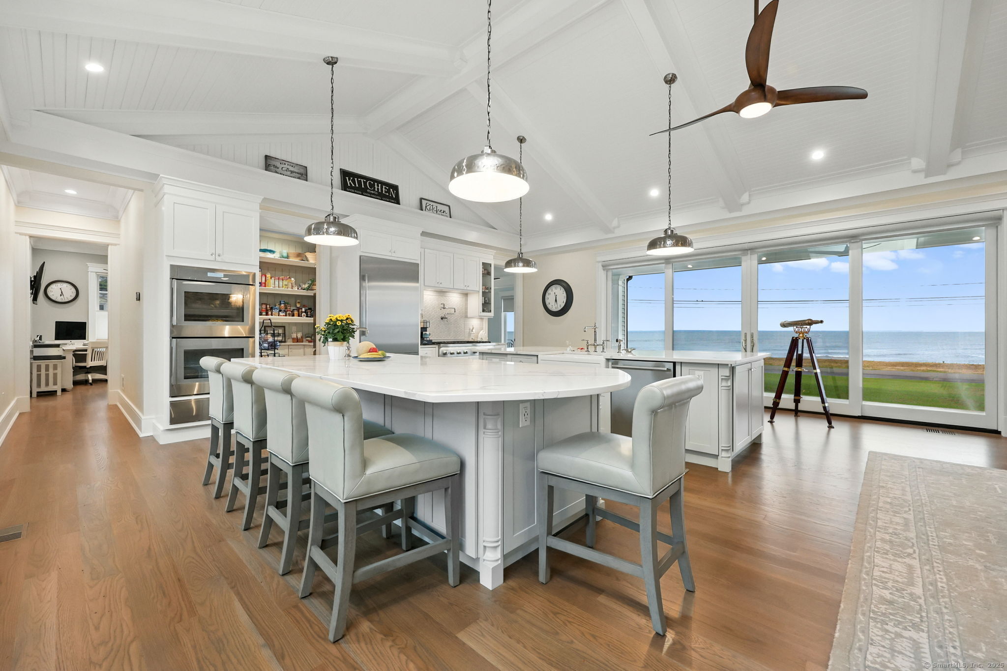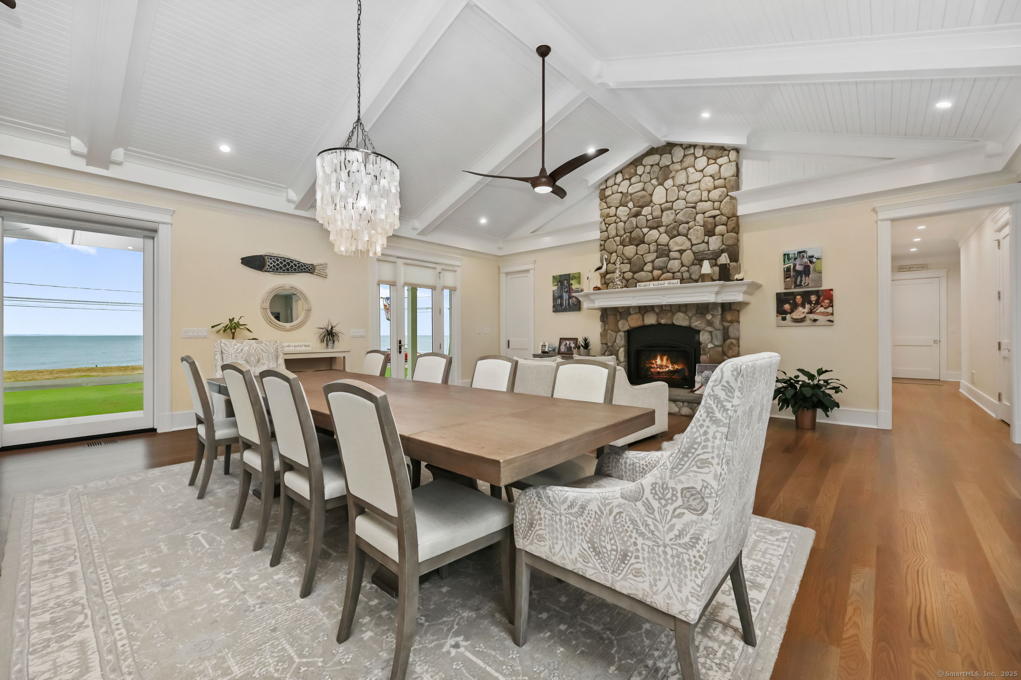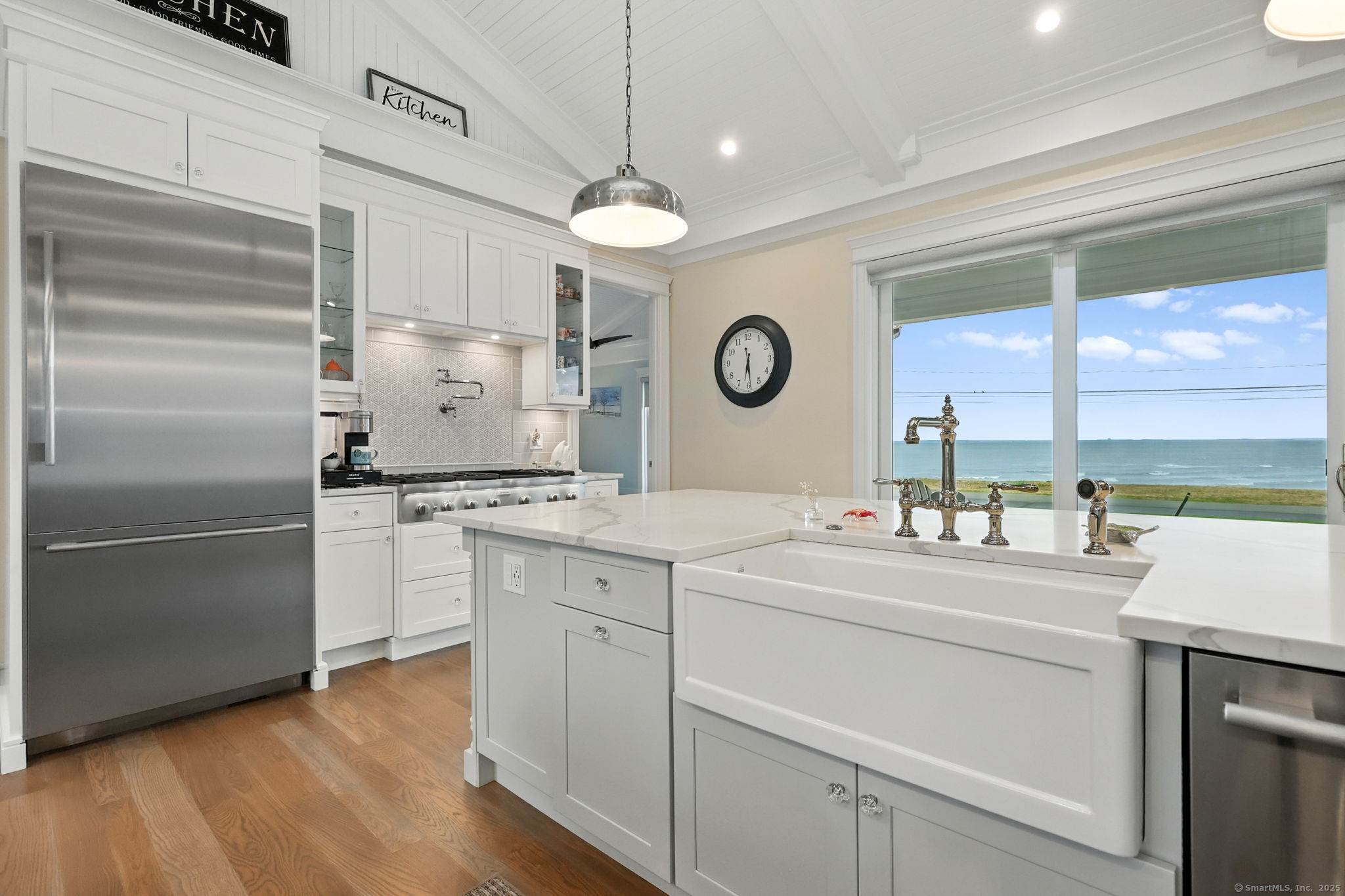 Coastal living meets everyday luxury in this waterfront gem in Lordship - welcome home! This custom-built waterfront home offers finely crafted living spaces, including a 3,700+ sq. ft. ranch-style main level, a framed walk-out lower level, and a private 2,000 sq. ft. multi-purpose area, which is framed out and drywalled to serve as 1,000 sq. ft. of living space and 1,000 sq. ft. of storage space. The waterfront views of this property are breathtaking! Designed with vaulted ceilings, White Oak floors, Marvin windows, and expansive glass panels, this home embraces its coastal setting on Lordship's shoreline. Highlights include a chef's Thermador kitchen (complete with a double wall oven and warming drawer, a speed oven with microwave, dishwasher, built-in refrigerator, and 6-burner range with a griddle and pot filler), dual islands, a vaulted great room with a stone fireplace, two luxurious primary suites, spa-inspired baths with heated floors, and expansive, architecturally inspired outdoor living areas. Enjoy a cozy fire on the patio or an outdoor shower after a day at the beach! Ring cameras, alarm system, generator, and a heated/AC 3-bay garage with EV outlet complete this exceptional opportunity for multi-generational waterfront living. Don't miss your chance to tour this luxurious property!