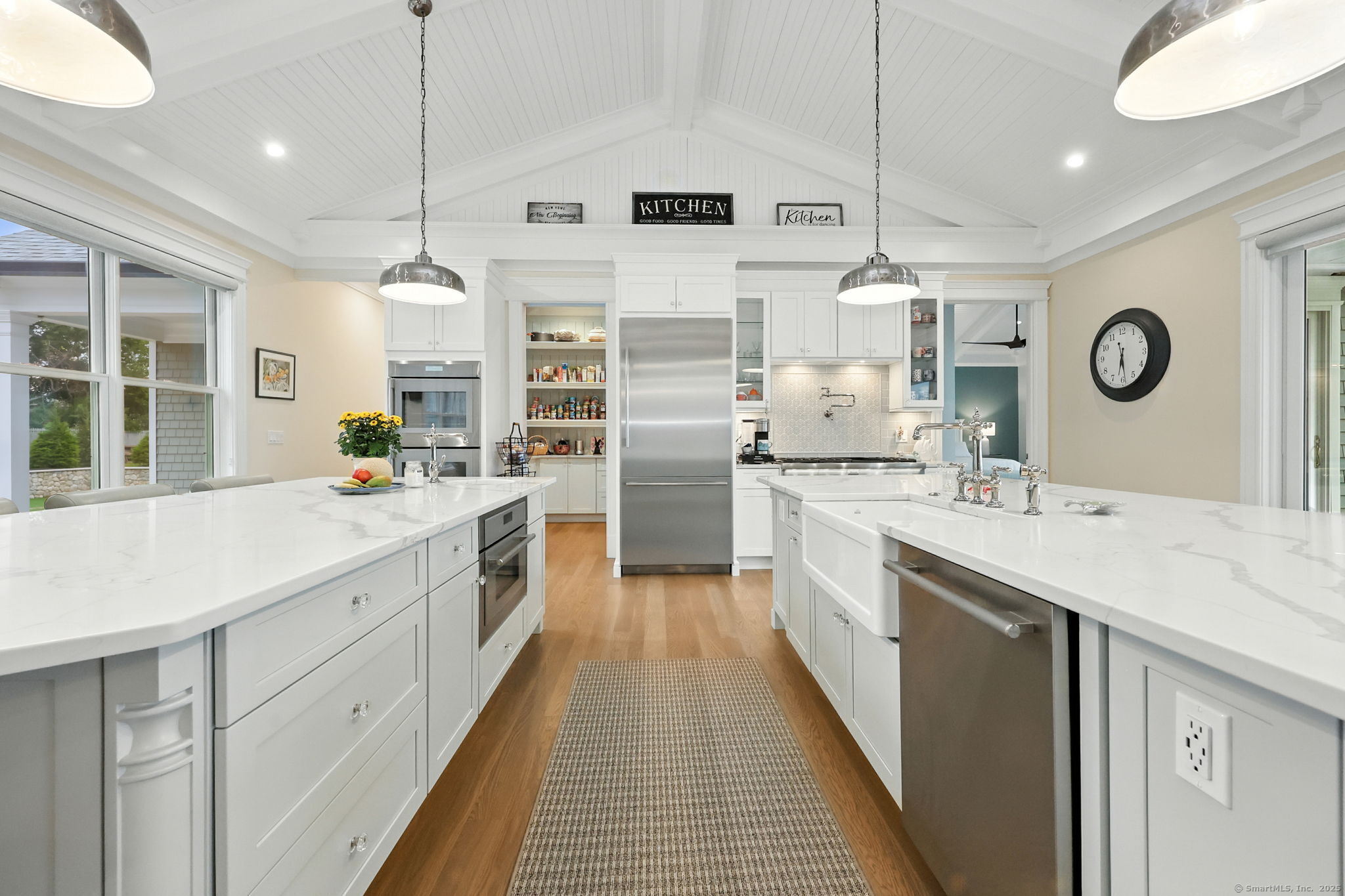 Vaulted Ceiling, Beams, Quartz Counters, Island, Pantry, Patio/Terrace
