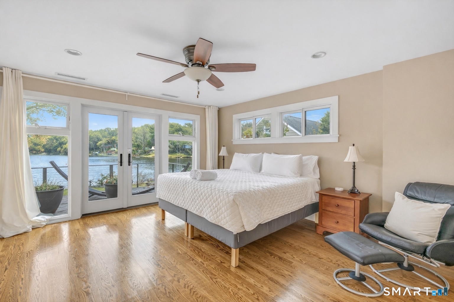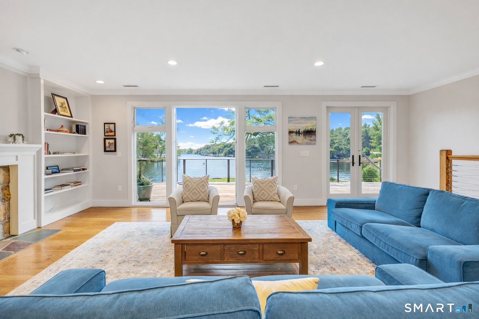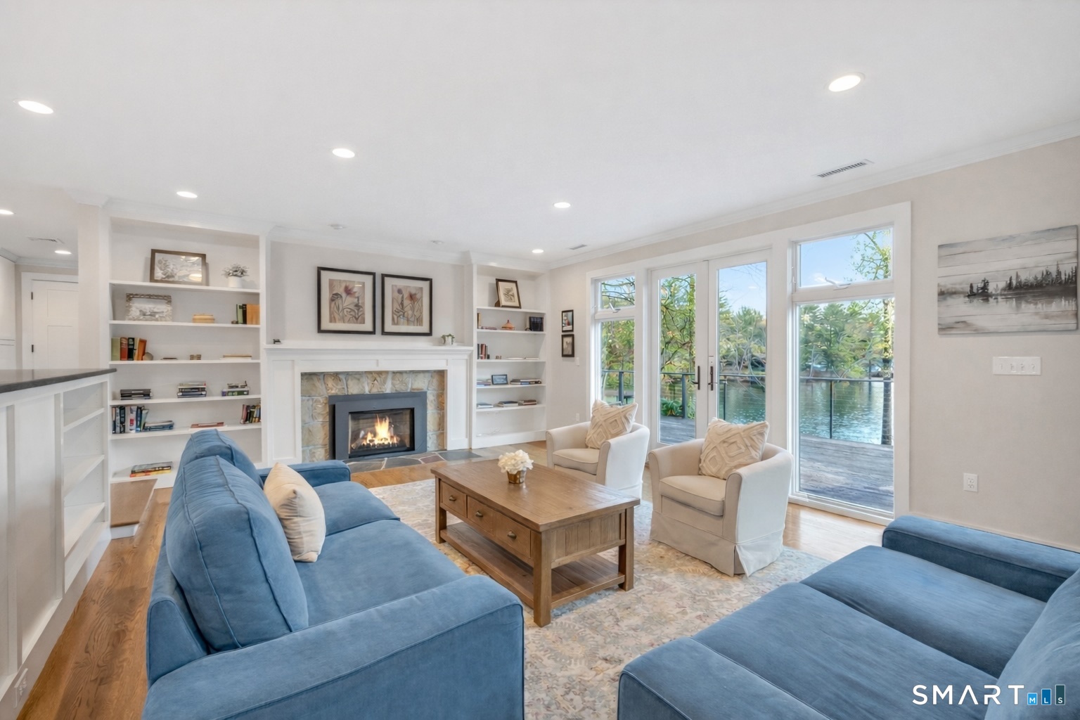 Balcony/Deck, Built-Ins, Entertainment Center, Fireplace, French Doors, Hardwood Floor