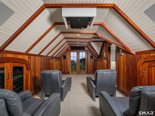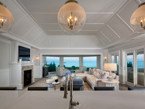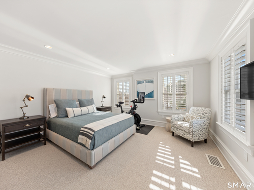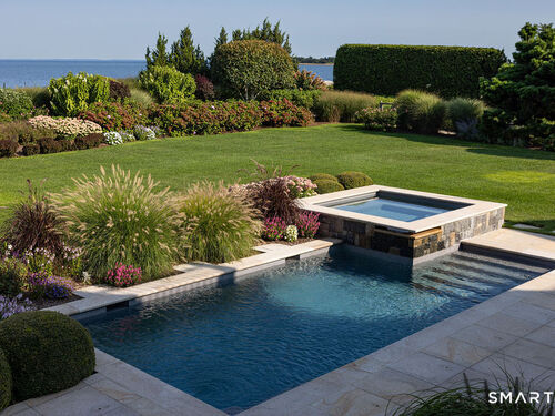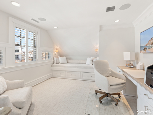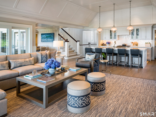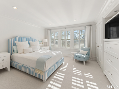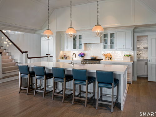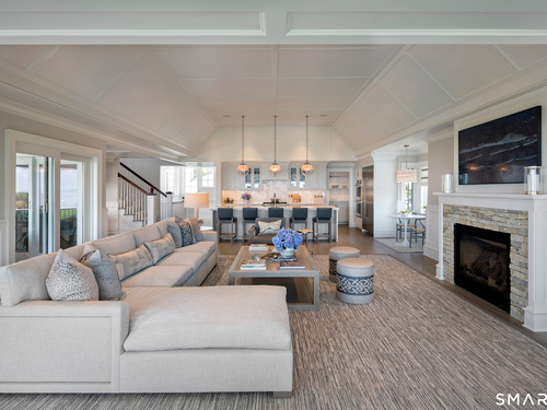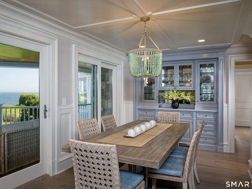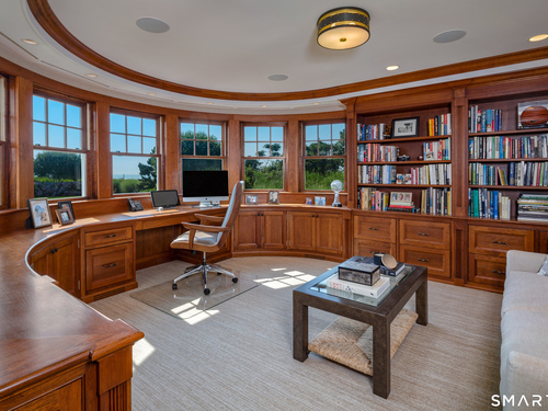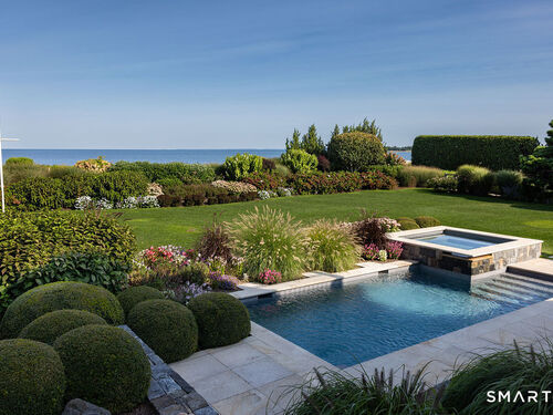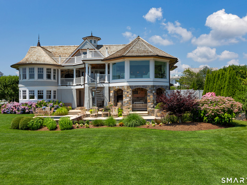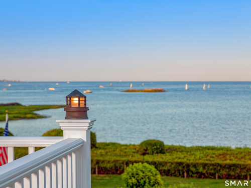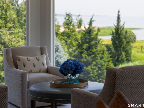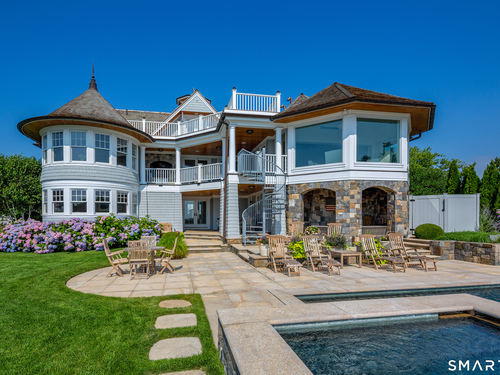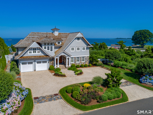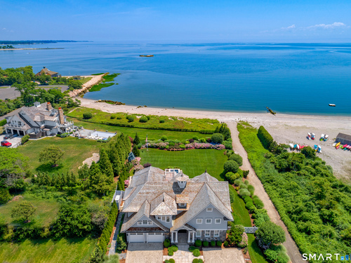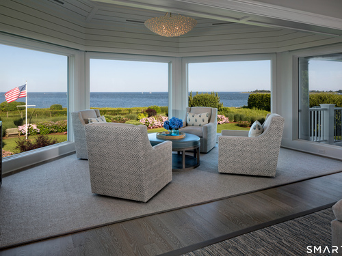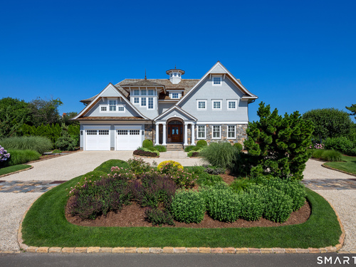 Perched at the point of Saugatuck Island, Seven Sandpiper Road is pure New England perfection. The three story Nantucket style home is meticulously designed by architect Peter Cadoux to soak up the sparkling Long Island Sound views from all angles. The main floor holds the horizon directly at eye level from the open concept living areas - a light and bright gourmet kitchen with island seating, a breakfast nook and butler's pantry leads into the spacious family room with stone fireplace and deck access, but the show stopping sun room wins for best seat in the house where the floor to ceiling windows feel like the bow of a ship. The formal dining room also opens to the deck set for both lounging and grilling. In the primary wing, a breathtaking bedroom looks over the gorgeous grounds and water beyond, while the beautiful his and hers combined bath takes in the south facing Sound view. There are dual walk-in wardrobe closets as well as a second laundry closet. An stunning office rounds out the main floor, while the third floor holds a guest suite/media room with balcony and one of the most spectacular "roof" level decks in all of Westport! On the ground level, there are two bedrooms of generous size, each with their own ensuite bath and custom closets as well as a true library style office. Across the foyer, the cabana kitchenette and bath are conveniently located close to the pool and beach! Peaceful and private, the "backyard" consists of the covered grotto spilling right on