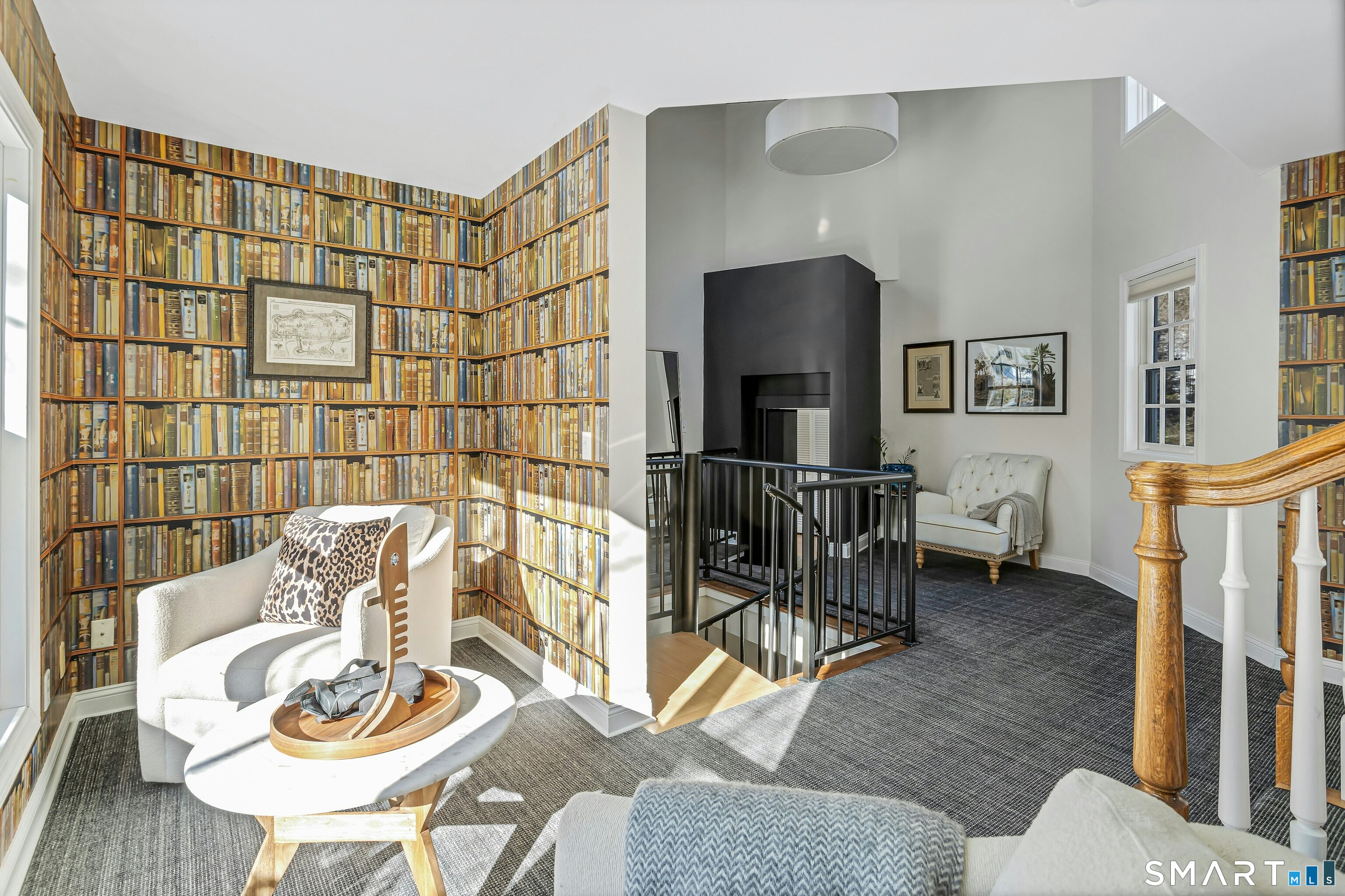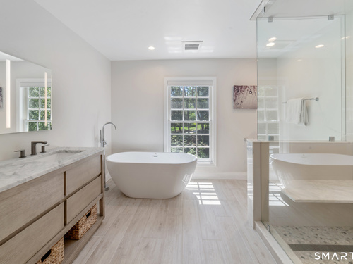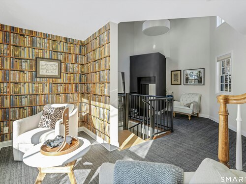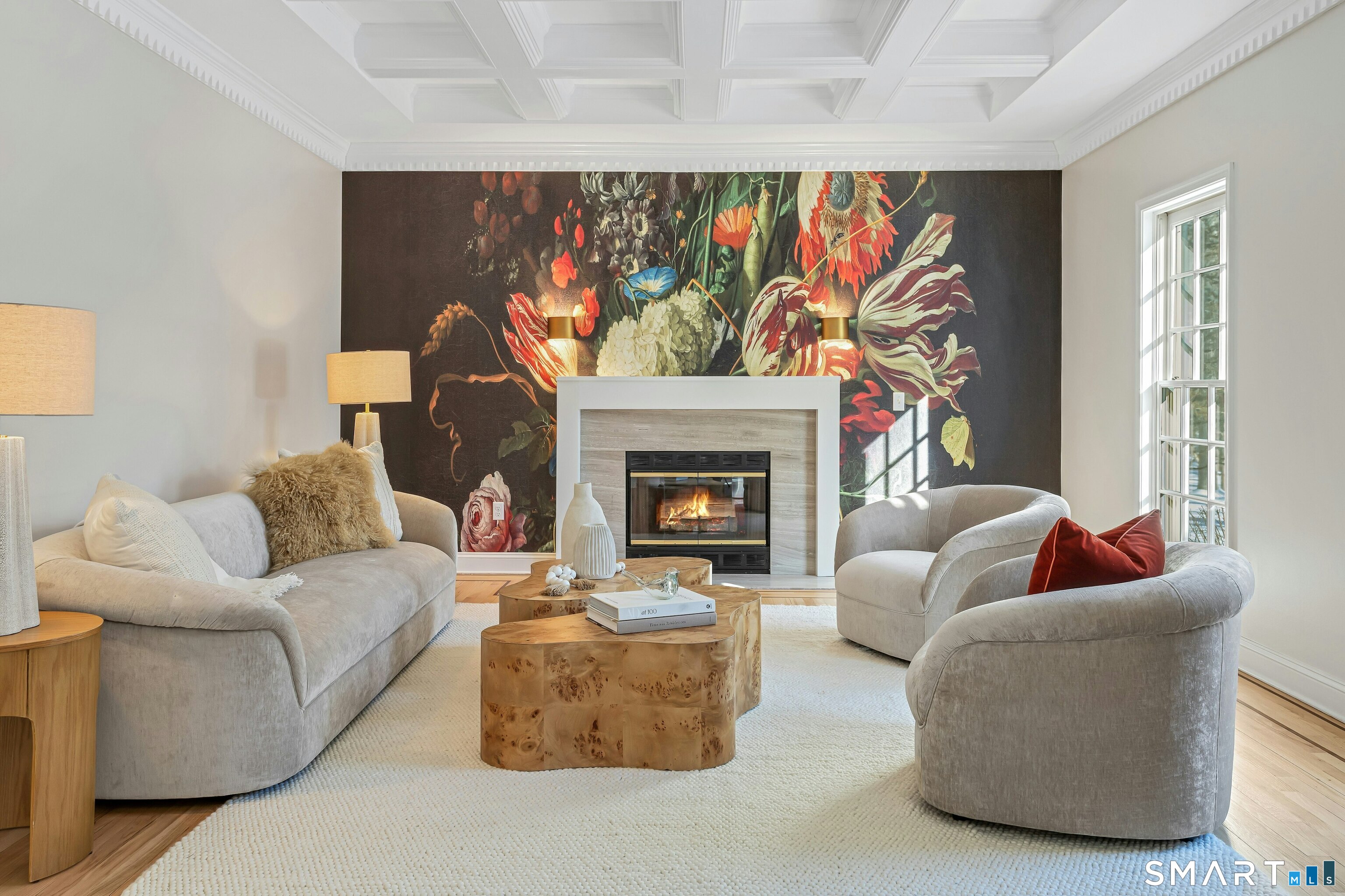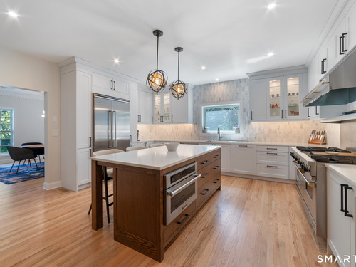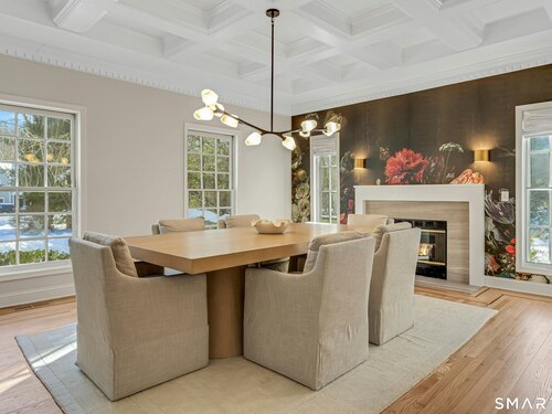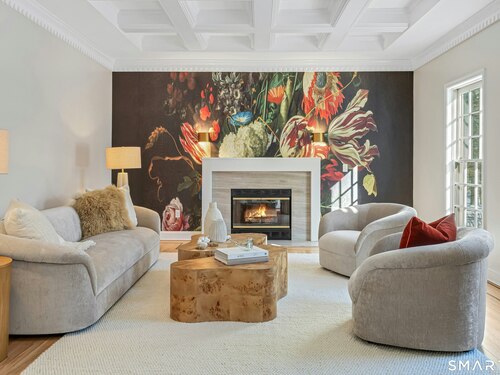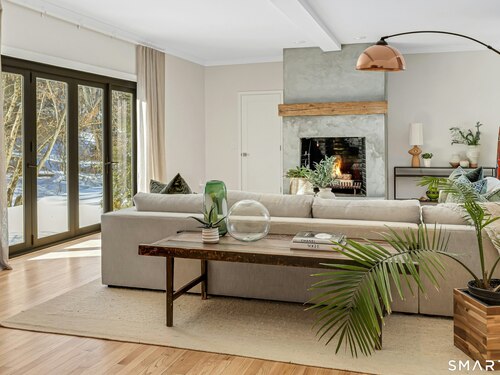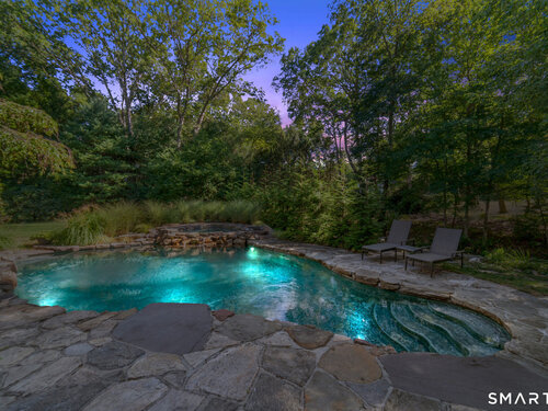 Completely and thoughtfully renovated, this exceptional New Canaan residence blends timeless architecture with refined modern luxury in a magical private setting overlooking the Noroton River and cascading waterfalls. Located on one of New Canaan's most coveted Westside streets, the home enjoys a close-knit neighborhood known for friendly gatherings and neighborhood parties. The heart of the home is a chef's kitchen with Viking appliances, custom white oak island and pantry, and Mont Blanc quartz countertops. Designer finishes include newly renovated baths, a recycled glass and concrete bar top, imported European wallpaper murals, and Restoration Hardware lighting. Architectural details such as hidden bookcase doors, refinished wood floors, and a dramatic slide-and-stack door system create seamless indoor-outdoor living filled with natural light.The main residence offers soaring ceilings, four fireplaces, a sun-filled library, expansive primary suite, three additional bedrooms, office, and a finished lower level with recreation room and gym. In addition to the main residence, this unique home features a separate yet attached two-bedroom, two-bath guest, au-pair or in-law suite, and its own living, dining, and eat-in kitchen. Outdoors,enjoy a heated Gunite pool, professionally landscaped grounds, and tranquil river views. New roof, Generac generator, and updated mechanicals provide peace of mind. This serene retreat offers an exceptional New Canaan lifestyle