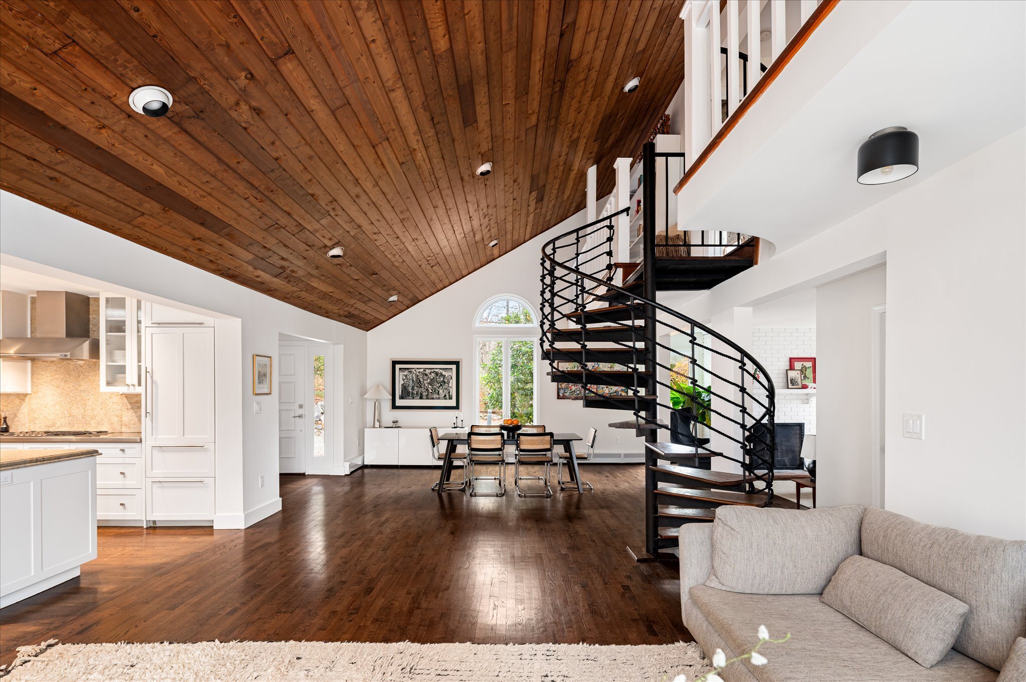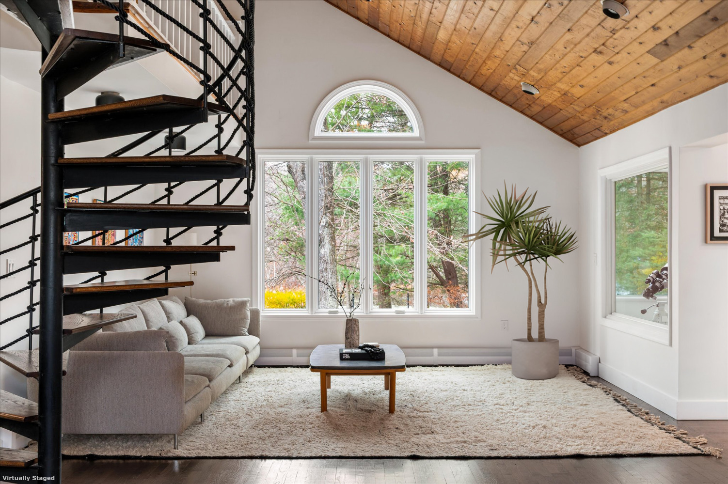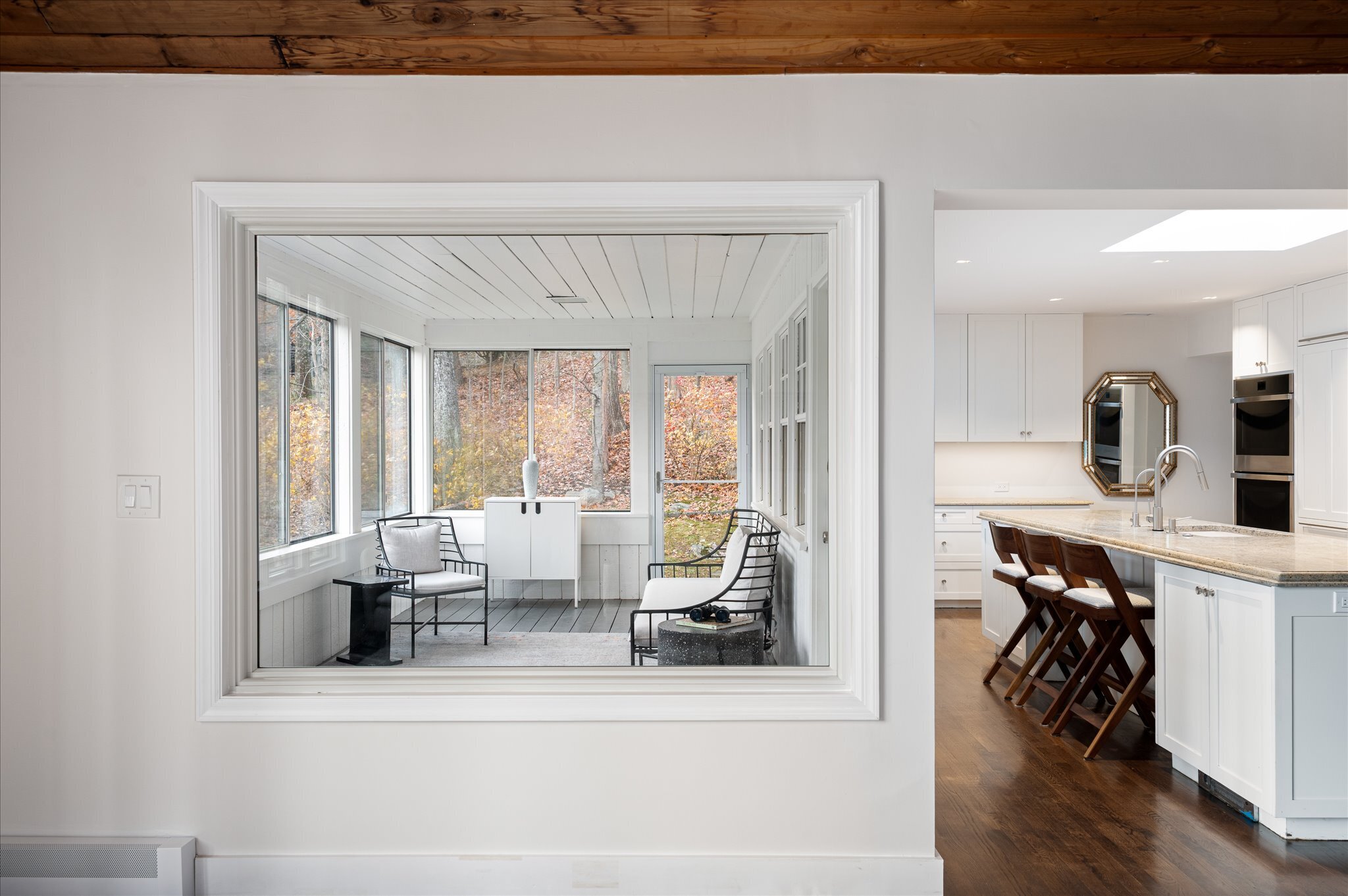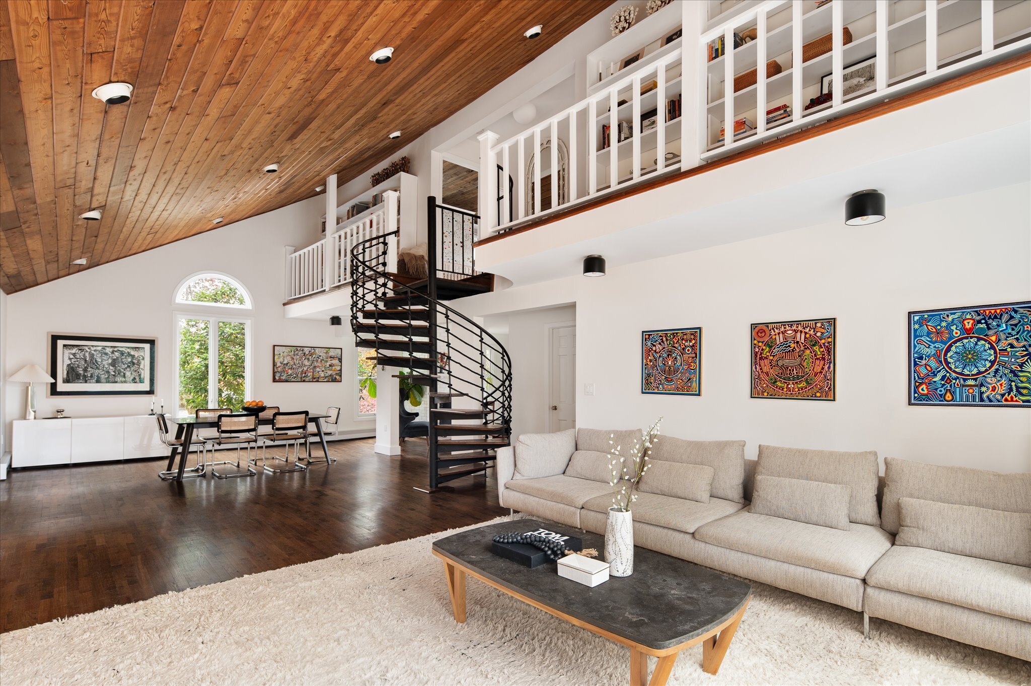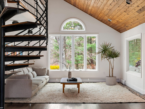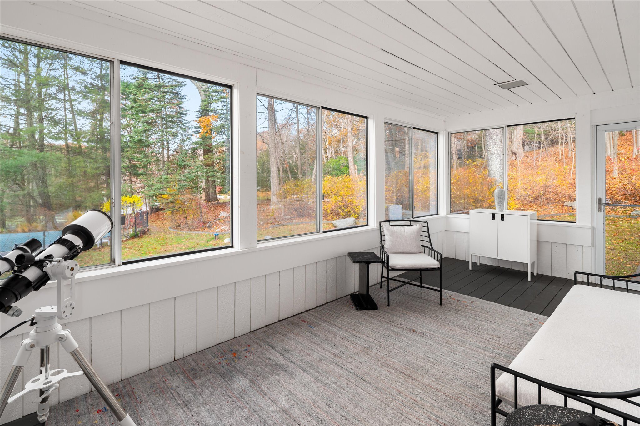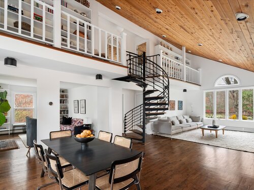 An authentic sun-filled 70's Contemporary in N. Stamford, features soaring wood-slat ceilings and oversized windows that overlook Mayapple Pond and a stunning in-ground pool. Tucked behind a privacy fence, this home has a resort -like setting, and yet is min from N. Stamford shopping, the Merritt Pkwy, and the charming hamlet of Scott's Corners. The open floor plan features a library, living room, dining room, a chef's kitchen with an 11 ft island, an integrated Sub Zero refrigerator and freezer, 2 NEW Bosch dishwashers, Gaggenau cook top, and 2 NEW GE wall ovens. The first floor features an large sun filled ensuite primary bedroom with multiple closets, and a newly updated bathroom. A three season enclosed sunroom overlooks the pond and could be retro-fitted with heat for 4 season enjoyment. The loft, accessed by a dramatic black spiral staircase, features built-in bookshelves and overlooks the main level. Two family bedrooms with "Jack and Jill" bath complete this second level. A 4th bedroom/studio with ensuite bathroom is accessed by a separate staircase-see floor plans. The lower level has a laundry room, full bathroom, gym space, a common area (large enough for a pool table), and a snack/lunch area with direct access to the pool and Mayapple Pond-a perfect recreation space for entertaining family and friends! Over 200K in upgrades including new roof, appliances, and heat/AC mechanicals and new pool equipment.