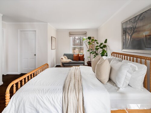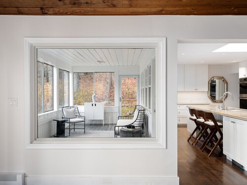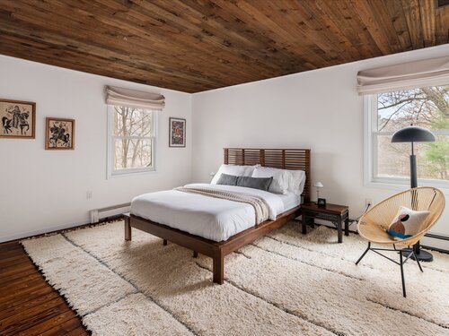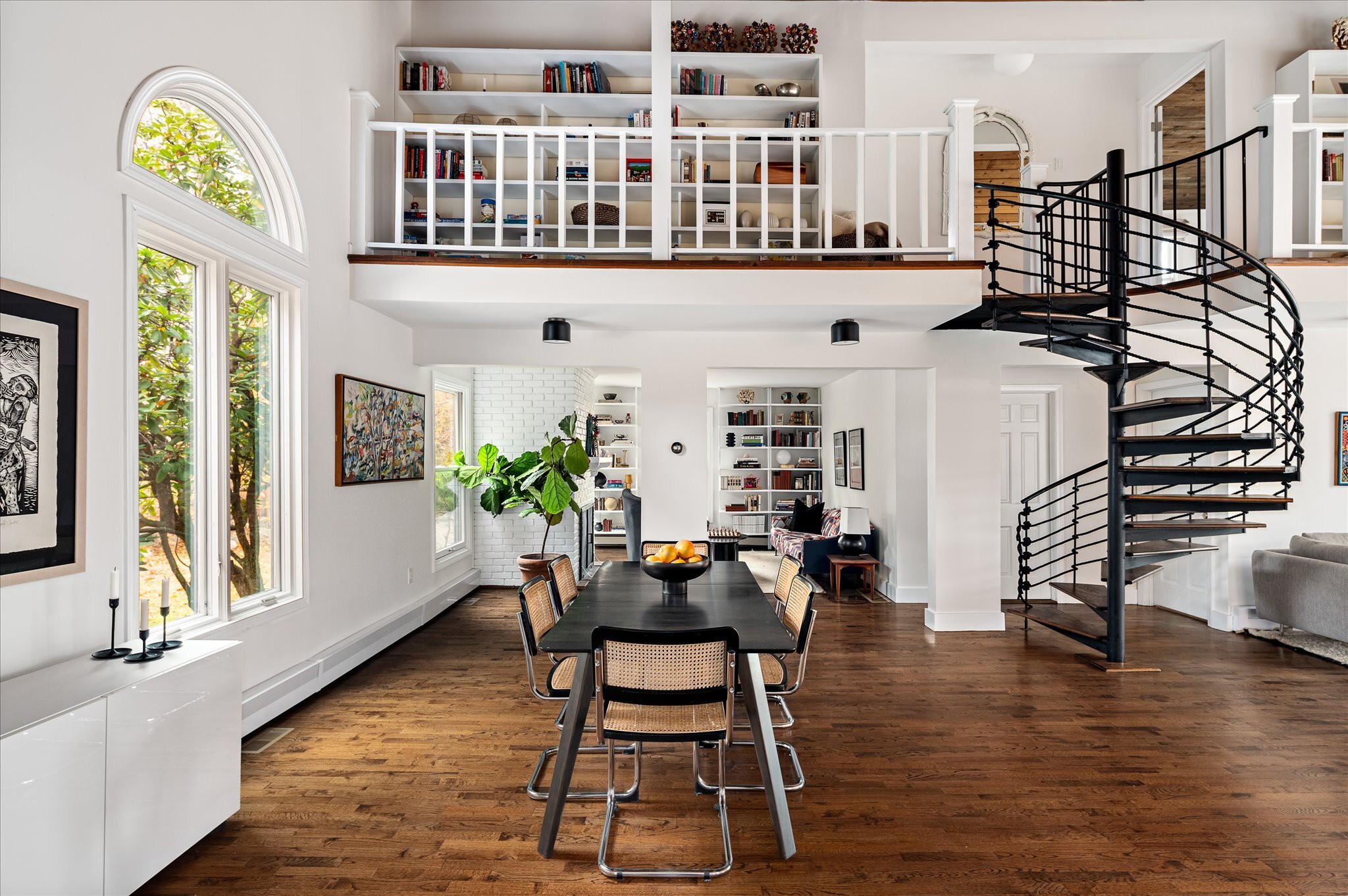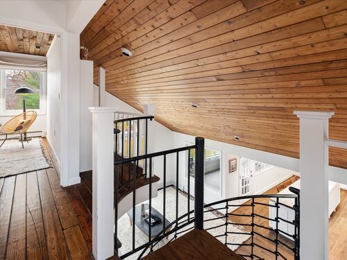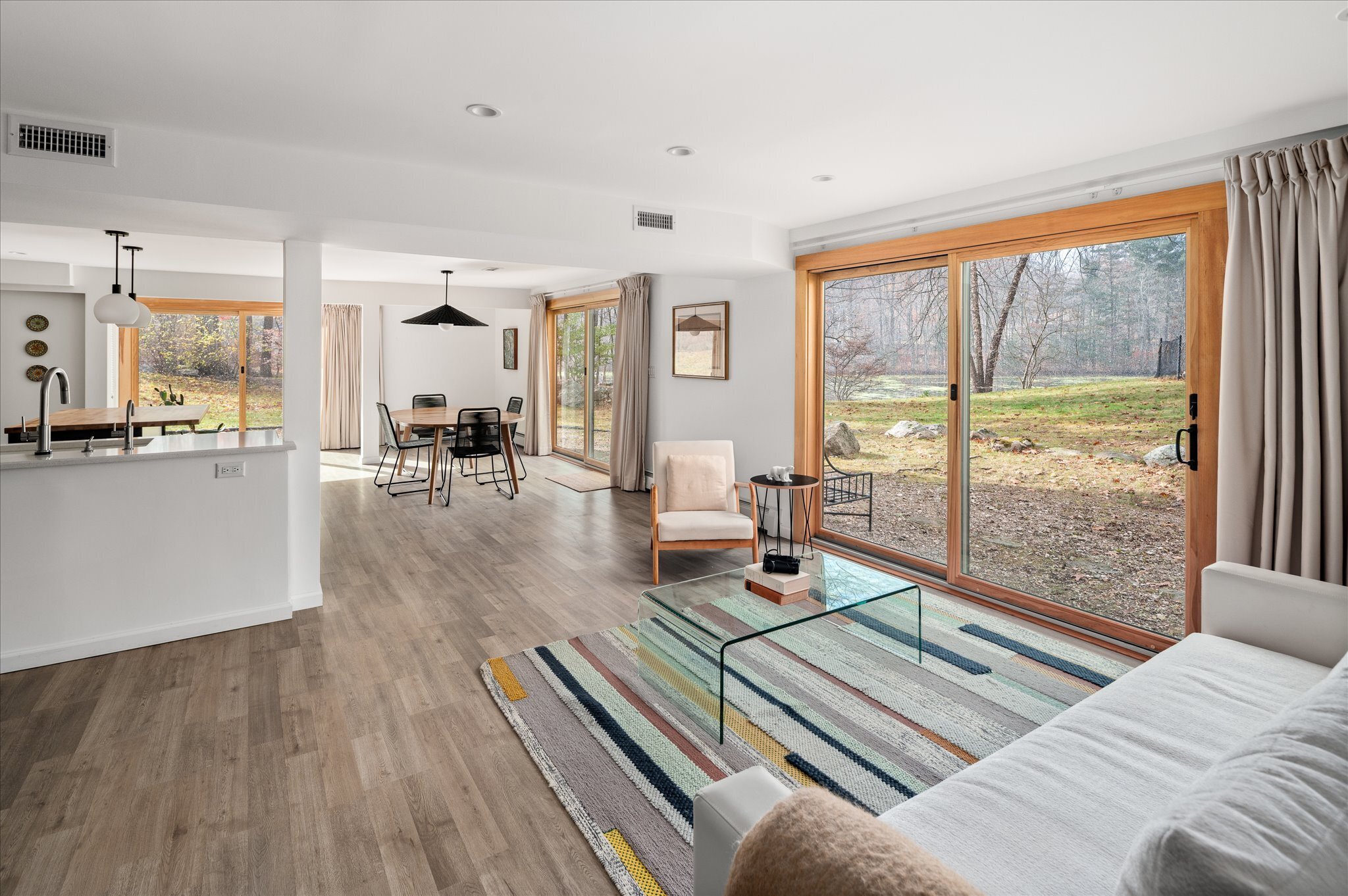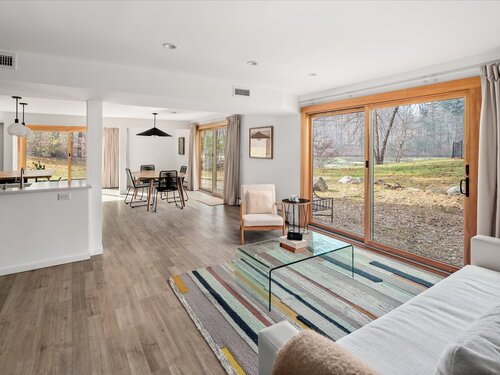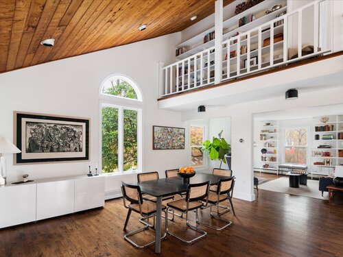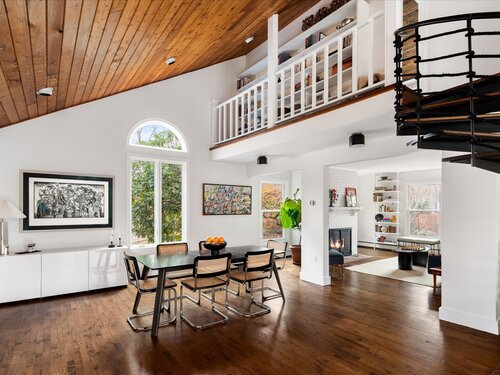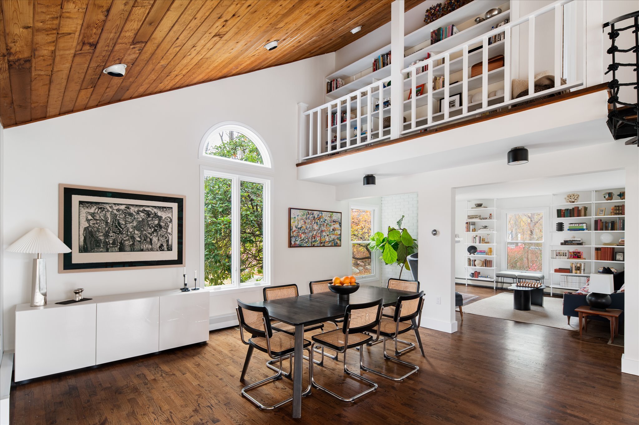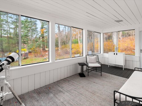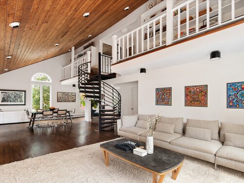 An authentic sun-filled 70's Contemporary in N. Stamford, features soaring wood-slat ceilings and oversized windows that overlook Mayapple Pond and a stunning in-ground pool. Tucked behind a privacy fence, this home has a resort -like setting, and yet is min from N. Stamford shopping, the Merritt Pkwy, and the charming hamlet of Scott's Corners. The open floor plan features a library, living room, dining room, a chef's kitchen with an 11 ft island, an integrated Sub Zero refrigerator and freezer, 2 NEW Bosch dishwashers, Gaggenau cook top, and 2 NEW GE wall ovens. The first floor features an large sun filled ensuite primary bedroom with multiple closets, and a newly updated bathroom. A three season enclosed sunroom overlooks the pond and could be retro-fitted with heat for 4 season enjoyment. The loft, accessed by a dramatic black spiral staircase, features built-in bookshelves and overlooks the main level. Two family bedrooms with "Jack and Jill" bath complete this second level. A 4th bedroom/studio with ensuite bathroom is accessed by a separate staircase-see floor plans. The lower level has a laundry room, full bathroom, gym space, a common area (large enough for a pool table), and a snack/lunch area with direct access to the pool and Mayapple Pond-a perfect recreation space for entertaining family and friends! Over 200K in upgrades including new roof, appliances, and heat/AC mechanicals and new pool equipment.