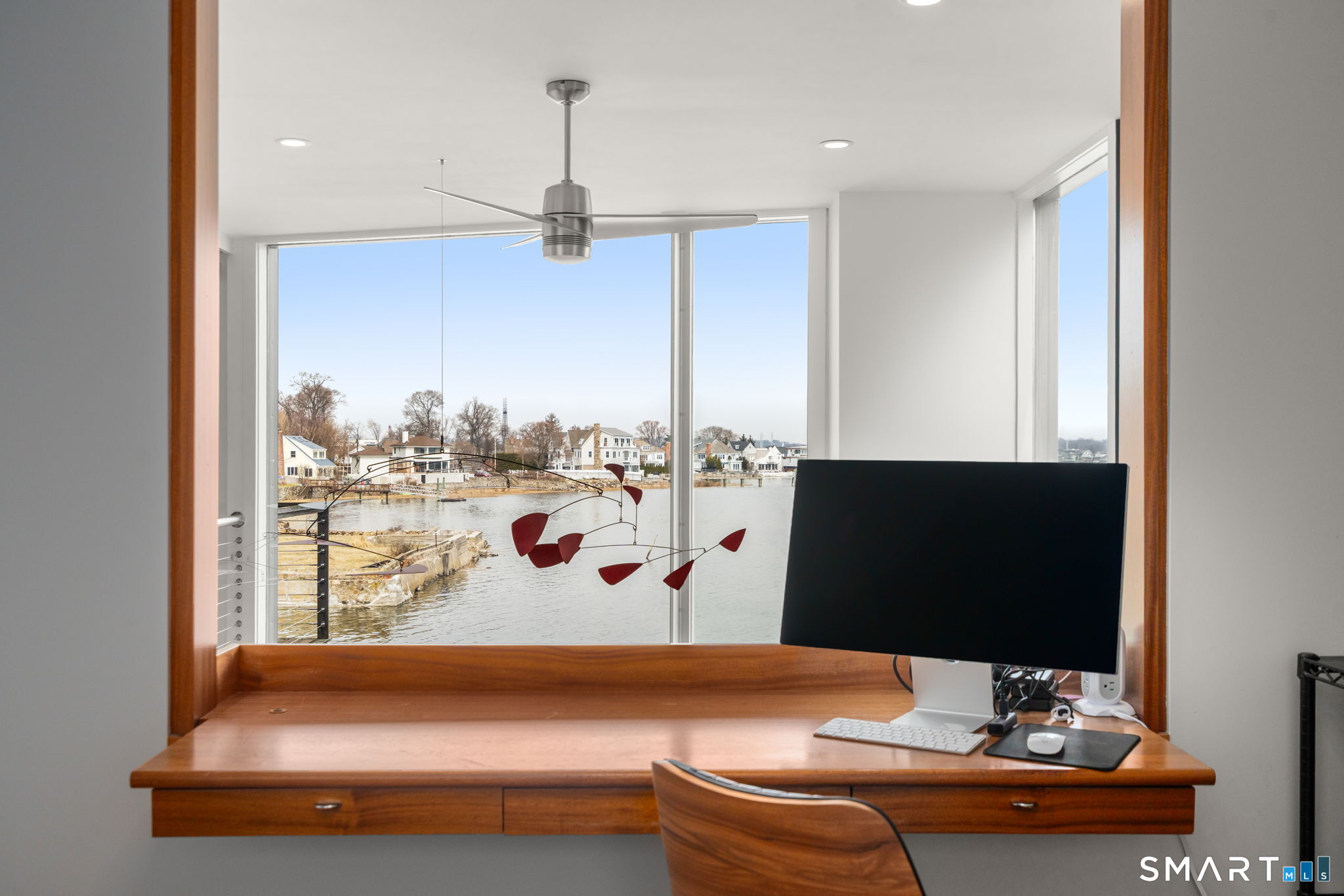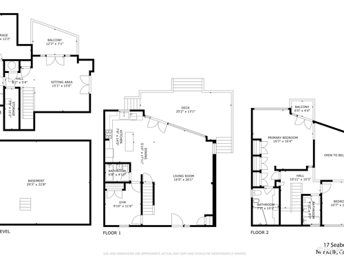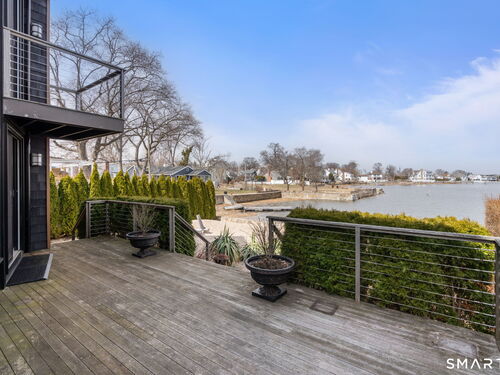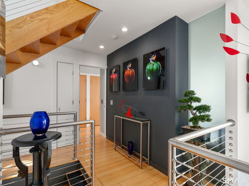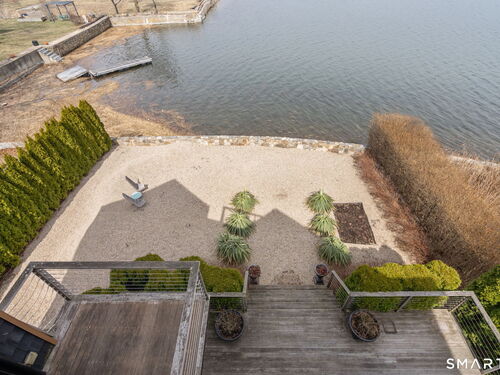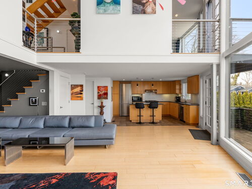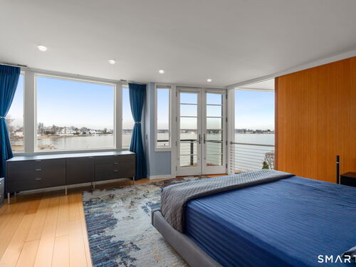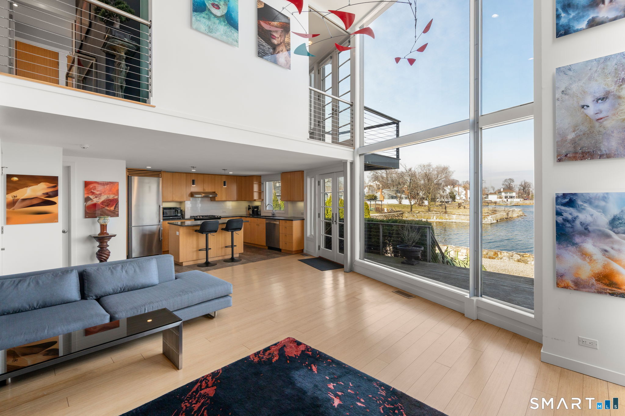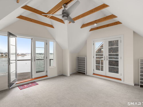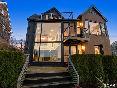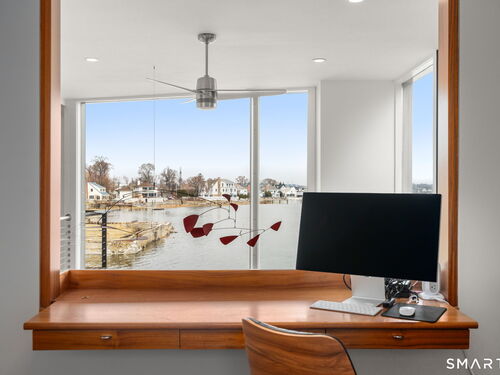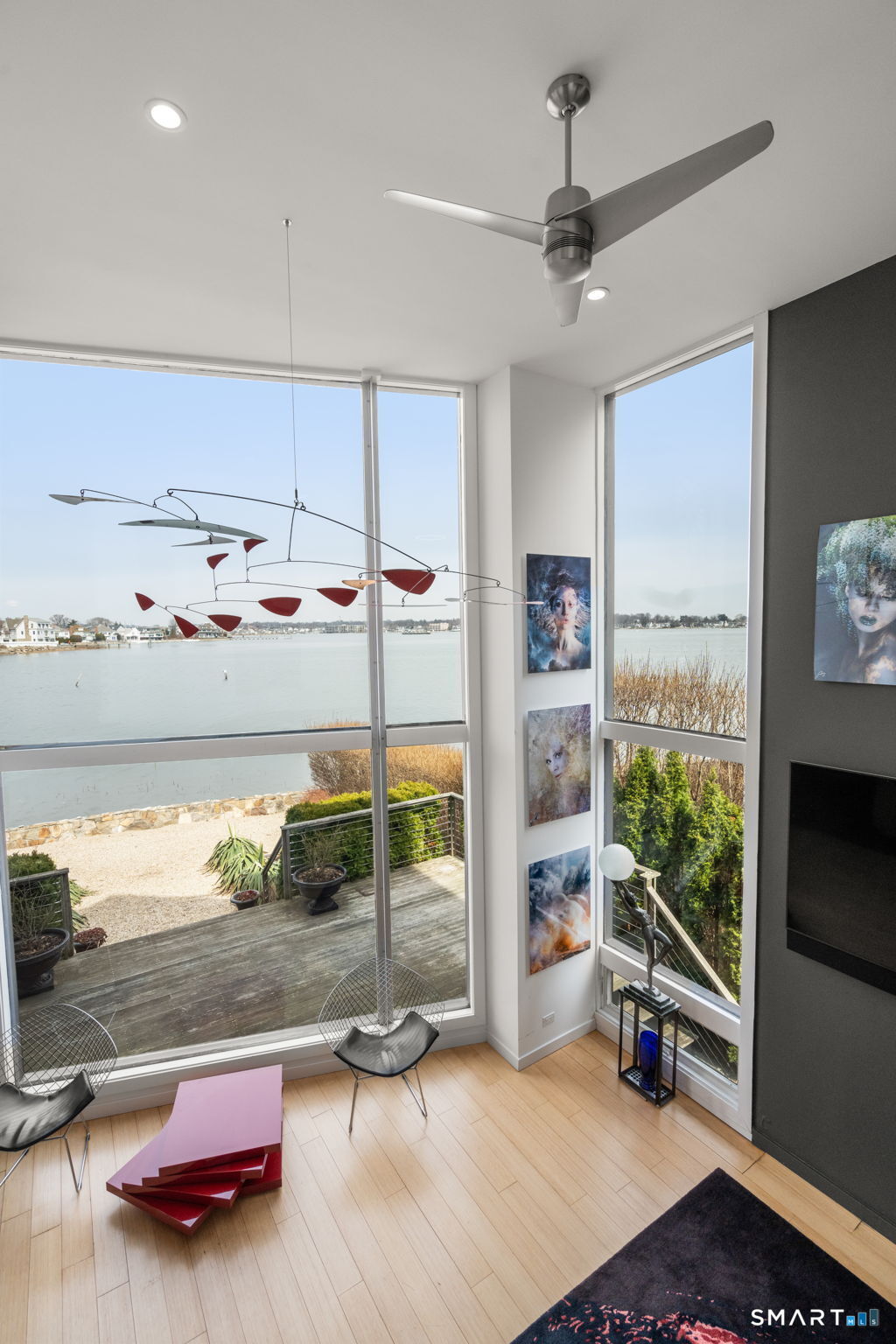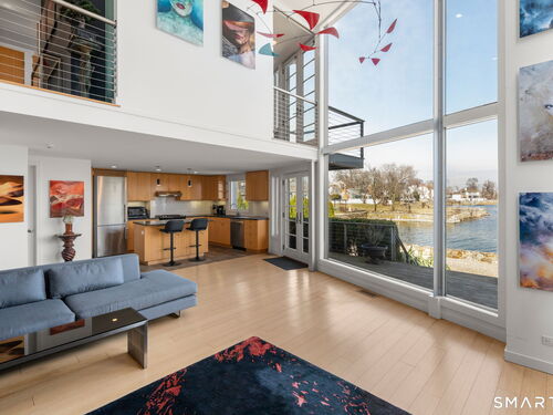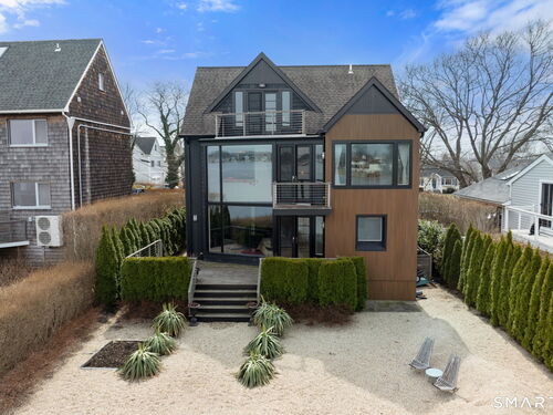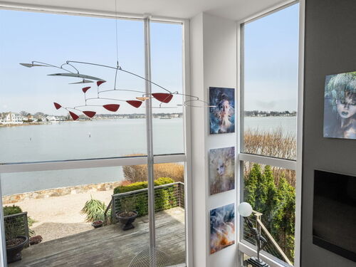 17 Seabreeze Pl "Windswept" is a rare waterfront offering. A thoughtfully designed coastal retreat where architecture and setting come together to create this prized home. The steel-framed construction offers just over 2,000 sq ft across three finished levels. Designed to maximize natural light and panoramic water views, the home features a dramatic 16-foot wall of glass visible from the living room, office, and primary suite. A custom pivot entry door creates a striking first impression, leading into an open living space showcasing bold interior design and subtle nautical-inspired elements, defined by coastal aesthetic metal railings throughout.The flexible floor plan includes a main-level bedroom with access to a full bath. The second floor offers a primary suite with en-suite bath, private balcony, and a custom sliding wall system allowing for privacy or expanded sightlines. An additional room functions as a home office or bedroom with a full bath nearby. The third floor, accessed via a floating staircase, features a vaulted studio room with built-ins, a full bath, and private deck with expansive water views, ideal for relaxing or entertaining. Exterior upgrades include new composite siding, awning, and professionally designed landscaping with drip irrigation. Owned solar panels help offset rising electricity costs. Enjoy nearby Baxter Park, a city-maintained, dog-friendly waterfront park with seating, small kyak launch, a cherished amenity of the Harbor Shores community