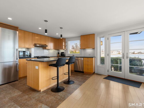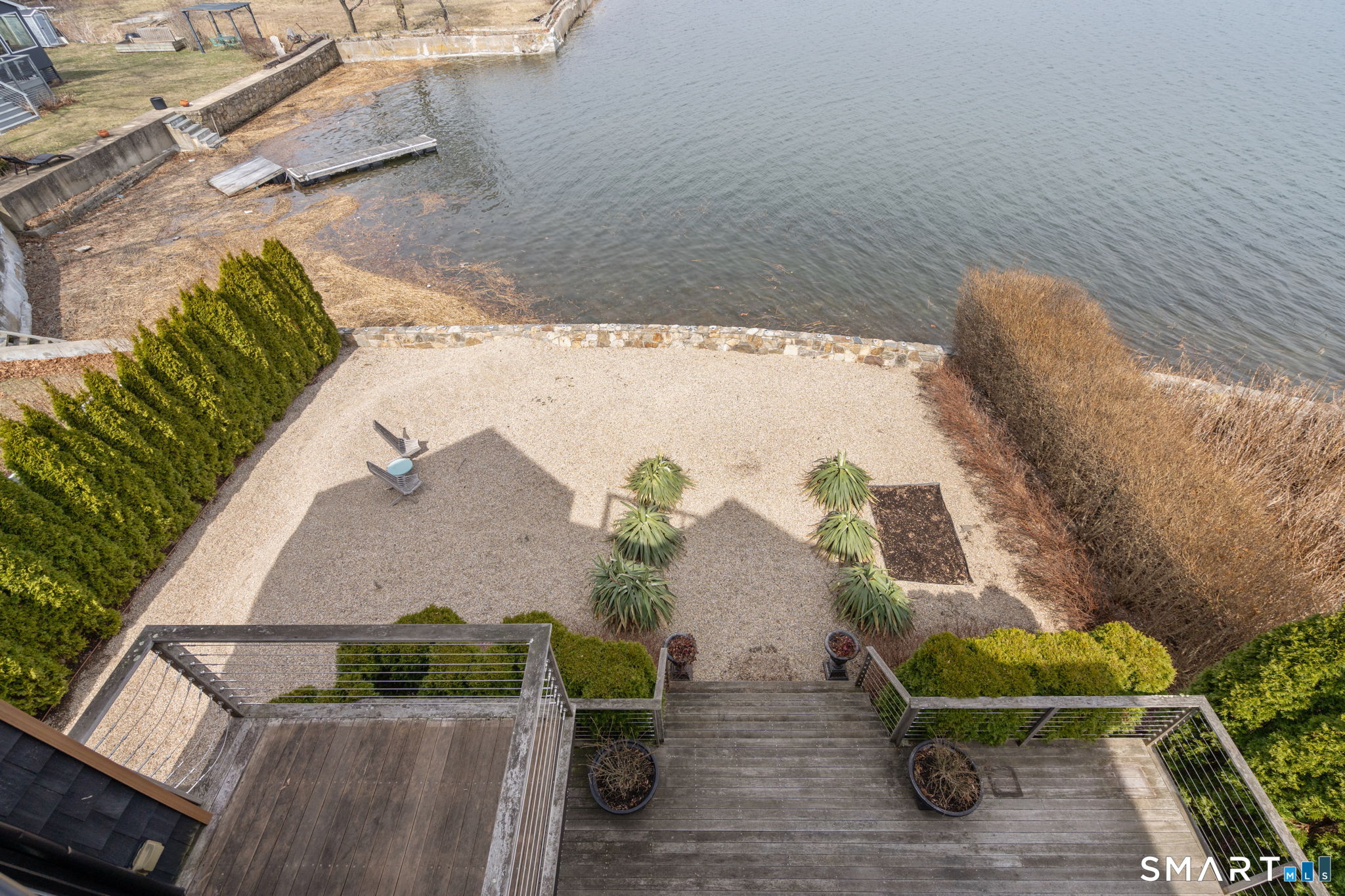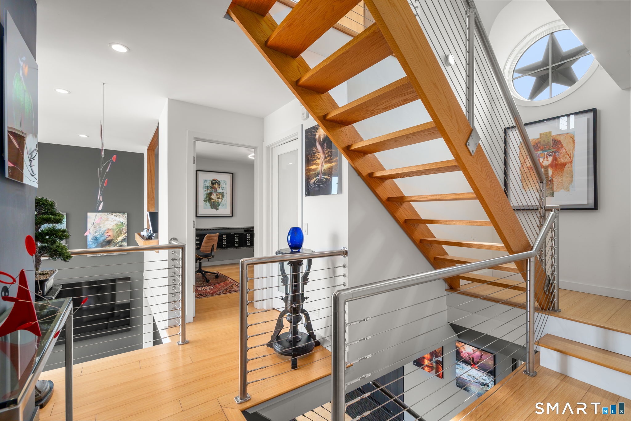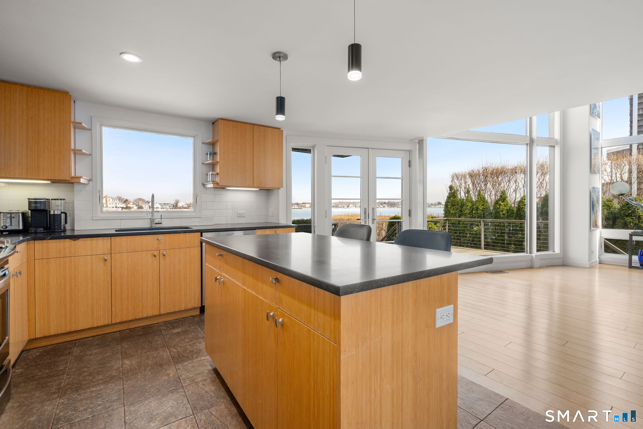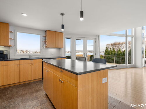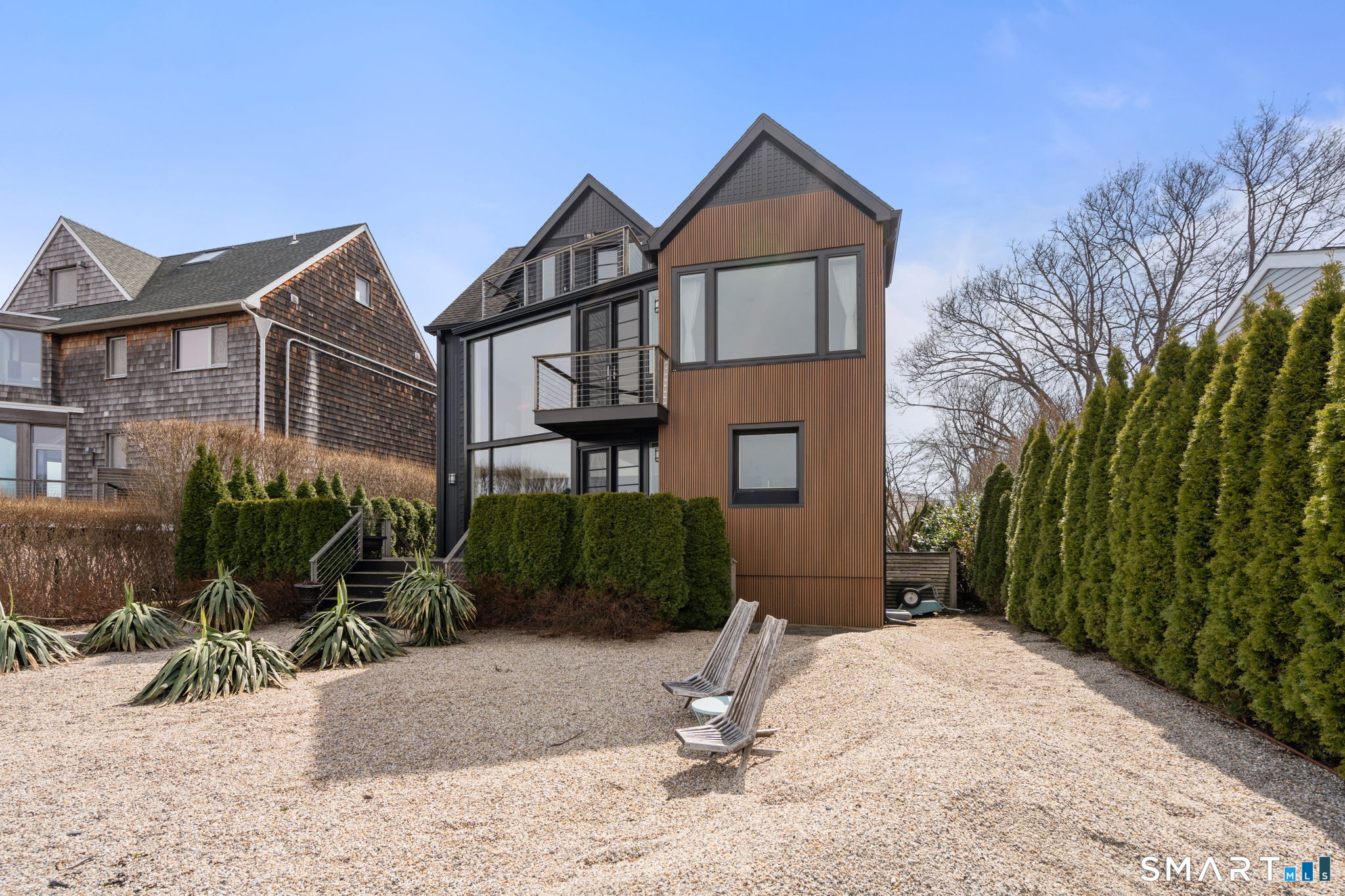 17 Seabreeze Pl "Windswept" is a rare waterfront offering. A thoughtfully designed coastal retreat where architecture and setting come together to create this prized home. The steel-framed construction offers just over 2,000 sq ft across three finished levels. Designed to maximize natural light and panoramic water views, the home features a dramatic 16-foot wall of glass visible from the living room, office, and primary suite. A custom pivot entry door creates a striking first impression, leading into an open living space showcasing bold interior design and subtle nautical-inspired elements, defined by coastal aesthetic metal railings throughout.The flexible floor plan includes a main-level bedroom with access to a full bath. The second floor offers a primary suite with en-suite bath, private balcony, and a custom sliding wall system allowing for privacy or expanded sightlines. An additional room functions as a home office or bedroom with a full bath nearby. The third floor, accessed via a floating staircase, features a vaulted studio room with built-ins, a full bath, and private deck with expansive water views, ideal for relaxing or entertaining. Exterior upgrades include new composite siding, awning, and professionally designed landscaping with drip irrigation. Owned solar panels help offset rising electricity costs. Enjoy nearby Baxter Park, a city-maintained, dog-friendly waterfront park with seating, small kyak launch, a cherished amenity of the Harbor Shores community