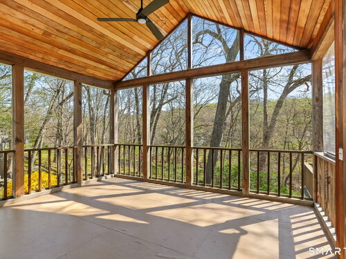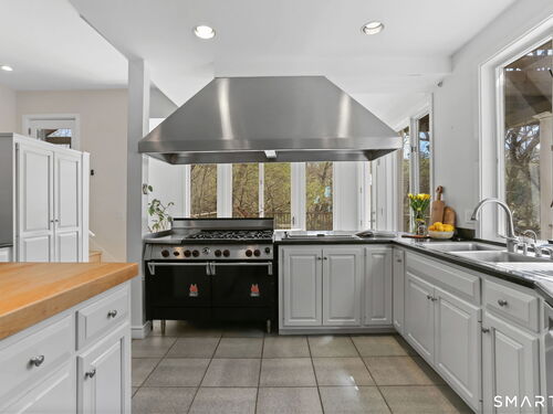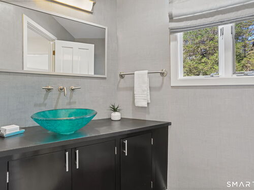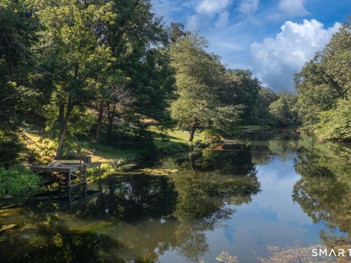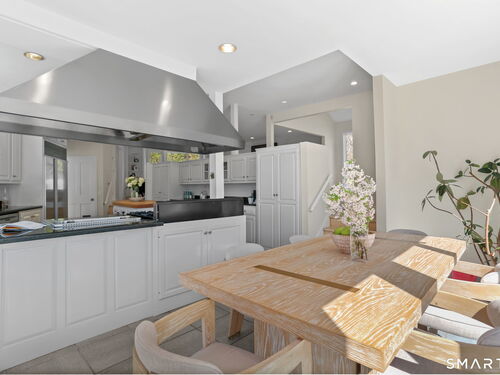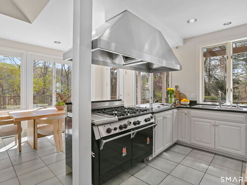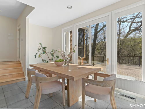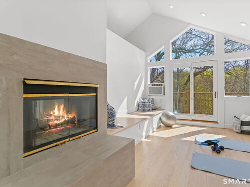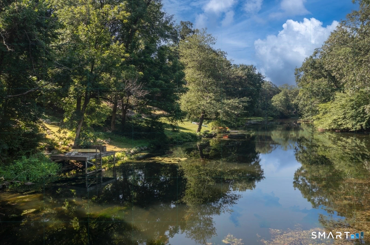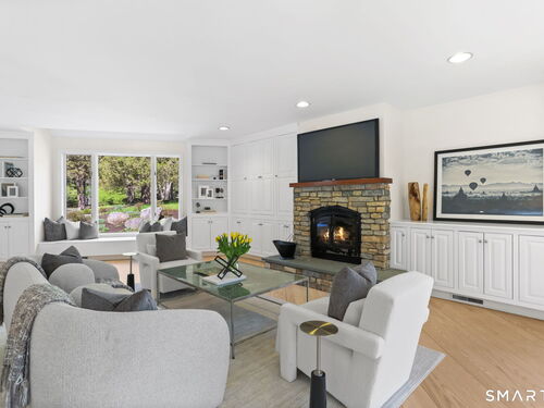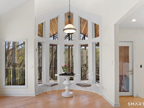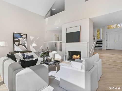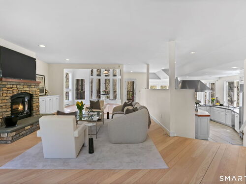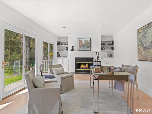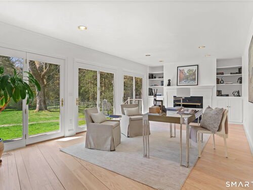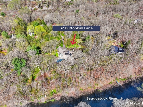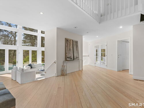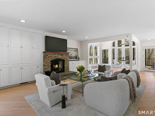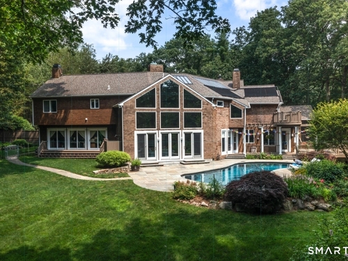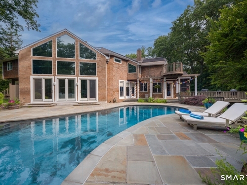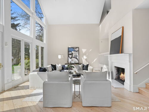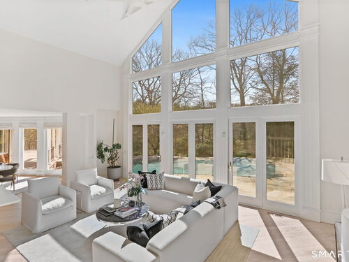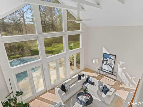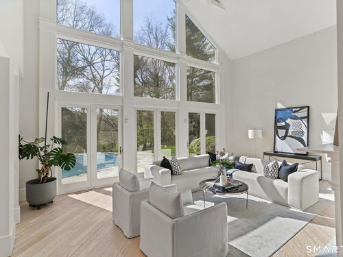 A four-season retreat-where open lawns, a beautiful pool, and the surrounding landscape create a sense of quiet luxury. Set along the Saugatuck River on a quiet private Lower Weston Cul de Sac, this architecturally distinctive contemporary is privately sited on 2.49 acres, offering scale, light, and direct river access in one of Weston's most desirable settings. Please ask Broker about possible rental options. A soaring cathedral ceiling Great Room anchors the home, defined by dramatic vertical volume, expansive glass, and extraordinary natural light. A central fireplace adds warmth and balance to the openness, creating a space equally suited for entertaining or quiet evenings at home. The kitchen is thoughtfully positioned at the heart of daily living, opening seamlessly to the family room with fireplace. French doors lead directly to the deck, Gunite pool, and BBQ terraces, creating effortless indoor outdoor flow and making summer gatherings and everyday living feel connected to the landscape. A striking three season porch with cathedral ceilings extends the architectural expression and provides a serene transitional space overlooking the natural surroundings.