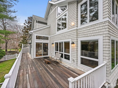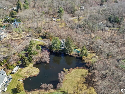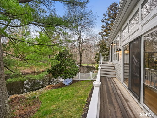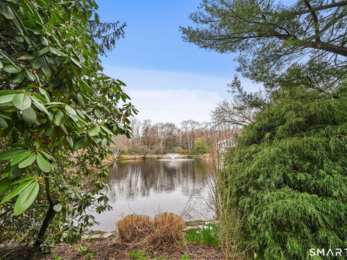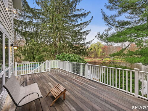 Completely rebuilt from the studs in 2008, this one-of-a-kind Contemporary blends sleek modern design with classic New England exterior charm. Set on 3+ private acres, the home was designed to capture beautiful views from every room, with walls of windows creating a bright, open, and airy feel throughout. The main living space features soaring cathedral ceilings and dramatic two-story windows with water views. A chef's kitchen with expansive island, Viking double ovens, and a sunlit breakfast room surrounded by windows overlooks your own waterfall. The layout flows seamlessly from a formal dining room to spacious living areas and out to wraparound decks, ideal for everyday living and entertaining. Outside, enjoy a resort-style setting with a heated gunite pool, spa, and tranquil natural surroundings. Three private bedroom suites include two updated baths, while the primary suite features vaulted ceilings, a sitting area, and serene pond views. Custom storage maximizes functionality throughout. Ideally located just 2 miles from the Merritt Parkway and LaRocca's Market, and within walking distance to Chestnut Hill Park, this property delivers superior construction, privacy and a lifestyle that you will love.