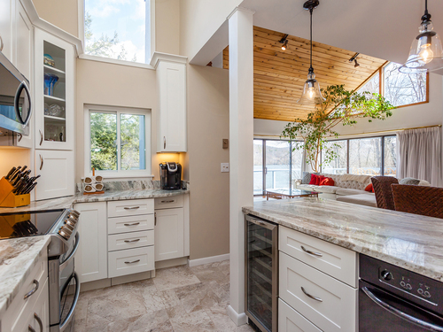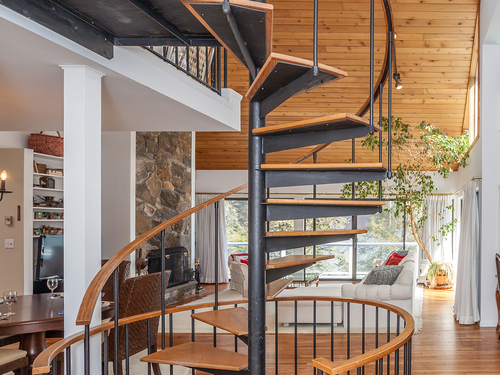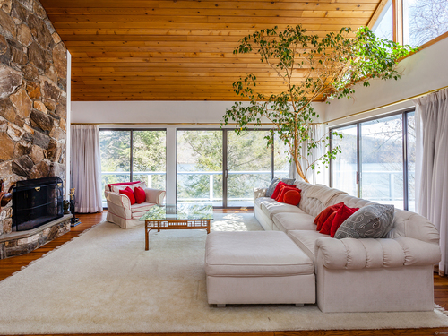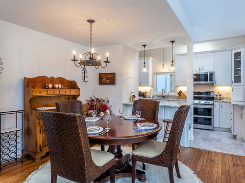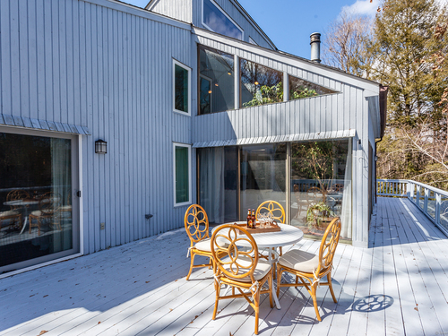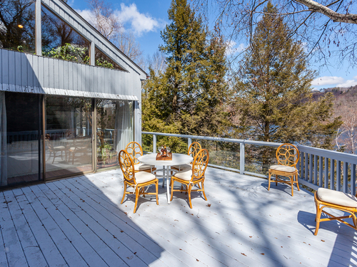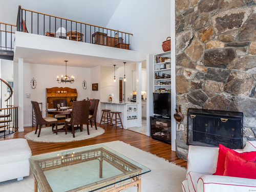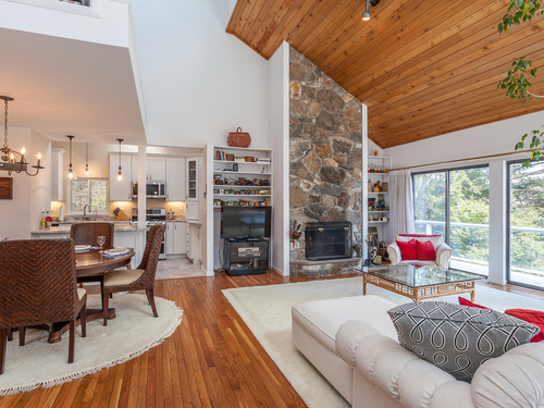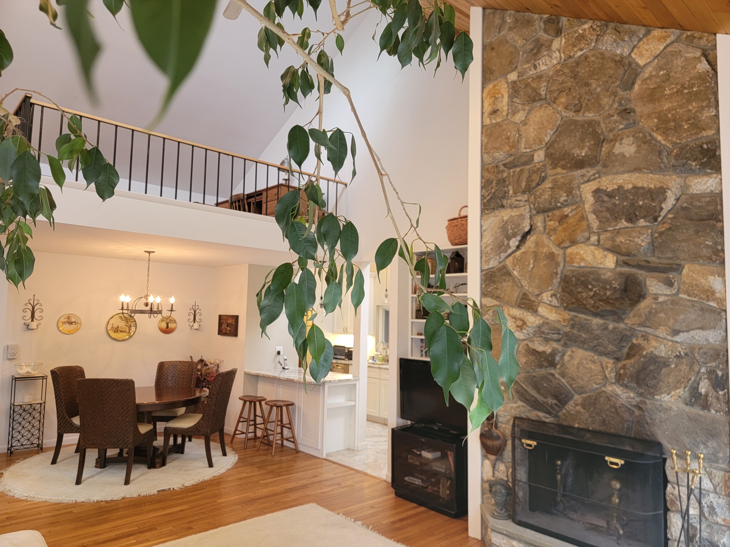 Cathedral Ceiling, Balcony/Deck, Dining Area, Fireplace, Sliders, Hardwood Floor