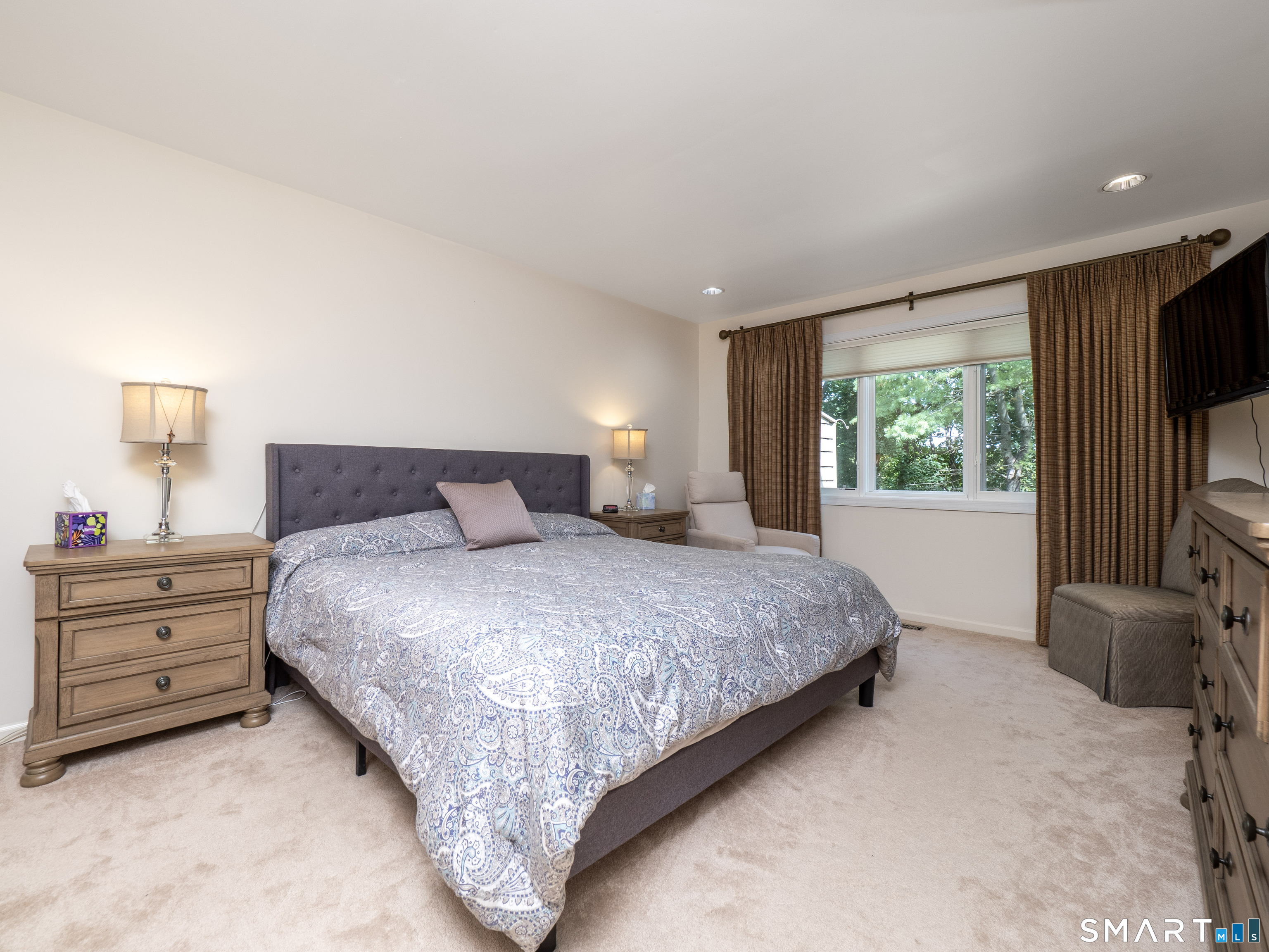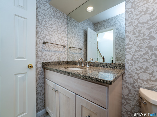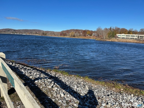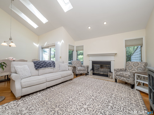 Welcome to this sun-drenched Lake Place residence, one of the largest and most desirable models in the community. An open floor plan with vaulted ceilings, abundant skylights, and a first-floor primary bedroom set the stage for effortless living. The spacious primary suite features a full bath and offers the convenience of main-level living. The dining room opens to a large deck overlooking a serene wooded setting-perfect for entertaining or unwinding outdoors. The living room is warm and inviting with vaulted ceilings, a skylight, and a wood-burning fireplace. The kitchen offers stainless steel appliances, granite countertops, a charming eat-in area, and an open flow into the dining room. Just a few easy steps from the kitchen lead to the freshly painted two-car garage, complete with new taping and move-in-ready condition. The second floor includes two additional bedrooms and a full bath, with an open balcony overlooking the living and dining areas below. The lower level provides a den or home office, along with an unfinished space featuring sliders to a private patio-ready for your imagination. Enjoy Lake Place living with amenities including a community pool, clubhouse, lake access, tennis, and more. Ideally located just minutes to Danbury Mall, Whole Foods, Trader Joe's, schools, and commuting routes. Don't miss this special opportunity.