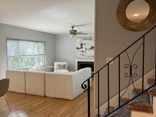 Balcony/Deck, Ceiling Fan, Dining Area, Fireplace, Sliders, Hardwood Floor