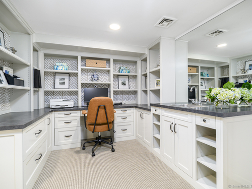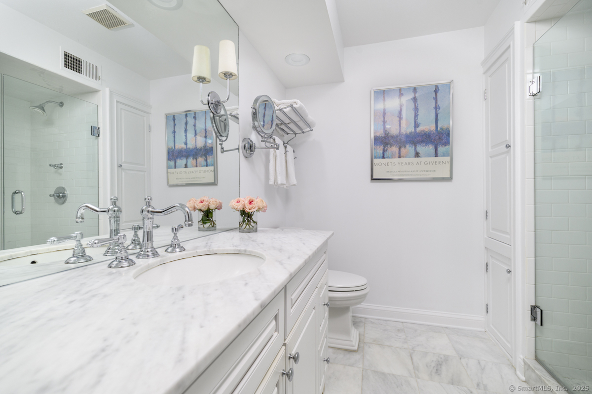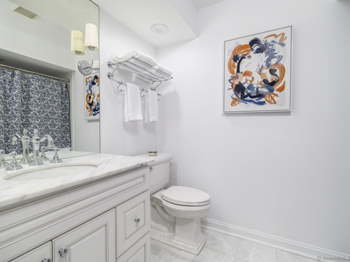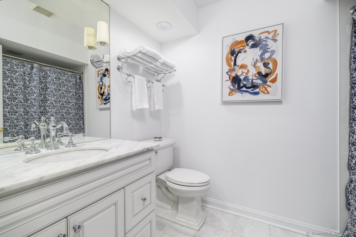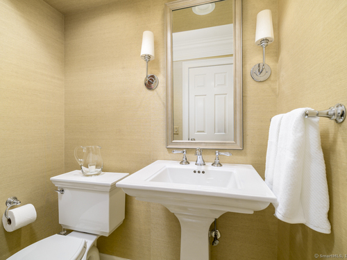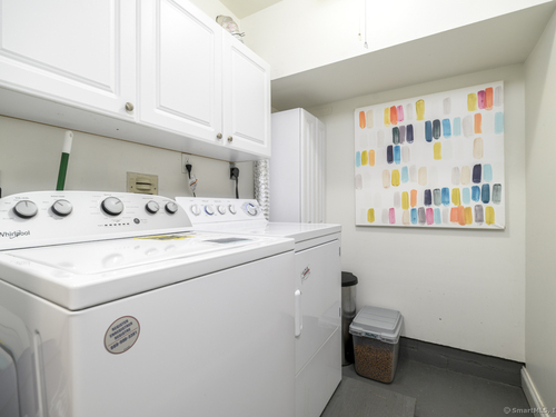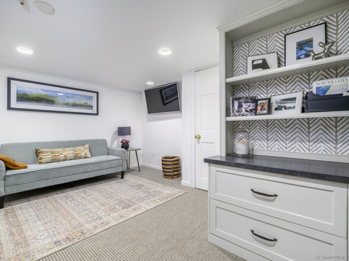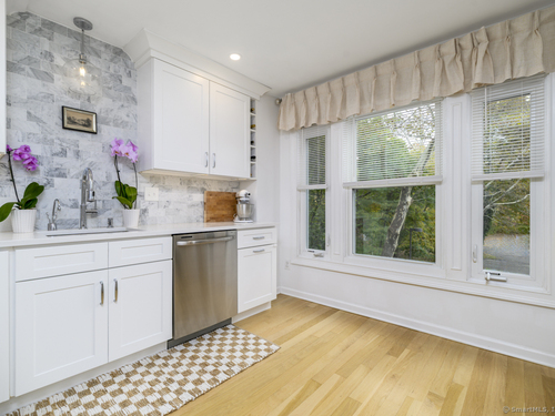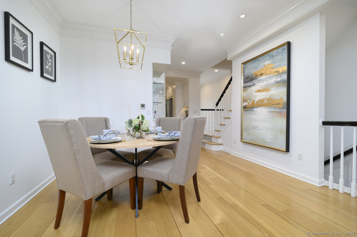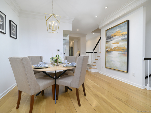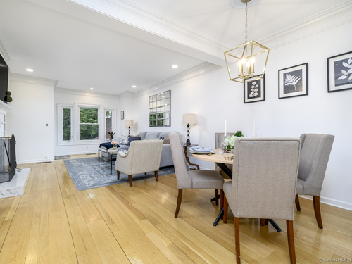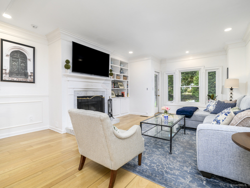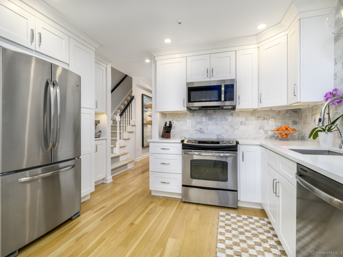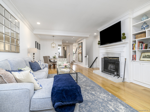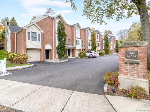 Walk to town or train from this elegant and fresh brownstone-style townhome in Darien. Enjoy three levels of living space with a clean, contemporary flair. Main floor features a sleek eat-in kitchen renovated in 2020 with hardwood floors, marble backsplash and new countertops. Also on the main level is a spacious and bright living/dining area with a fireplace, custom bookshelves, handsome moldings, upgraded lighting as well as a chic powder room. Additional living space is available outside on a private terrace off the living room. Upper level has two spacious bedrooms bathed in light with architectural windows and cathedral ceilings. Both bedrooms have en suite bathrooms updated with classic fixtures and finishes. Lower level includes laundry and additional finished space with a custom office niche and a wet bar that is suitable for work-from-home, play room or additional guest quarters. You'll love the convenience and sophistication that Pine Brook offers in the heart of Darien. This 20-unit complex is professionally managed and well-maintained with reasonable common charges. Recent capital improvements include roof replacement less than four years ago and driveway repaving in the past year. There are no outstanding assessments for these projects. Agent related to owner. Rentals: Complex allows 4 leased units at one time; currently no open slots for new rentals. Surveillance: Ring door bell/camera does not work; nanny cam in crib area may be ON.