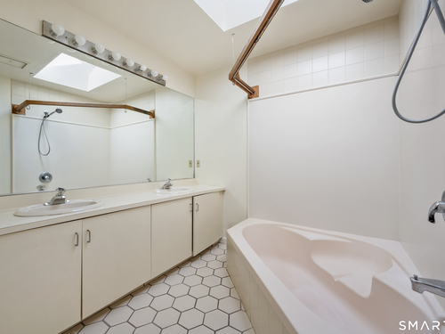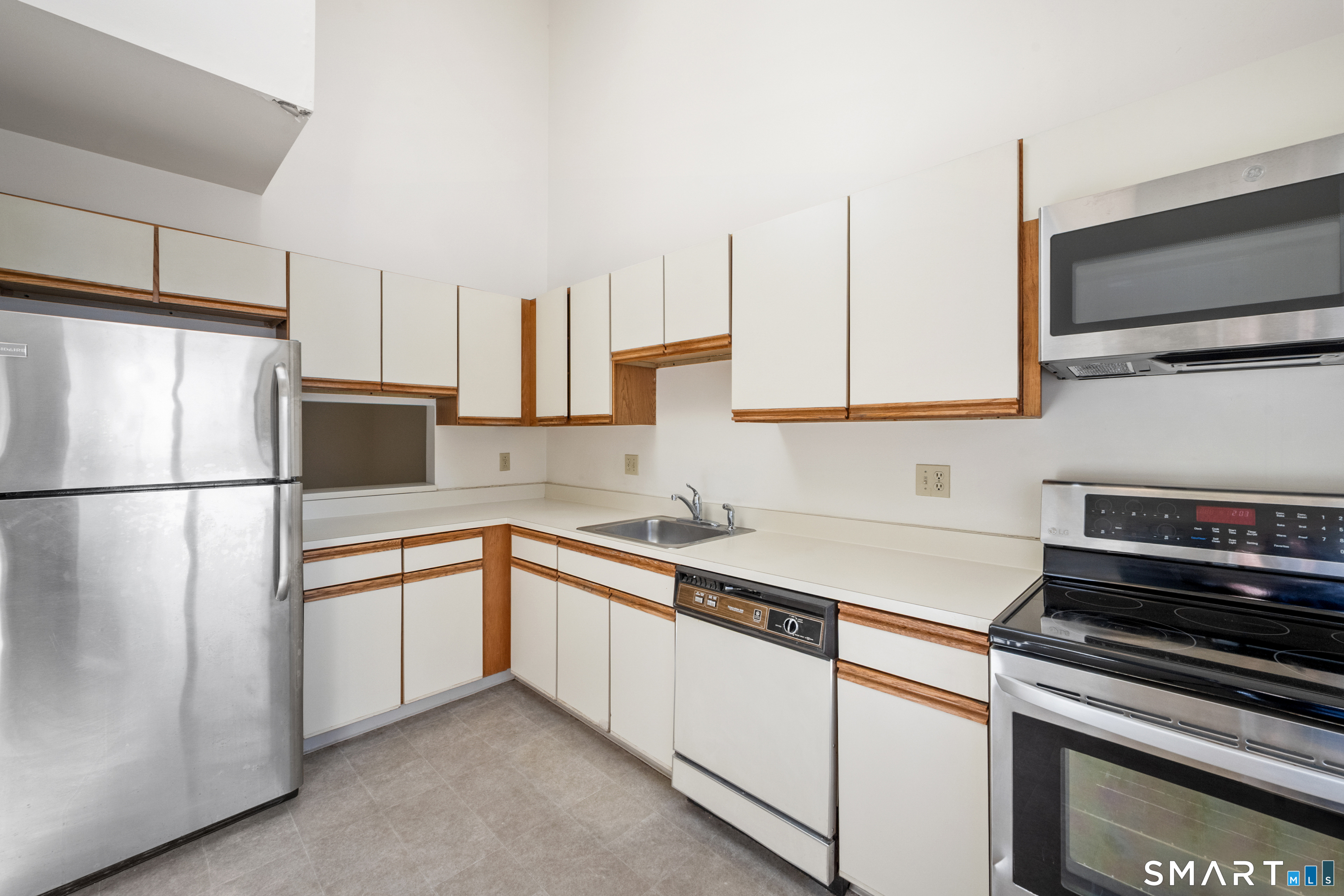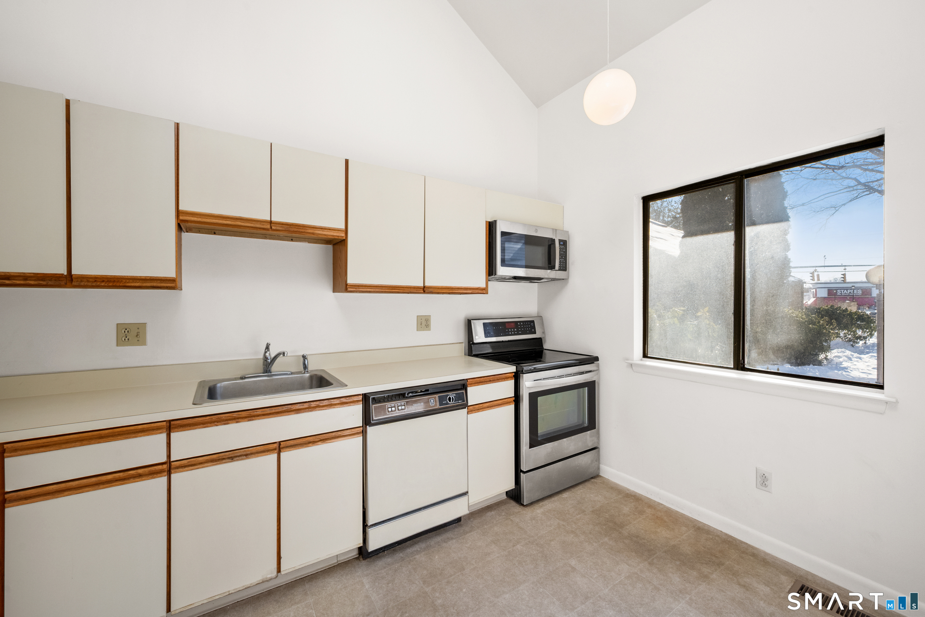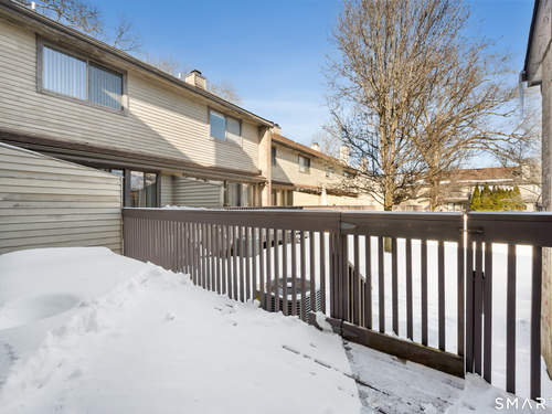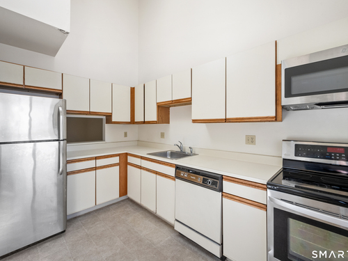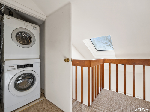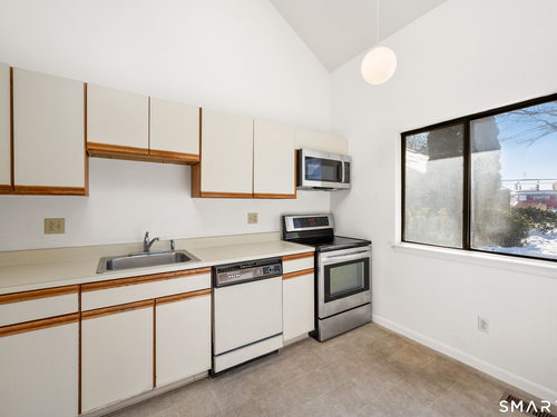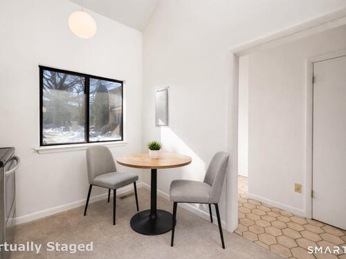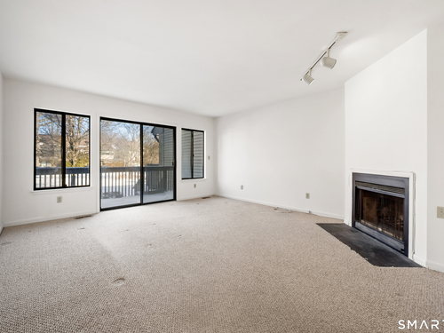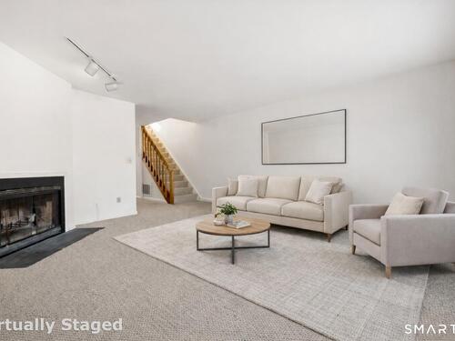 Enjoy gated community living in the heart of Stamford. This 1-bedroom, 1.5-bath townhouse in The Chesterfield. The main level includes a kitchen with an eat in kitchen, cathedral ceilings with a skylight, and a living room featuring a wood-burning fireplace and sliders to a deck-perfect for entertaining-plus a separate dining area and convenient half bath. Upstairs, you'll find a spacious bedroom with generous closets and storage, along with a full bath offering a soaking tub and double vanity. Additional perks include an in-unit washer/dryer, new HVAC, and flexible extra space ideal for guests or a home office. This gated community offers two pools and 24-hour security, with unbeatable access to shopping, transit, I-95, the Merritt Parkway, and downtown Stamford-schedule your private showing before it's gone.