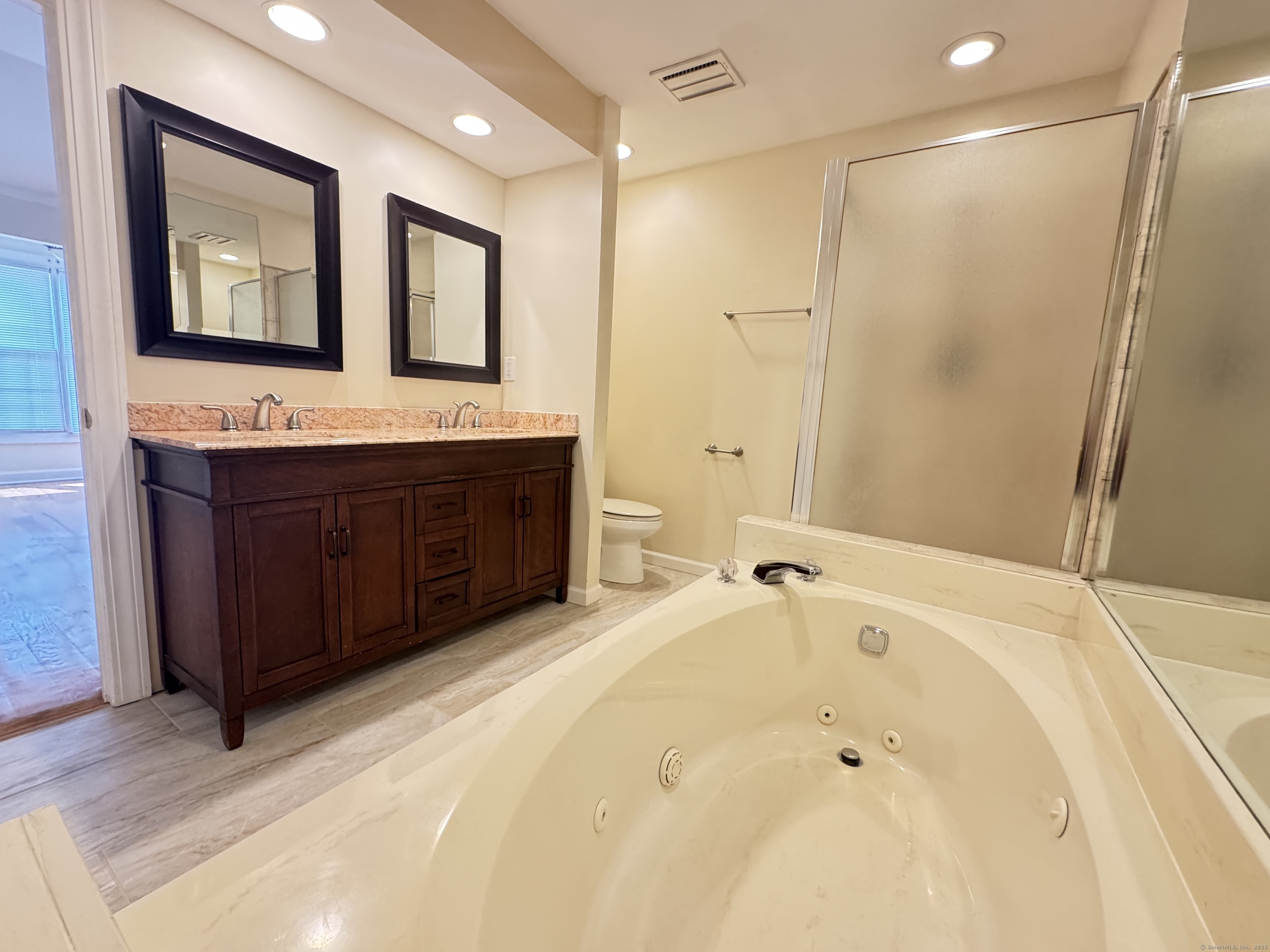 Stunning & spacious 2 bed, 2.5 bath townhome with attached garage featuring gleaming hardwood flooring throughout main/upper levels and painted throughout unit. EIK with granite countertops, stainless steel appliances, and center island. Open concept dining room and living room with gas fireplace and double french doors leading to a spacious private deck. Both bedrooms have en suite bathrooms and double closets.The primary bedroom includes a storage closet and the bathroom has double sinks, a soaking tub and a separate shower. Family room and laundry are located on the lower level with garage access & newly installed W/W carpeting. HOA amenities include pool and tennis court. Minutes from Fairfield line, Sacred Heart University. and Merritt Parkway. *Agents see Agent Remarks*