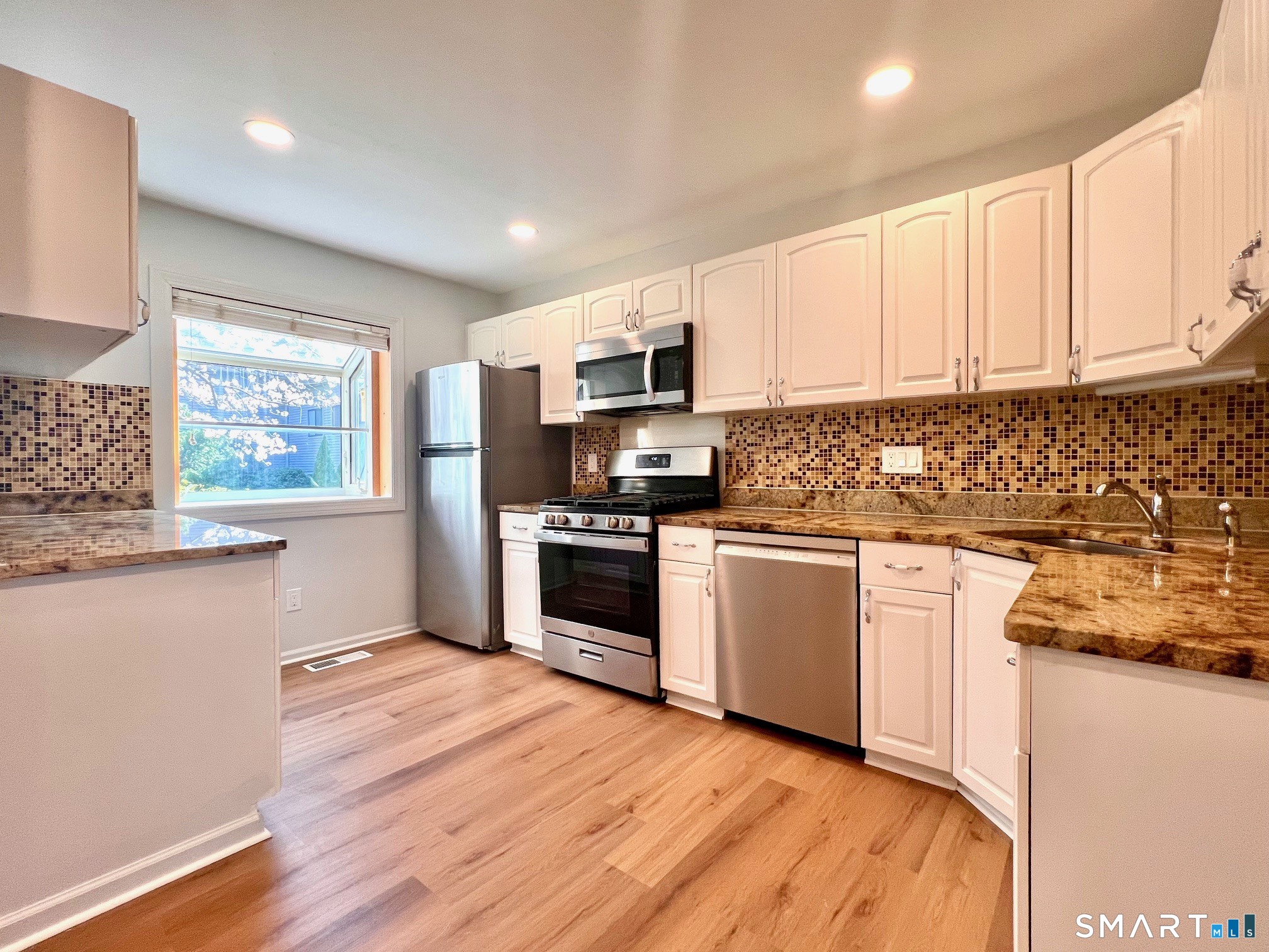 2 or 3 Bedroom End Unit and quiet location in a Stamford's best private and sought after community living ! Mid city and walk to houses of worship. Bright and Airy 4 level home. Amazing location! Large living room and dining / living room areas, with sliders to private patio that opens to a large backyard! Cozy up with Fireplace! Eat in Kitchen area + bay window in kitchen. High ceilings w/ Recessed lights. Set within 19 acres featuring beautifully manicured grounds, away from the road. Bright with natural light pouring in with large windows + skylight. 3rd floor room with doors that can be a lovely 3rd bedroom, with full closet + storage! Secret room in one of the bedrooms that can be an additional playroom / office / study or flex space. Hardwood floors throughout the home + finished basement for added space. Sliders to Oversized deck off of Primary bedroom suite + 2nd bedroom!! Community is centrally located, with Club House and In-ground swimming pool. Highest and Best by 11am on Tuesday April 21st