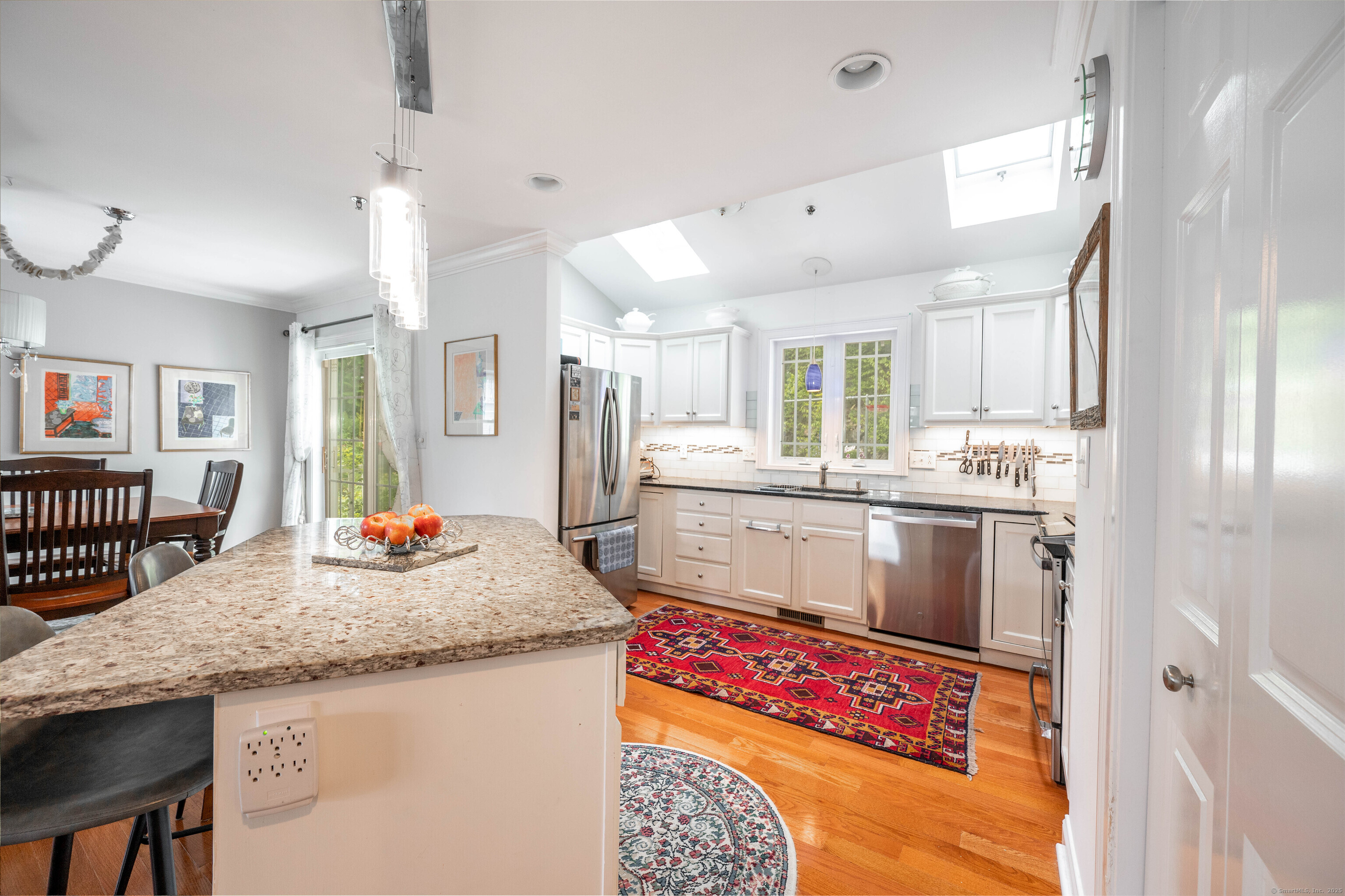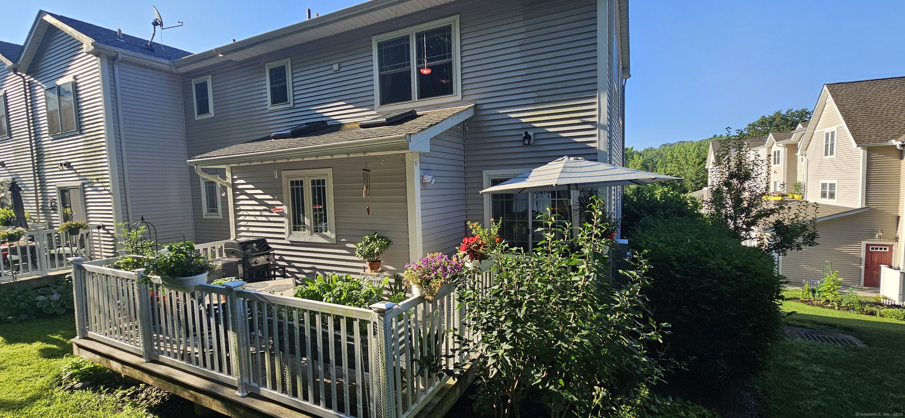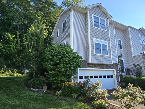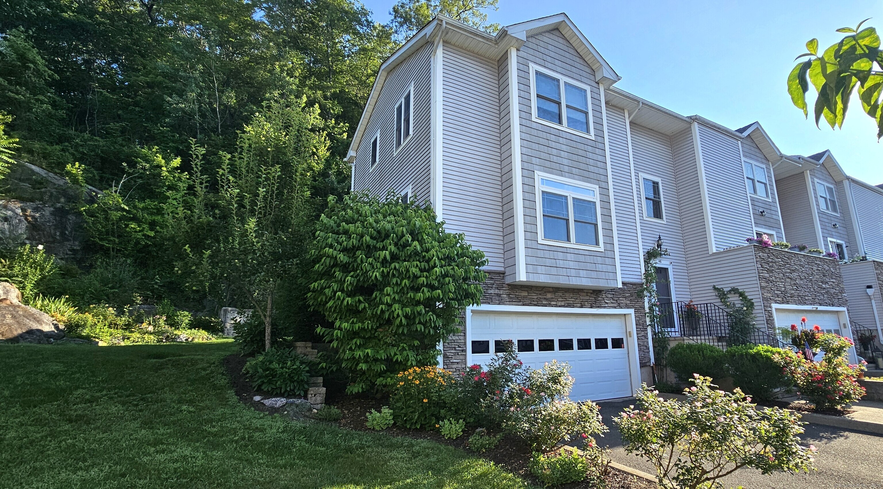 Stylish and spacious END UNIT townhome with 2-car garage is bathed in natural light and nestled in one of Stetson Place's preferred locations. This home offers the perfect blend of comfort, versatility, and charm. The open floor plan on the main level features windows on three sides, a cozy fireplace, and sliders to a large deck - ideal for summer evenings or morning coffee. Upgrades include: Crown molding, and hardwood floors throughout. The kitchen is a great gathering spot, complete with ample cabinetry, skylights and a large center island with a breakfast bar. Upstairs, the private primary suite is accompanied by a 2nd bedroom with a custom walk-in closet and laundry room. The lower level includes a practical mudroom entry with a cedar closet tucked under the stairs, ideal for storing seasonal gear, shoes, or everyday essentials. Stetson Place amenities include a clubhouse, fitness center, and outdoor pool. Grounds are professionally maintained right up to your doorstep (no need to shovel snow), and the monthly HOA conveniently includes water, sewer, and insurance. Sought-after location in Western Danbury, enables quick access to I-84 for easy commutes to Lower Fairfield & Westchester Counties, and NYC trains AND minutes from local shops, restaurants, and everyday conveniences. With designer updates, classic architectural touches, and a bright, welcoming vibe, this is easy living at its best. Move-in ready rare find!
