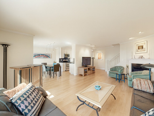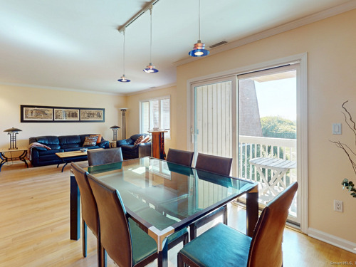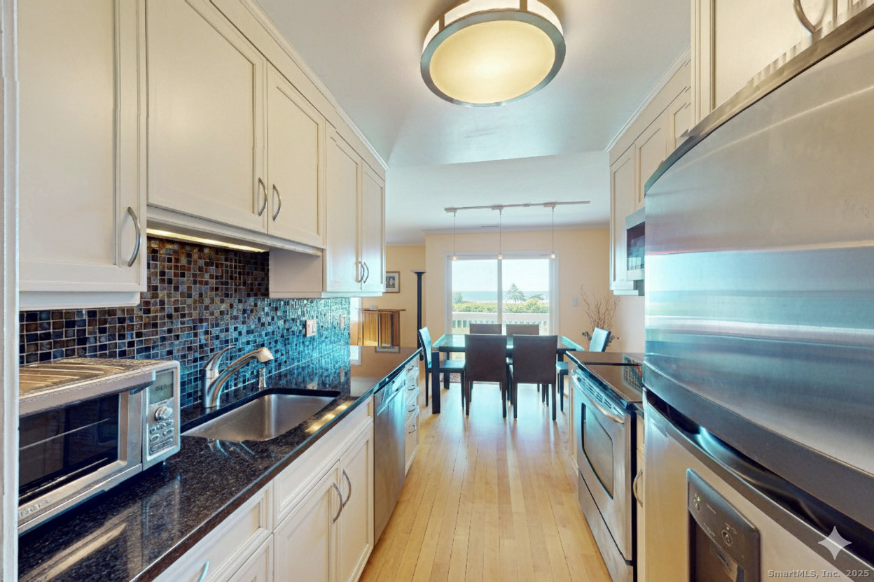 Shippan Point home has sparkling water views over Long Island Sound! Welcome to your seaside escape located in coveted Marina Bay. This bright and spacious 2-bedroom, 2.5-bath duplex condominium is perfectly sited just steps to the beach and minutes to Metro North train, and downtown shopping. Designed with an open-floor plan and flooded with natural light, the main level features an updated galley kitchen with granite counters, stainless steel appliances, and custom cabinets. The kitchen flows seamlessly into the dining area, where sliders open onto a private balcony-your perfect venue for relaxing or entertaining with spectacular water views. The adjoining oversized living room has a warming wood fireplace. A tastefully updated powder room and plenty of storage complete the main floor. Upstairs, the serene primary suite offers a luxurious private balcony overlooking Long Island Sound, a spacious layout with a walk-in closet, and a full en-suite bath. The second bedroom is filled with natural light and features custom closets, making it perfect as a guest room, home office, or both. A second full bath, laundry, and central vacuum are conveniently located on this level as well. Enjoy resort-style living with access to beautifully landscaped grounds, a waterfront in-ground pool, kayak racks, bike room, grills and a recently renovated clubhouse.