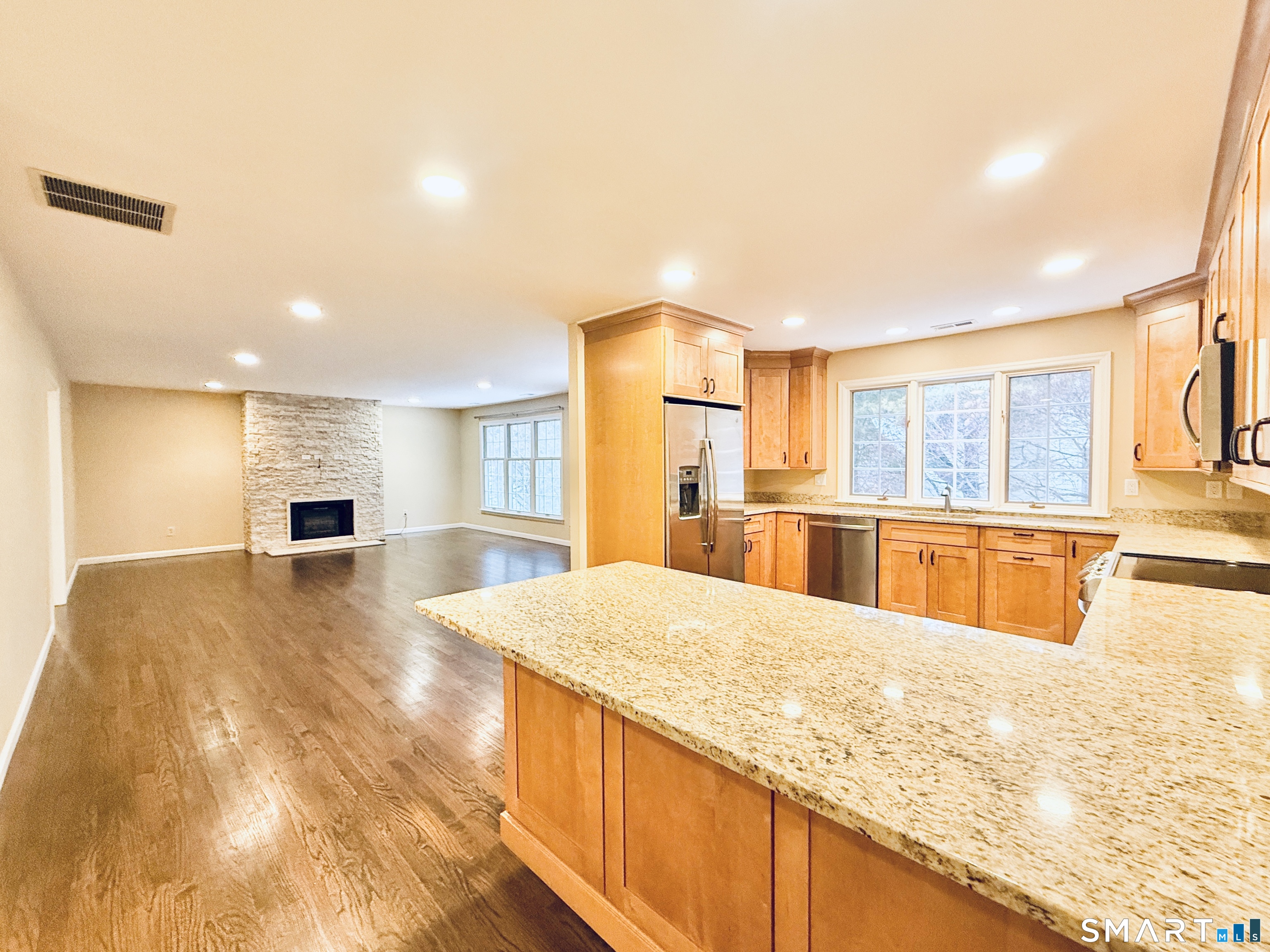 The ever-popular Leefair condo complex is the setting of this delightful and renovated end unit. A large Living Room with stone fireplace is open to the Dining Area and flows into the eat-in Kitchen with granite countertops and peninsula, as well as stainless appliances....a chef's dream. There is also a Study with a bay window. A Laundry area is on the main level, which is perfect since your linens and towels are on this floor. Another plus is the hard-to-find main level Primary Suite with ceiling fan, a walk-in closet and a massive redone bathroom. Hardwood floors throughout the first floor. Additional square footage in the walk-out Lower Level includes a spacious Family Room with a ceiling fan and a bank of sliders to the private and oversized patio area. A second Bedroom has close access to the renovated hall bath. There is also a den on this floor. Tons of storage and a hook-up for an additional Laundry, if needed is all on this level. The two-car garage is pristine and provides entry right into the main floor. Ask me about the secret closet downstairs. Move-in ready unit just waiting for its next lucky owners.