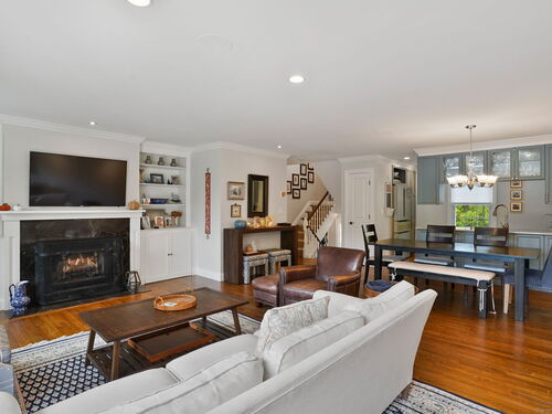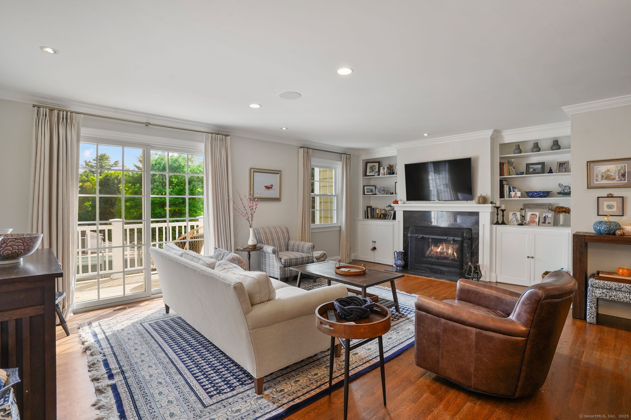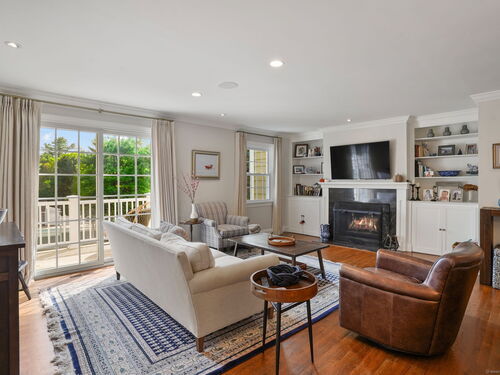 Balcony/Deck, Built-Ins, Combination Liv/Din Rm, Fireplace, Hardwood Floor