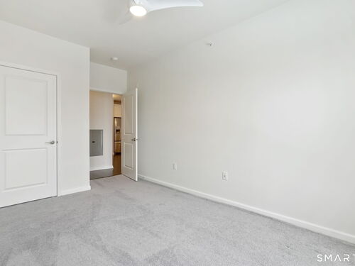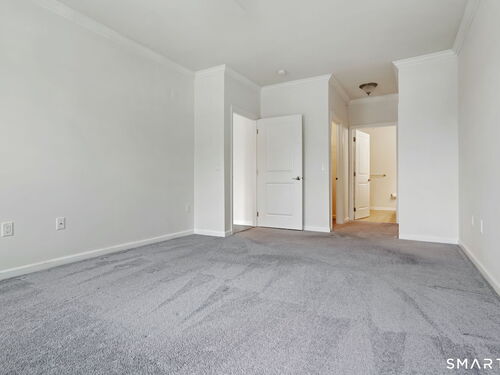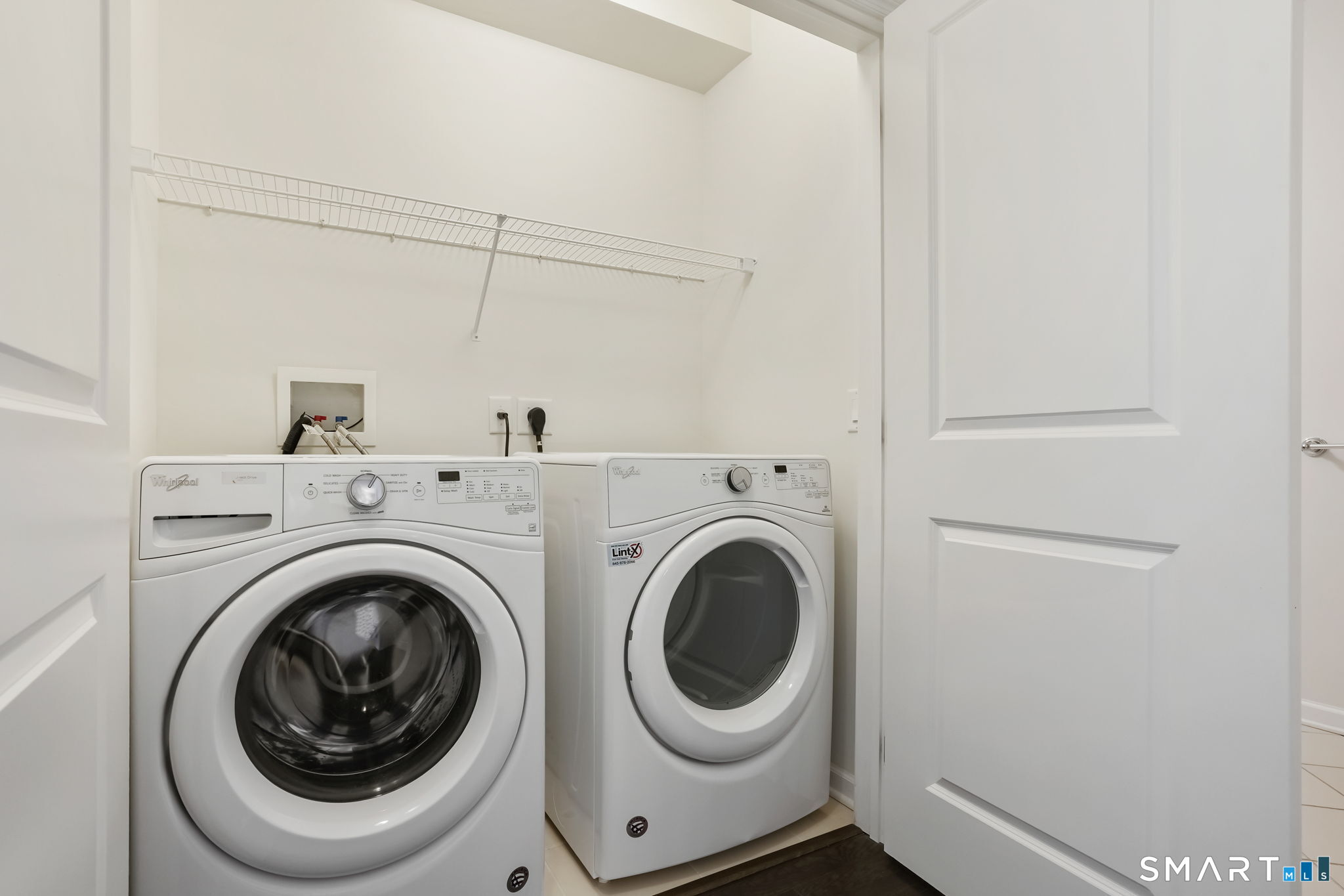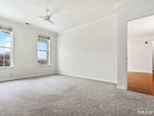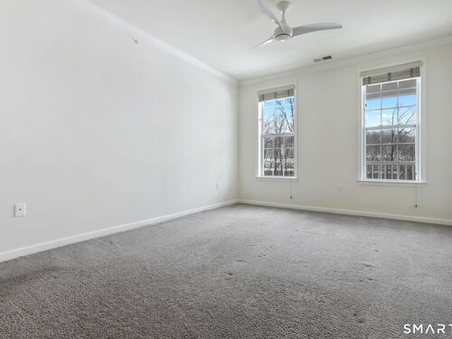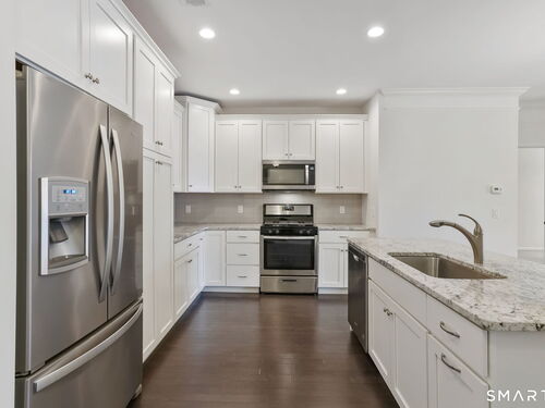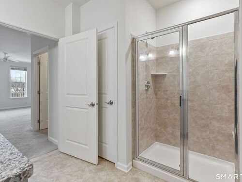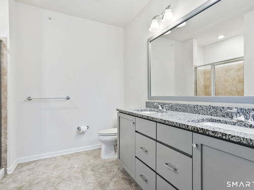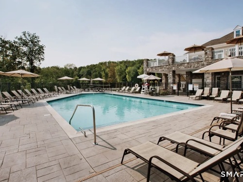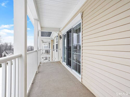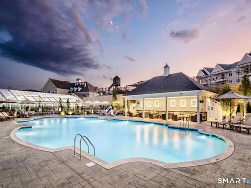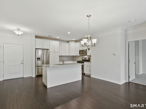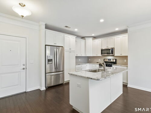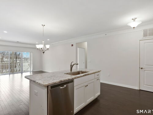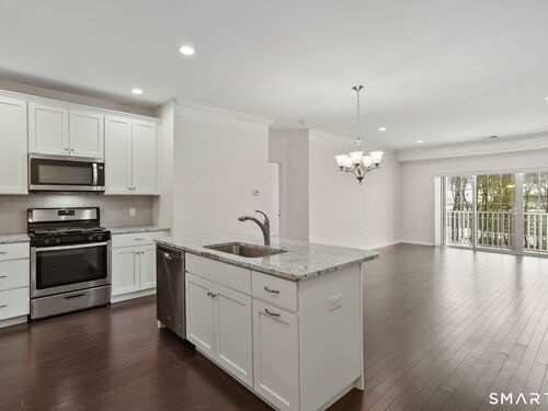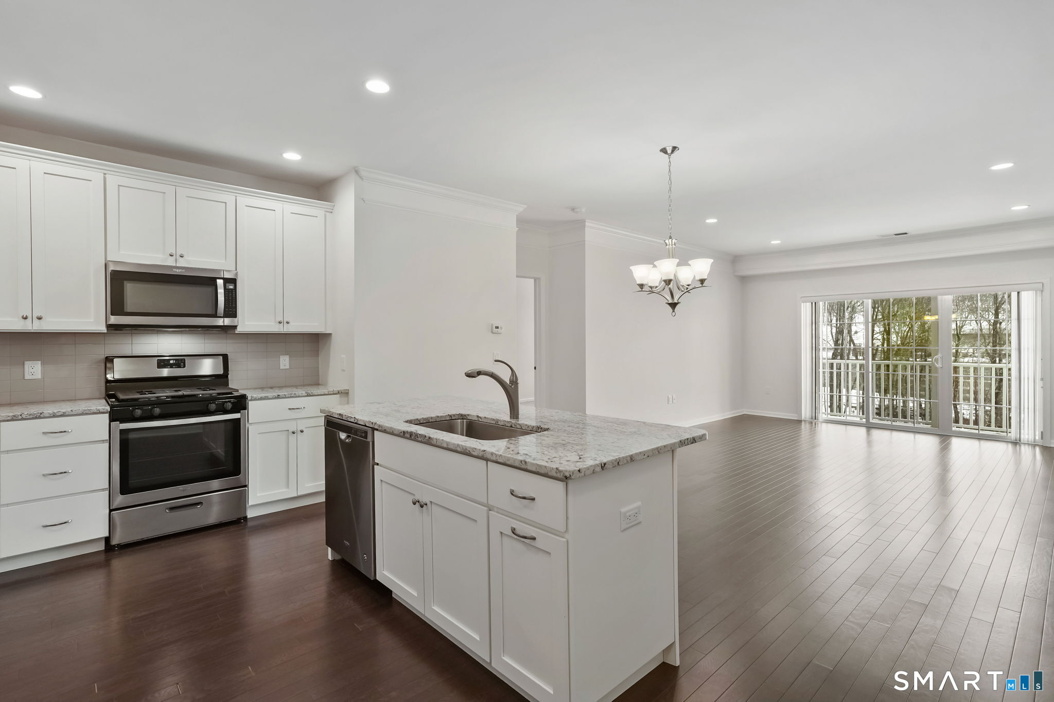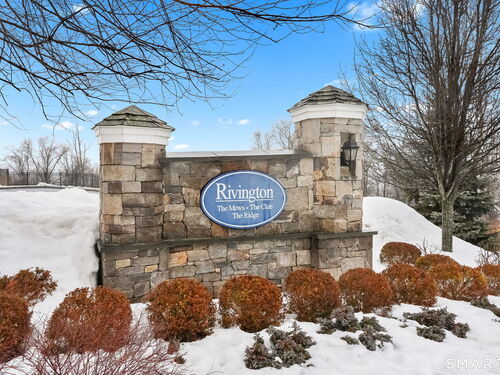 Welcome to this pristine one-level, 2-bedroom, 2-bath upper-level Branford model in Rivington's premier resort-style community. This beautifully maintained home features an open-concept layout connecting the kitchen, dining, and living areas-ideal for everyday living and entertaining. The kitchen offers stainless steel appliances, a gas range, granite countertops, and a spacious center island. The dining area flows into a bright living room with sliding glass doors opening to a private balcony, filling the space with natural light. The primary suite includes a walk-in closet and a full bath with a double-sink vanity. A second bedroom is located near a full hall bath with a shower/tub combination. Additional highlights include in-unit laundry, an assigned parking space near the main entrance, ample guest parking close to the building, and a private locked storage room on the ground level.