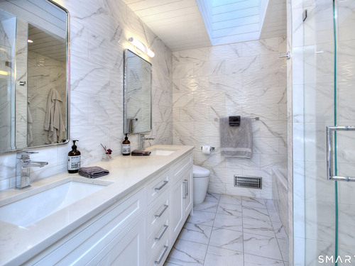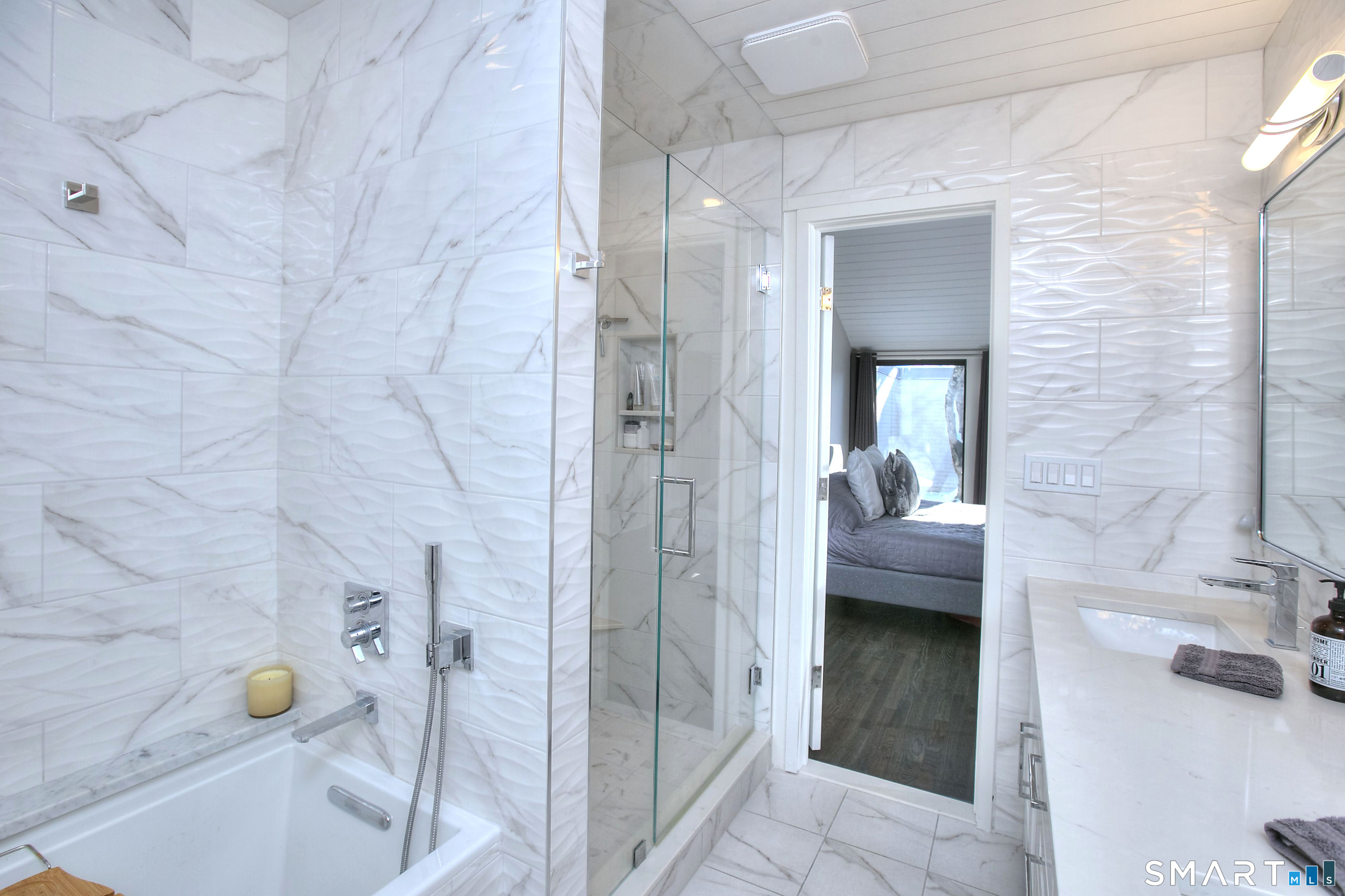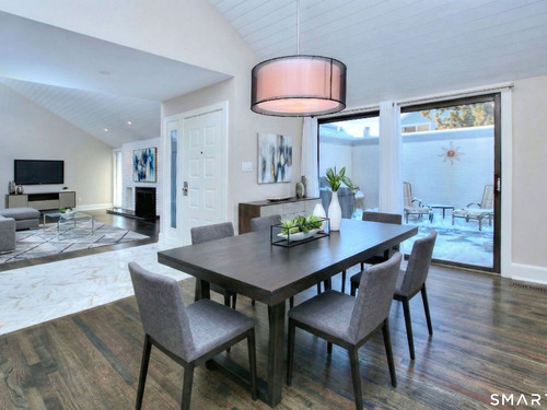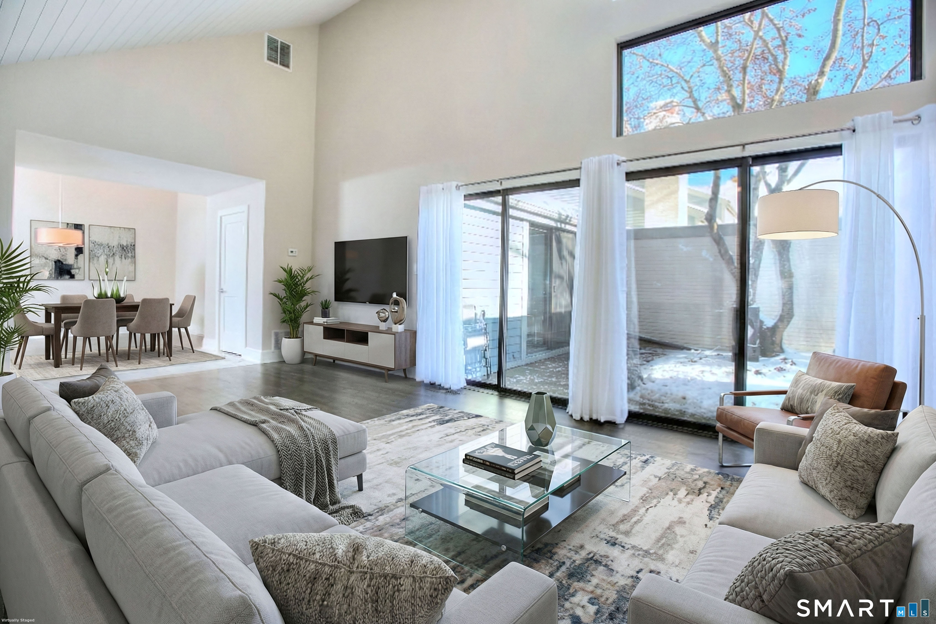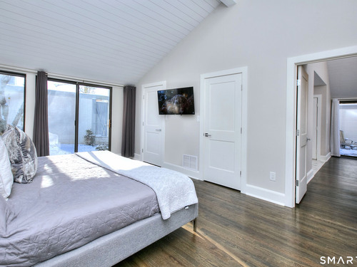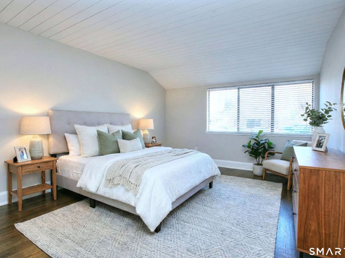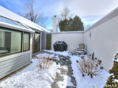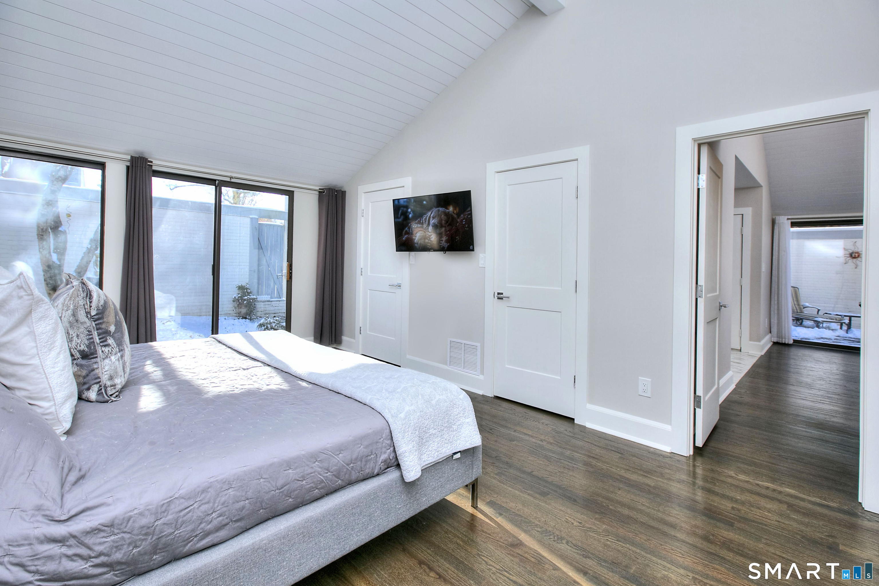 Impeccably renovated one-level 2 bed/2 bath ranch-style condo in coveted Harvest Commons. This sun-filled corner unit offers true stair-free living and has been completely renovated w/high-end finishes throughout. Features include refinished hardwood floors, custom trim and doors, designer lighting, nickel-gap ceilings, and two private landscaped courtyards ideal for indoor-outdoor living. Spacious living room with wood-burning fireplace and custom stone hearth opens to garden courtyard. Updated eat-in kitchen with new stainless appliances, gas cooktop, wall oven/microwave, and new flooring. Serene primary suite with vaulted ceiling, dual custom walk-in closets, private patio, and spa-quality bath with soaking tub, walk-in shower, double vanity, and premium fixtures. Second full bath fully renovated with radiant heated floors. Redesigned laundry room, tankless water heater, and freshly painted interiors including attached two-car garage. Finished lower level offers flexible space plus storage. Harvest Commons amenities include heated pool and Har-Tru tennis courts. Turnkey, single-level luxury living in the heart of Westport.