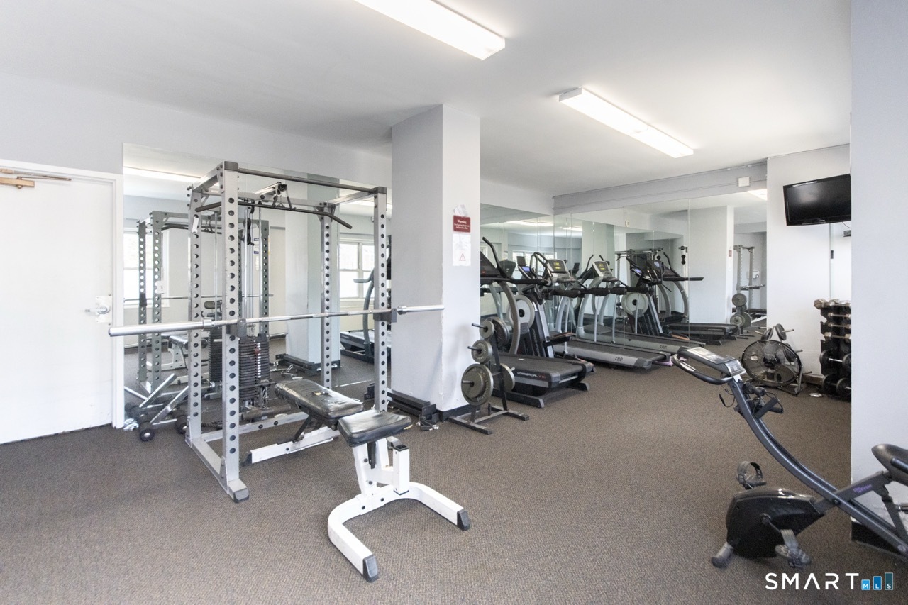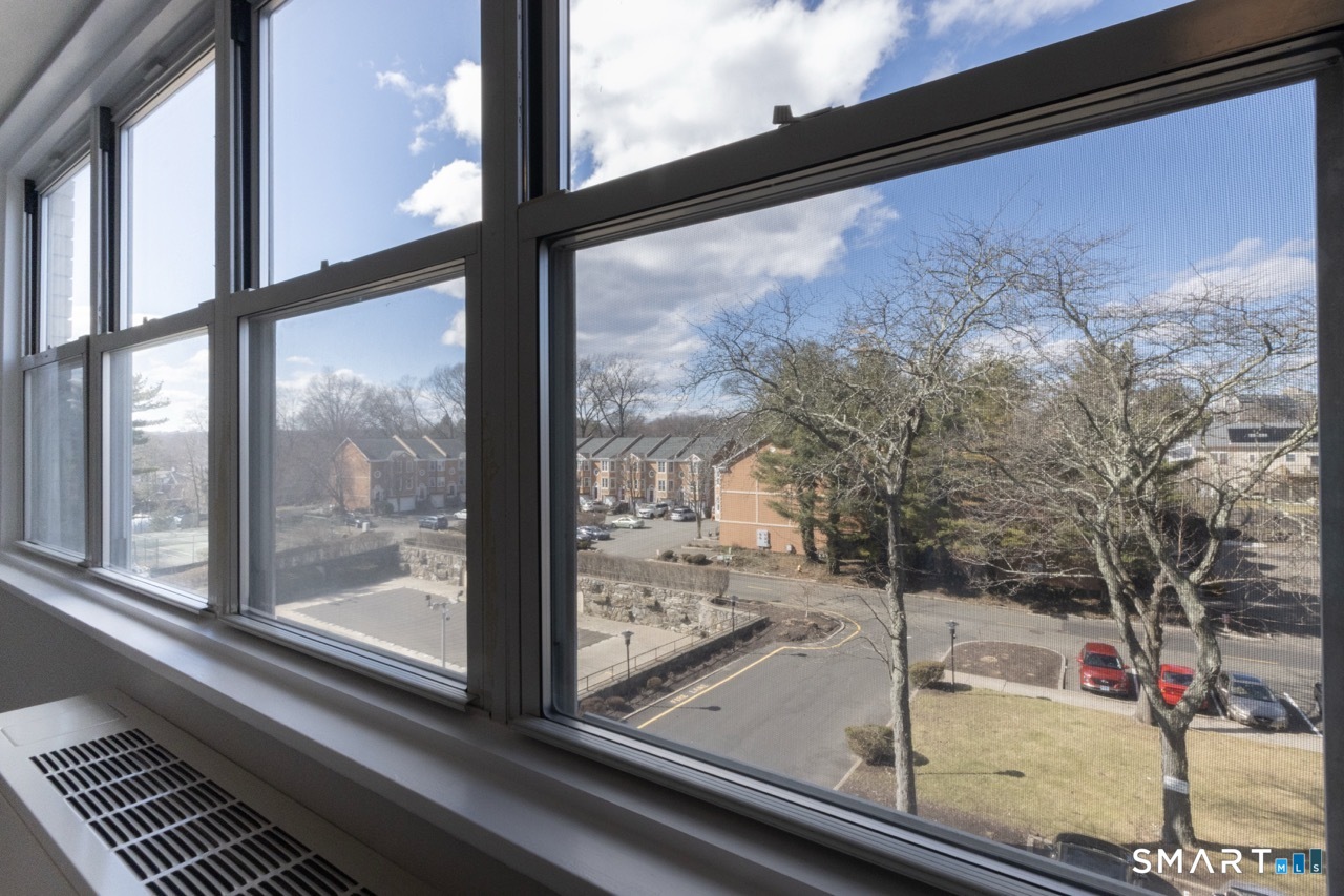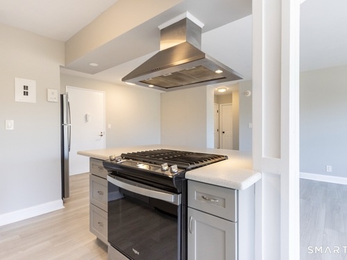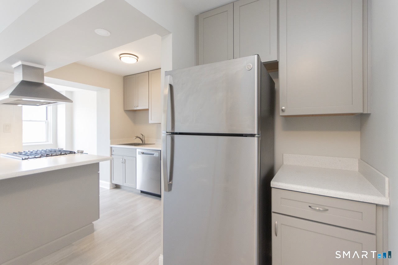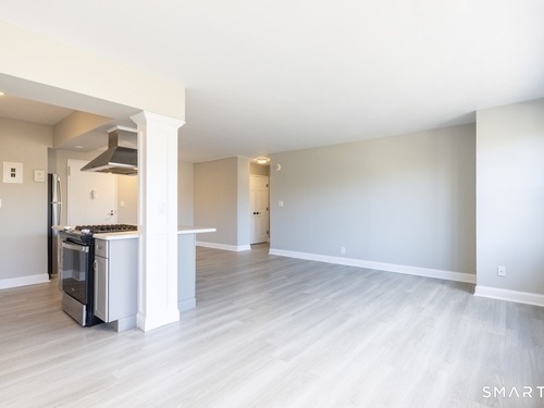 Fabulous open-concept condominium unit with extensive updates in sought-after Embassy Towers! This freshly painted home features luxury vinyl plank flooring throughout and a beautifully updated kitchen and bath. The bright, sun-filled kitchen offers wood cabinetry, quartz countertops, stainless steel appliances, gas range, hood, and island seating-perfect for everyday living and entertaining. Spacious living and dining areas are enhanced by abundant natural light from multiple windows. The generous bedroom offers serene views overlooking the resort-style Olympic-sized pool and features a large closet. A hall pantry provides additional storage. Enjoy easy, maintenance-free living with full-service amenities including 24/7 doorman/concierge, secure gated indoor parking with elevator access, on-site management, heated pool, tennis court, gym, library, event space, outdoor patio, laundry room, assigned parking, assigned storage, guest parking, and dog-walking area. This is a pet-friendly building! Ideally located in the Brooklawn area on the Fairfield line with quick access to I-95, Merritt Parkway, Metro-North, shopping, dining, and beaches. HOA includes heat, hot/cold water, and gas for cooking. Heating and cooling units updated in 2012.