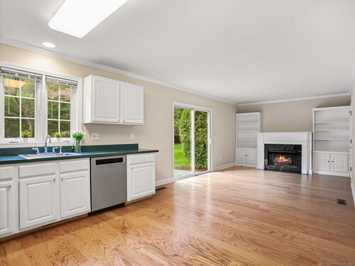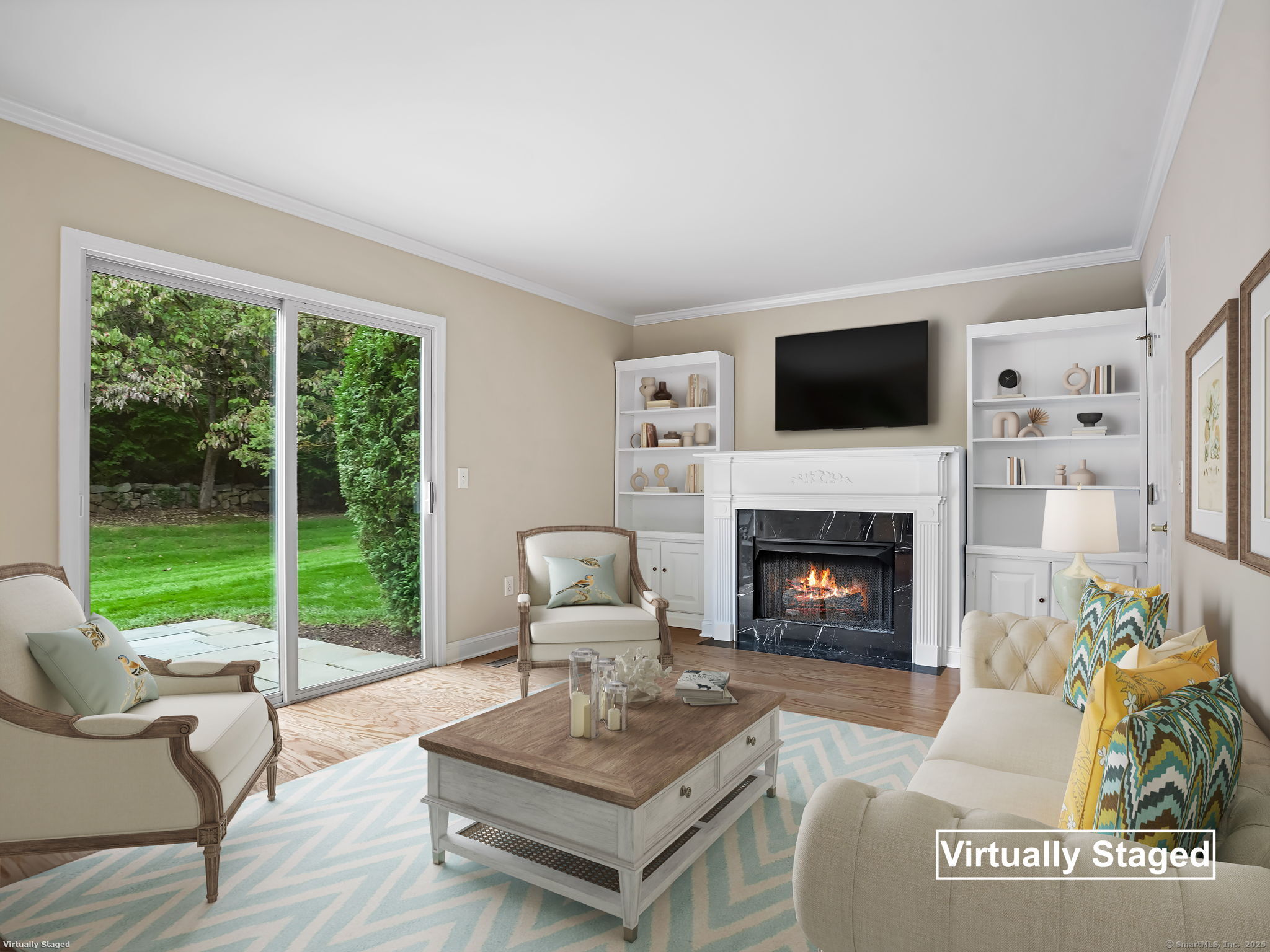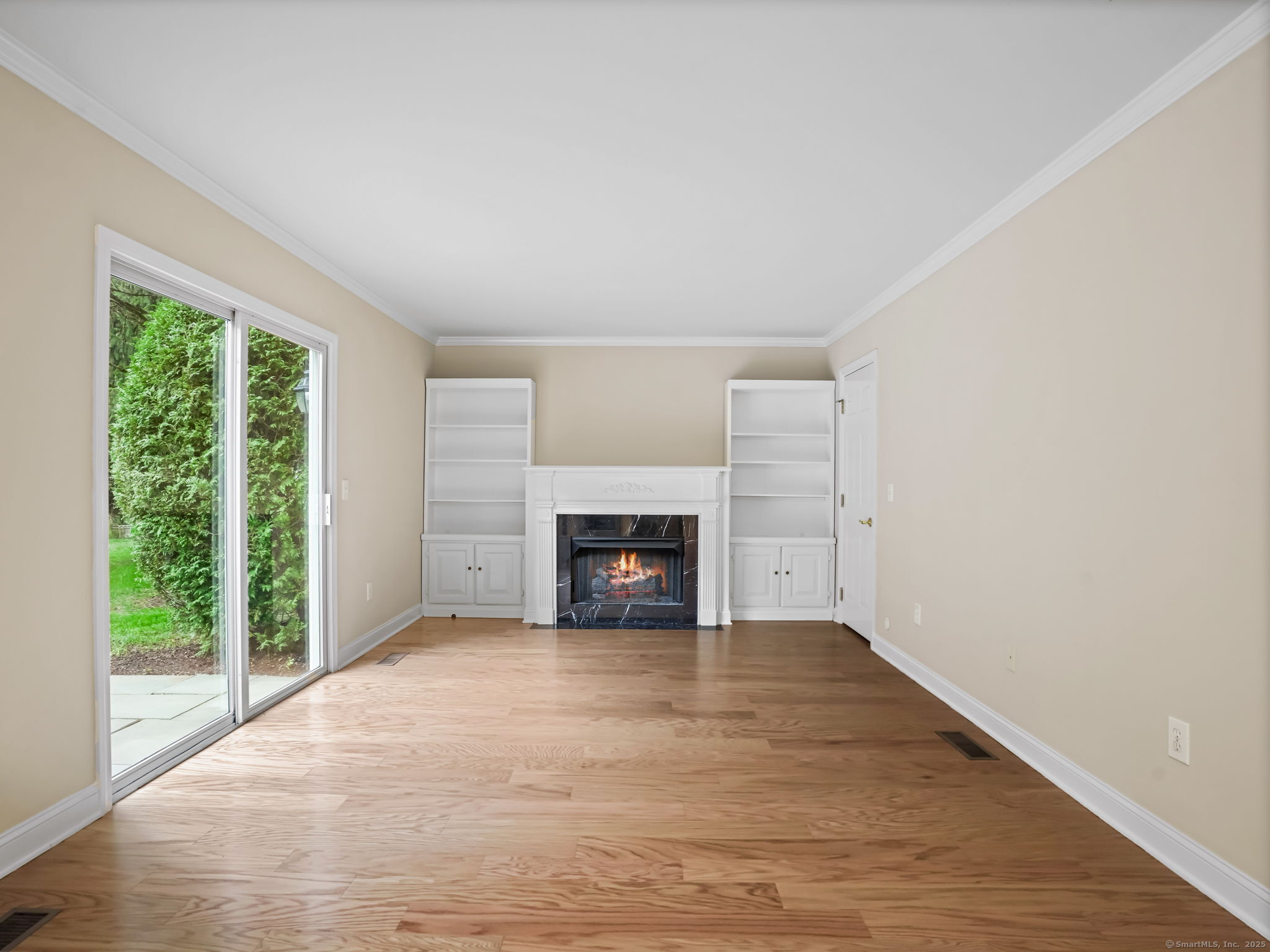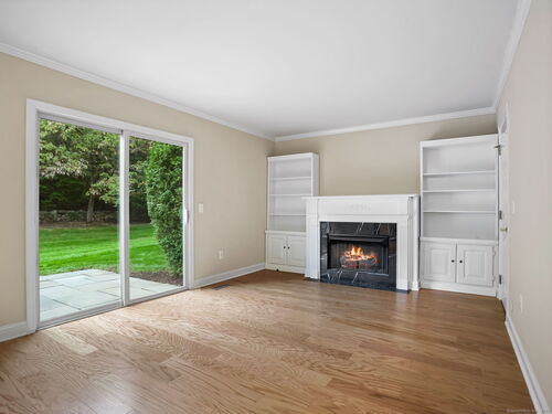 Book Shelves, Built-Ins, Fireplace, Sliders, Hardwood Floor