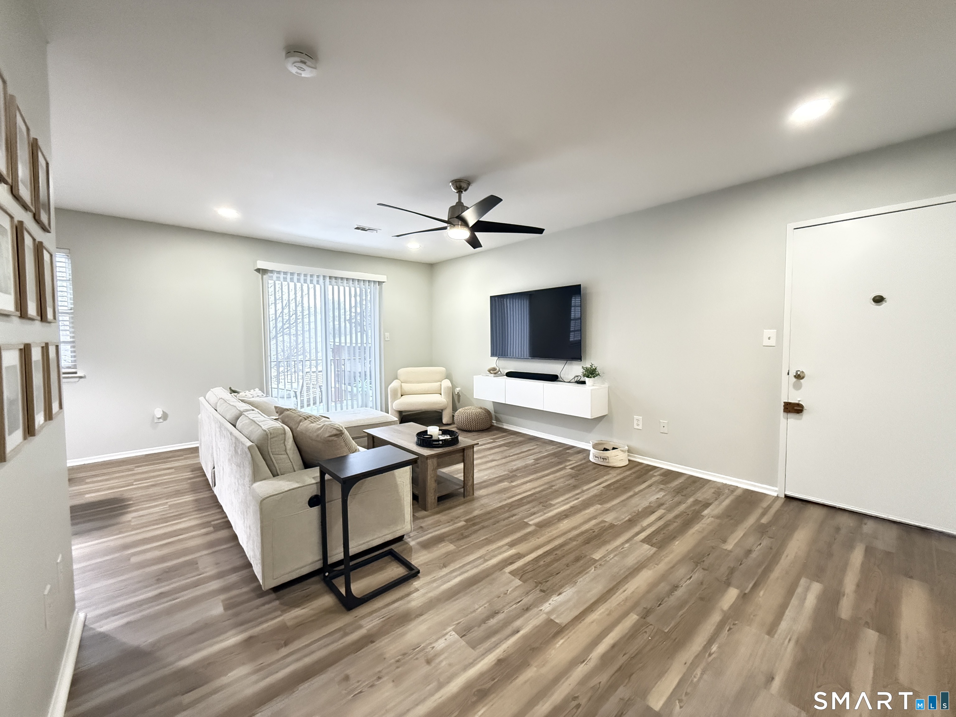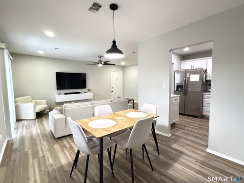 Updated 1-bedroom condo apartment on the second floor featuring 825 sq ft of open-concept living in Bridgeport's North End. Bright living and dining area with wide-plank flooring, recessed lighting, ceiling fan, and sliding glass door to a private covered balcony. Kitchen features white shaker cabinets, quartz countertops, subway tile backsplash with mosaic accent, stainless steel appliances, electric range, dishwasher, and modern hardware. Spacious bedroom with double closets and ceiling fan. Updated full bath with modern vanity, tub/shower combo, tile surround, and glass shower doors. Central air conditioning. In-unit laundry. Electrical panel updated. Complex amenities include in-ground pool, one assigned parking space, hot water, trash and snow removal, plus a private storage area in the shared basement. Located approx. 1 mi to Merritt Parkway (Route 15), 1.5 mi to Trumbull Mall, 1.5 mi to Sacred Heart University, and near Main Street retail, grocery stores, restaurants, and medical facilities.