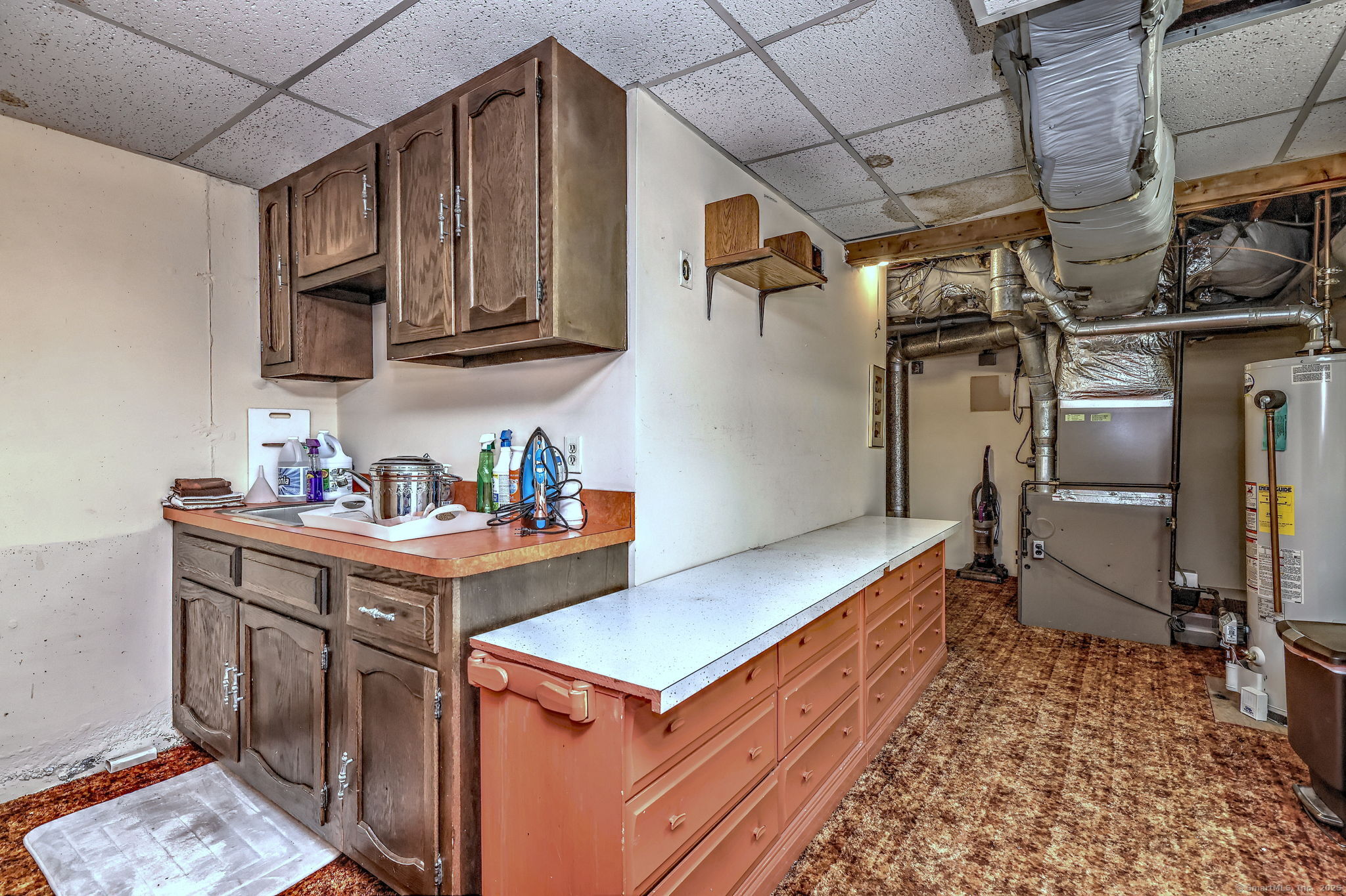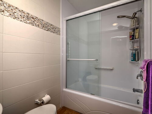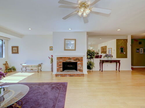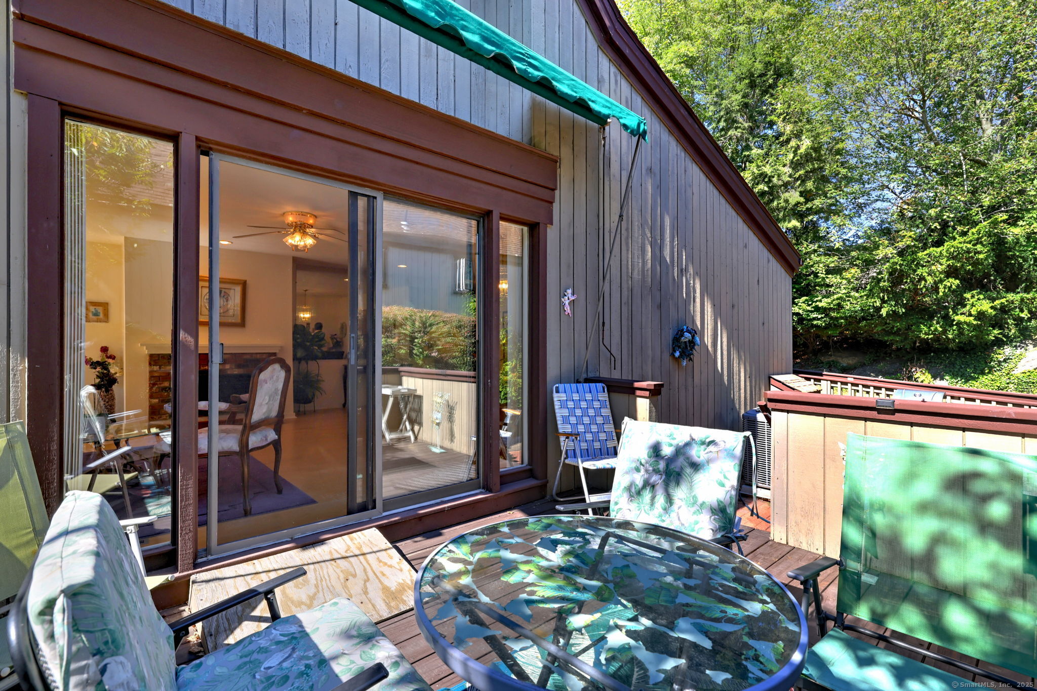 Highly sought-after Thoreau model in Oronoque Village, ideally located for privacy and convenience. The spacious living room features a mirrored wall that enhances depth and natural light, complemented by a glass sliding door leading to a beautiful deck and a large window that adds to the inviting ambiance. A cozy fireplace completes the space. The eat-in kitchen boasts Corian countertops, a deep stainless steel sink, tiled backsplash, and ceiling-height cabinetry for ample storage. A large double window offers serene views of the private yard. The dining room includes a chandelier and a convenient pass-through to the kitchen, perfect for buffet-style entertaining while maintaining separation from the cooking area. The full bath includes a walk-in shower for easy access. The versatile den can be converted into a second bedroom with the addition of closet doors or used as a home office. Gleaming hardwood floors run throughout the kitchen, den, living room, and dining room. The generous primary bedroom features wall-to-wall carpeting, two closets, a linen closet, and an updated en-suite bath. The lower-level family room offers a welcoming retreat with whitewashed walls, faux stone accents, wall-to-wall carpeting, and a separate entrance. A full bath and kitchenette area make it ideal for use as an in-law suite. Unit also has a stone patio, handicap-accessible