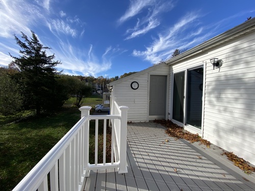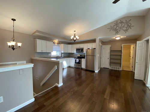 Home Sweet Home! This great location condo offers easy access from the main road with no hills. This ranch style condo is an end unit with mother nature outside your windows. Enter from your front door or from your garage area which keeps you dry during the stormy winter months and offers storage. Our open floor plan offers a skylight in the living room, kitchen with plenty of cabinets and stainless steel appliances, stackable washer and dryer in unit, attic access, master bedroom with plenty of lighted closet space, ceiling fan with light, own entrance to bathroom and views to mother nature. Our second bedroom also offers plenty of closet space, ceiling fan with light, and views to mother nature. In the warmer months our new trex deck is overside with a special area for a grill that doesn't take away from the oversized dining space. Outdoor storage and outdoor electrical is an added plus. with a slider to a new oversized trek deck. Low common charges and move in ready! This move in ready condo offers a walkable area to Center Stage or the Riverwalk!