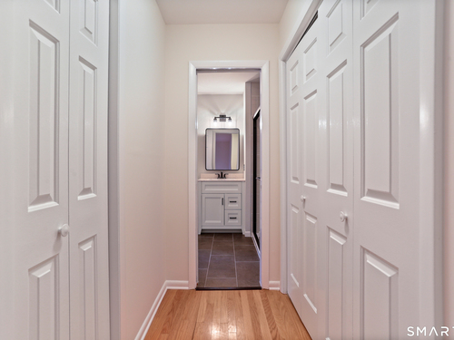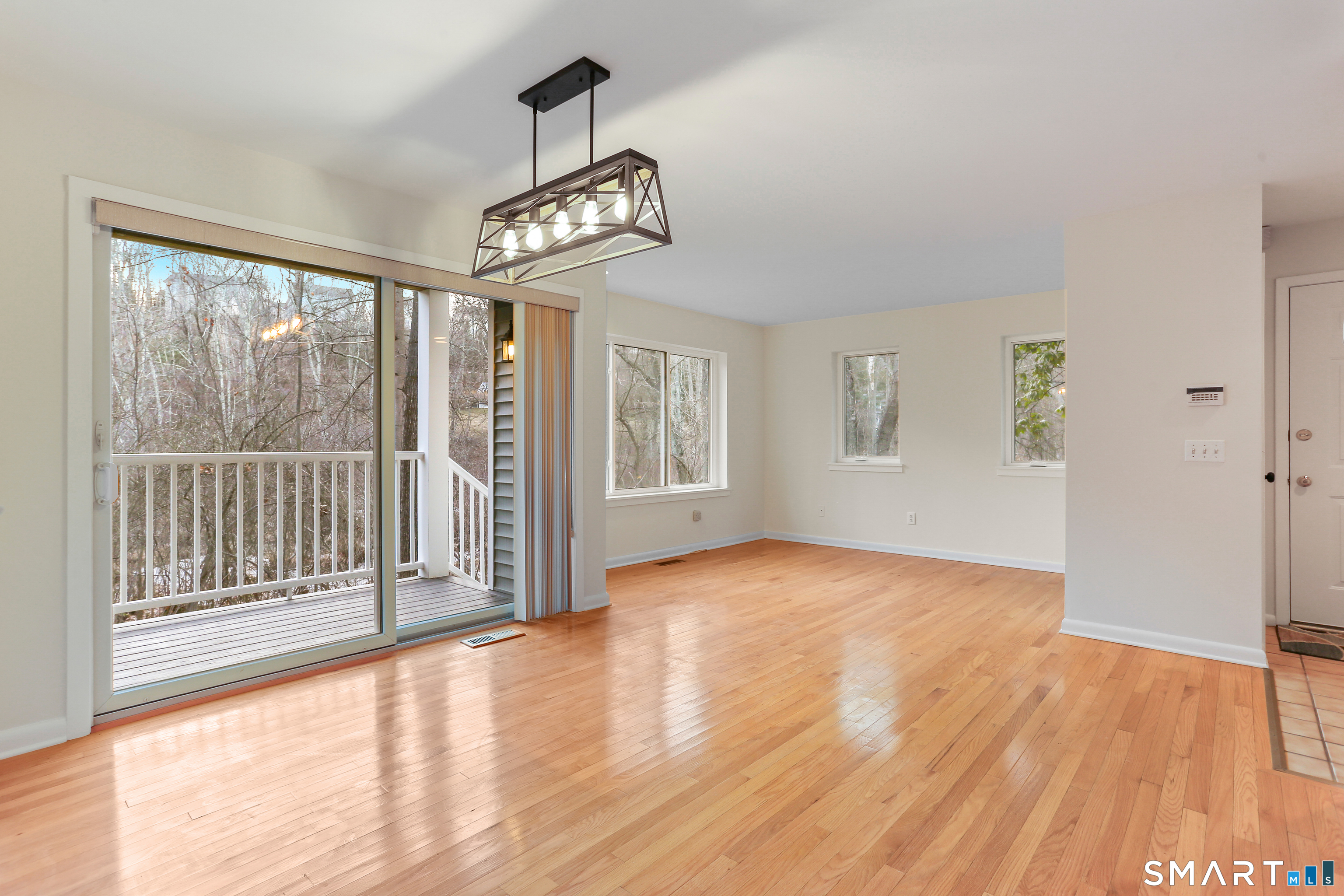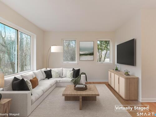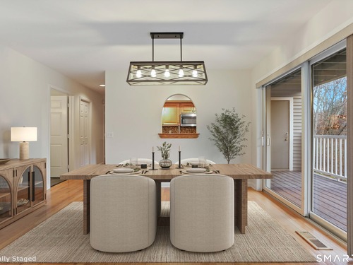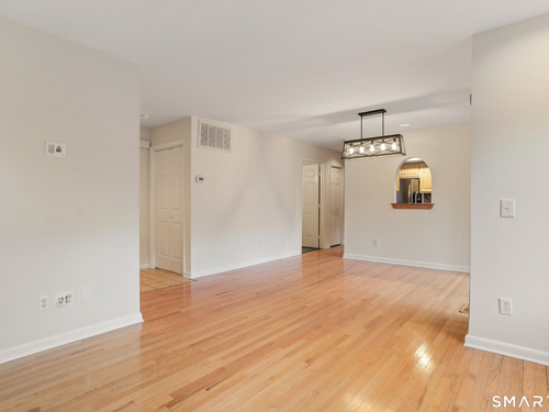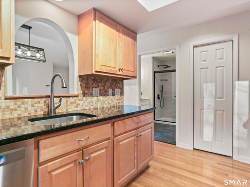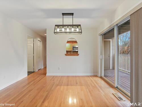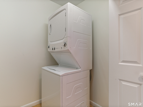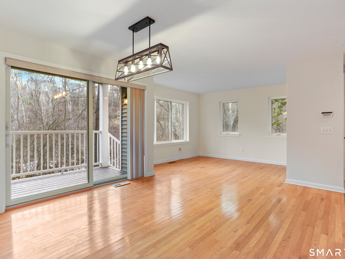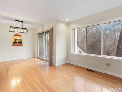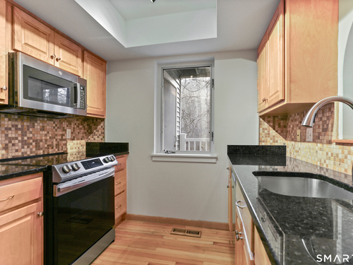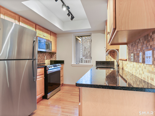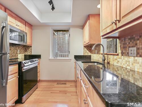 Discover living at Glen River East in the heart of Wilton town center near boutique shops, Schenck's Island trails & seasonal community events. Tucked behind the building, this updated 1 BR home offers wooded views & easy one-level living. Foyer w/ coat closet, dedicated laundry rm & utility closet provides excellent storage. Open concept main living drenched in sunlight. LR enveloped in windows & hardwood flrs create an airy, comfortable feel. The DR is complimented by a statement lighting fixture & connects naturally to the LR w/sliders to deck for indoor/outdoor enjoyment. Timeless galley style kitchen offers warm wood cabinetry, dark counters & decorative tile backsplash. Updated stainless appliances, stylish new overhead lighting, a pass-thru to DR & pantry create a space that is refined & functional. The generous BR retreat w/soft light & calm atmosphere provides 2 full-length closets that form a hall to the full bath, maximizing storage while keeping the sleeping area uncluttered. Sumptuous refreshed full bath w/glass-enclosed shower & contemporary finishes is sure to delight. True laundry rm w/stackable w/d offers space for shelving/folding. Utility rm w/addtl storage & provides a pegboard organizer to maximize vertical space. A long elevated deck takes in tranquil views of nature, w/private exterior storage closet & stairs to the grounds, ideal for quick steps out with a pet. Residents enjoy an outdoor pool w/pool house perfect for gathering, unwinding, & summer fun.
