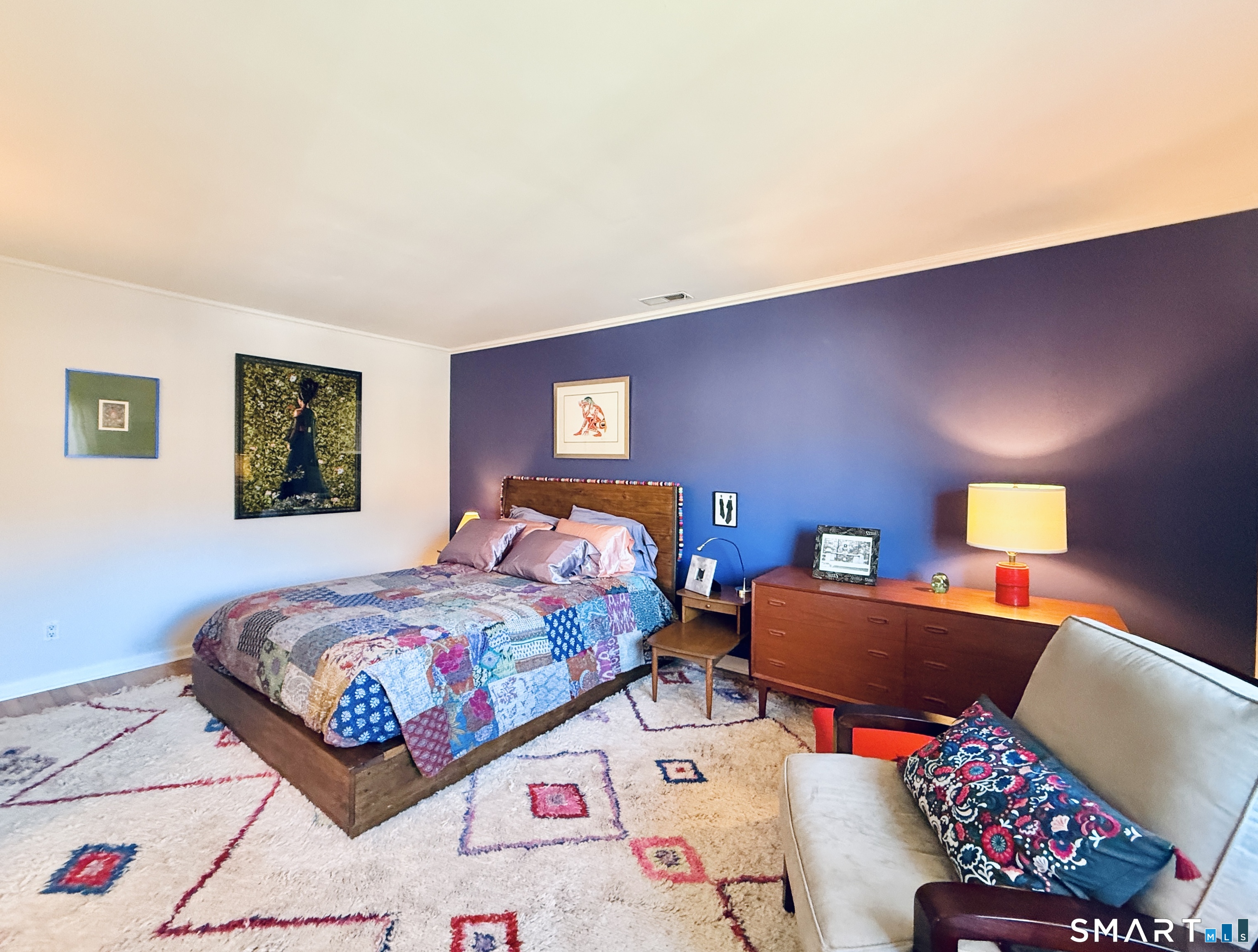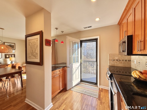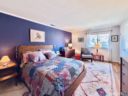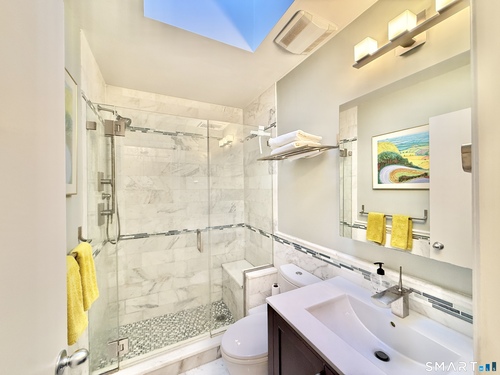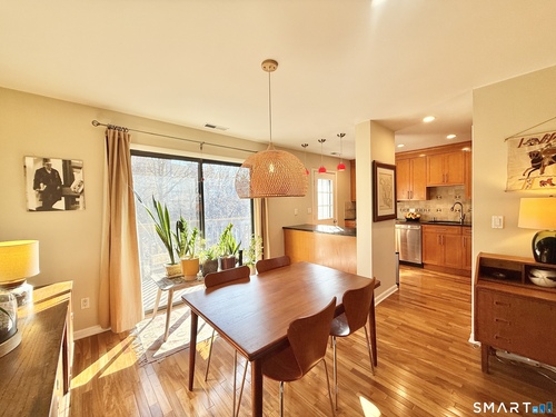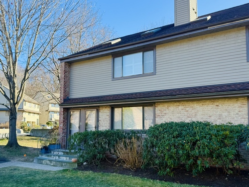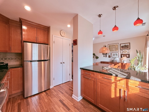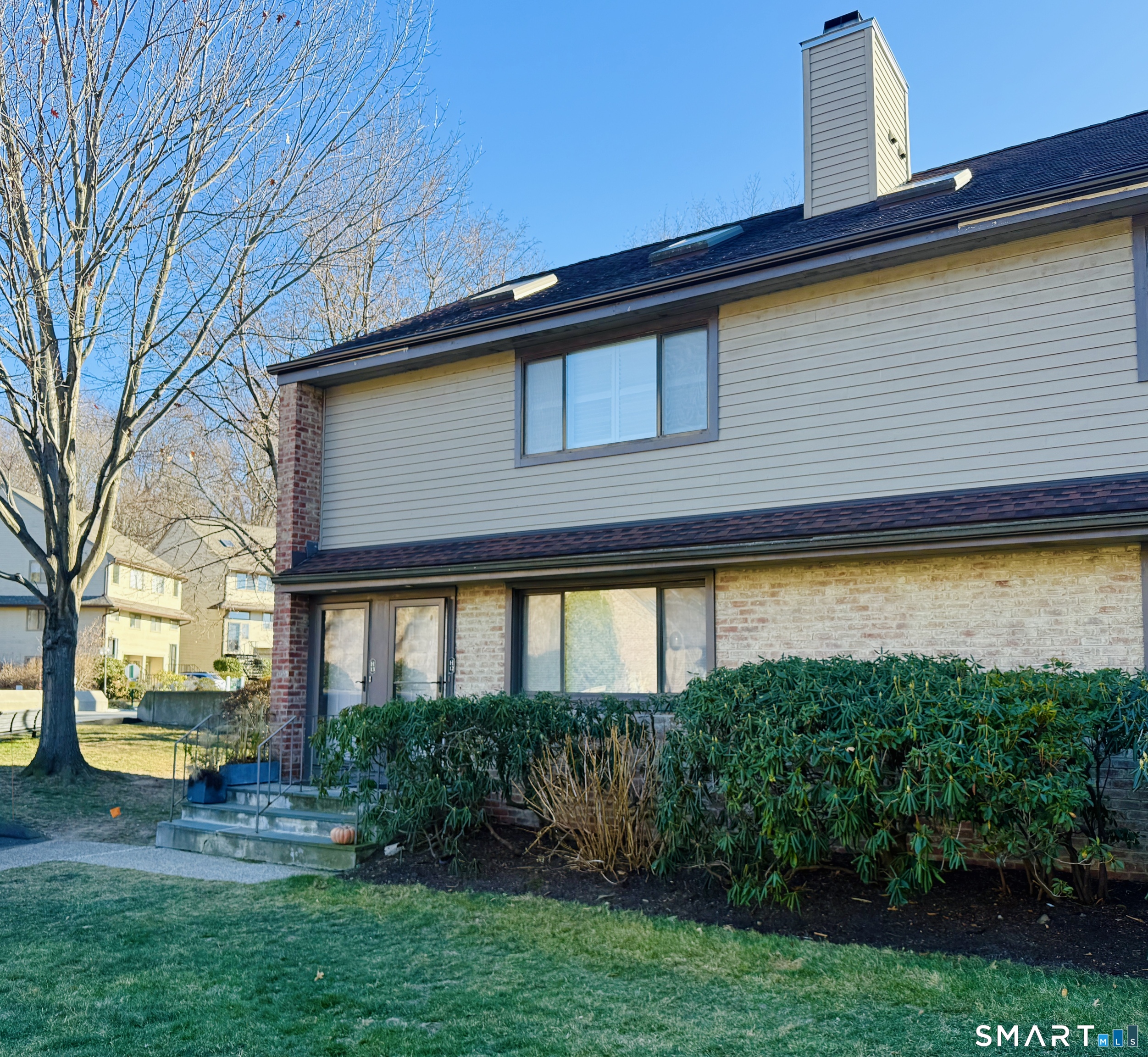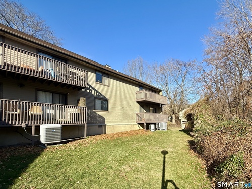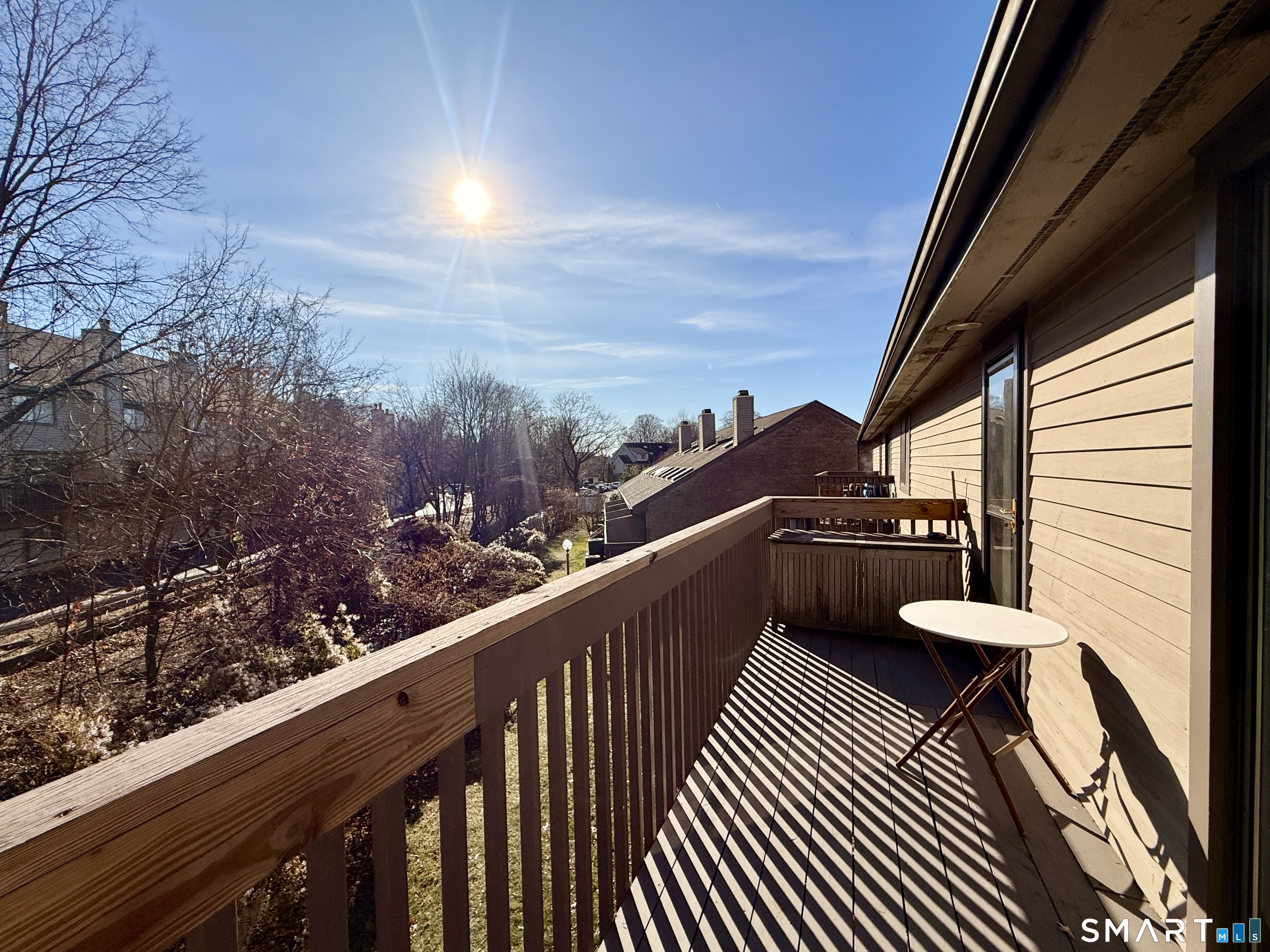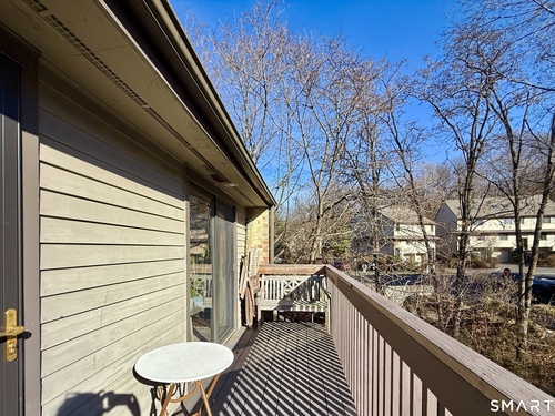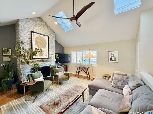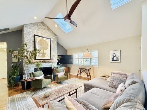 Bright and spacious 2-bedroom, 2-full-bath second-floor end-unit in Stamford's sought-after Chesterfield gated community. Tucked at the end of the building for added privacy and flooded with natural light from oversized windows and skylights, this home feels open and airy the moment you step inside. The inviting living room features dramatic vaulted ceilings, a cozy wood-burning fireplace, and direct access to your private deck - ideal for morning coffee or unwinding after a long day. A separate dining room flows seamlessly from the efficiently laid-out kitchen, creating the perfect setup for both daily living and entertaining.Both bedrooms are generously sized with excellent closet space, and the primary includes its own full bath. A rare pull-down attic offers exceptional storage you won't find in most condos.