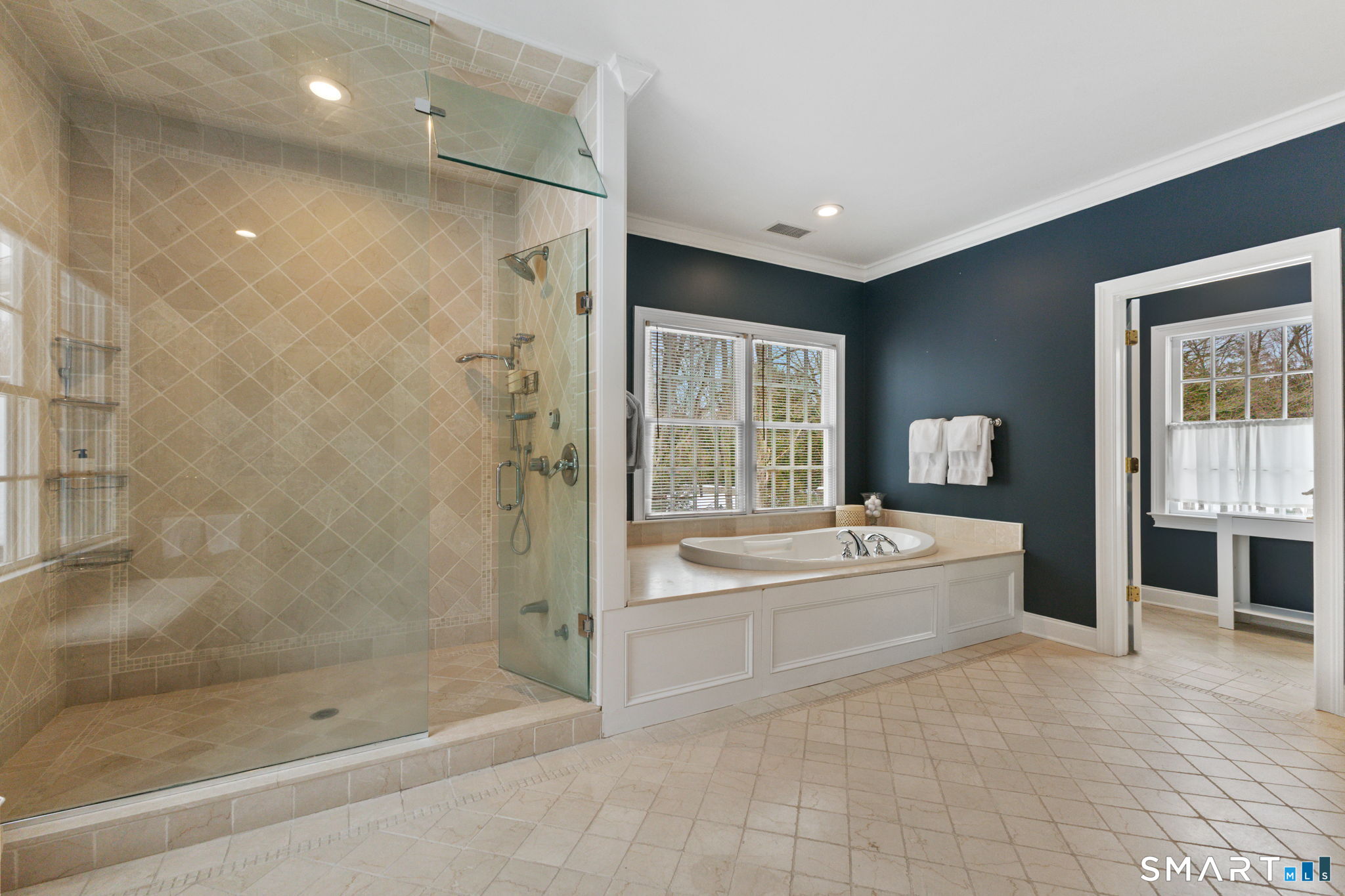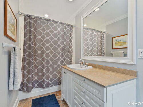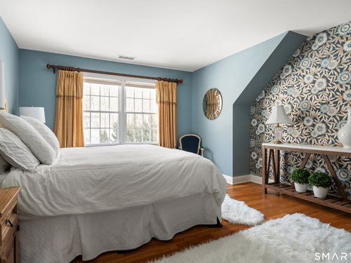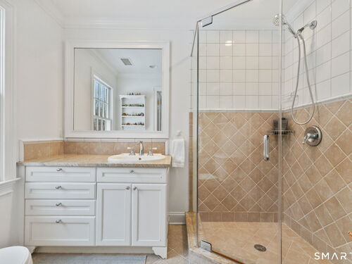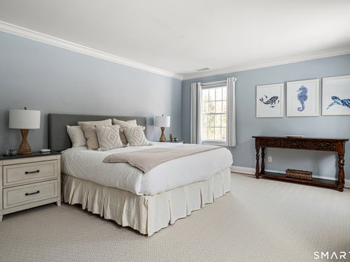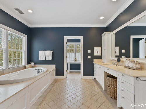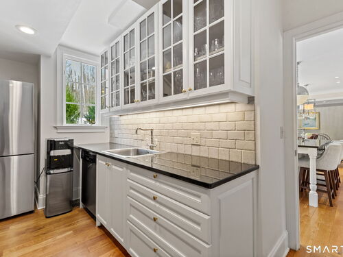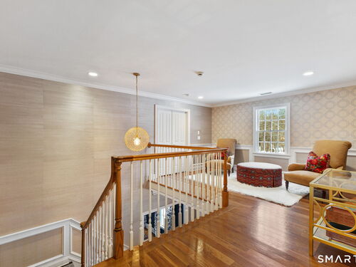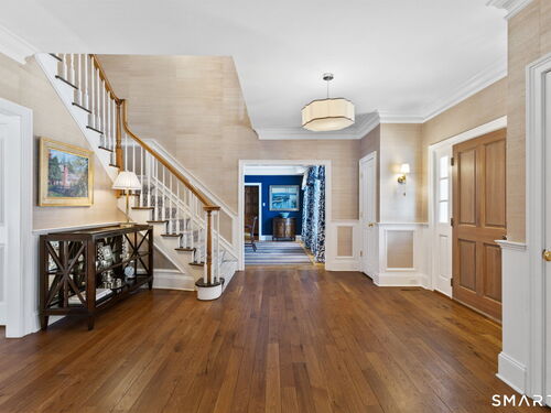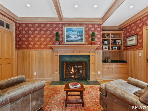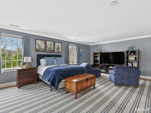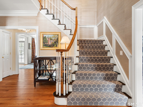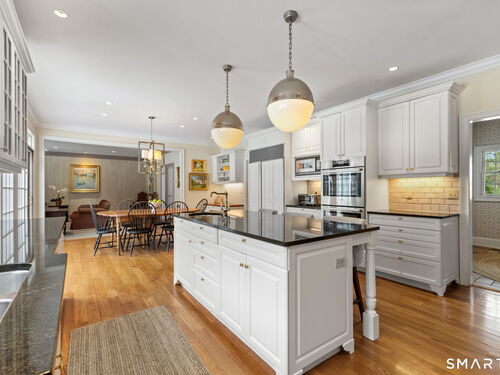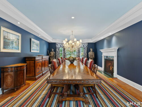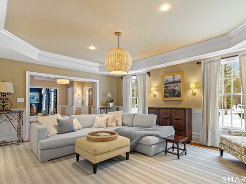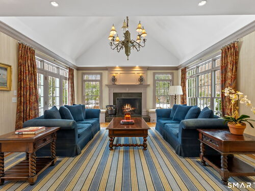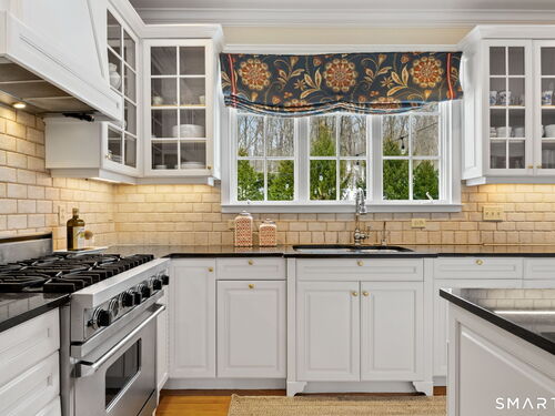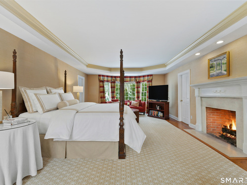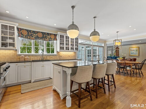 On one of Weston's most coveted cul-de-sacs, this custom Colonial offers over 6,300 sq ft across three finished levels plus a full lower level, set on just over two flat private acres. From the moment you step inside, the light is unmistakable, with oversized windows illuminating generous rooms and impressive vertical scale. The professionally appointed kitchen with Thermador double ovens, Viking range, Sub-Zero fridge and butler's pantry opens to a stunningly vaulted family room with stone hearth. It's a home built for gathering. The dining room comfortably seats 18 while remaining welcoming and gracious, the kind of space where stories stretch long past dessert. A sunlit living room with tray detail and millwork adds sophistication, while a private study offers a quiet escape. Mudroom and 3 car garage complete the first level. Upstairs, a serene primary suite offers a fireplace, walk-in closet, and spa bath with soaking tub/steam shower, complemented by 5 additional en suite bedrooms. The third floor offers flexible space for guests, media, or extended family living. Outside, mature trees and plantings, stone walls, and two bluestone patios frame the property. Pool plans available! The lower level is all about fun, anchored by a 6-seat bar with space for billiards, games, and fitness. Minutes to Weston Center, top-rated schools, golf/tennis clubs, Westport's Compo Beach, and easy NYC commute. A true home in every sense.
