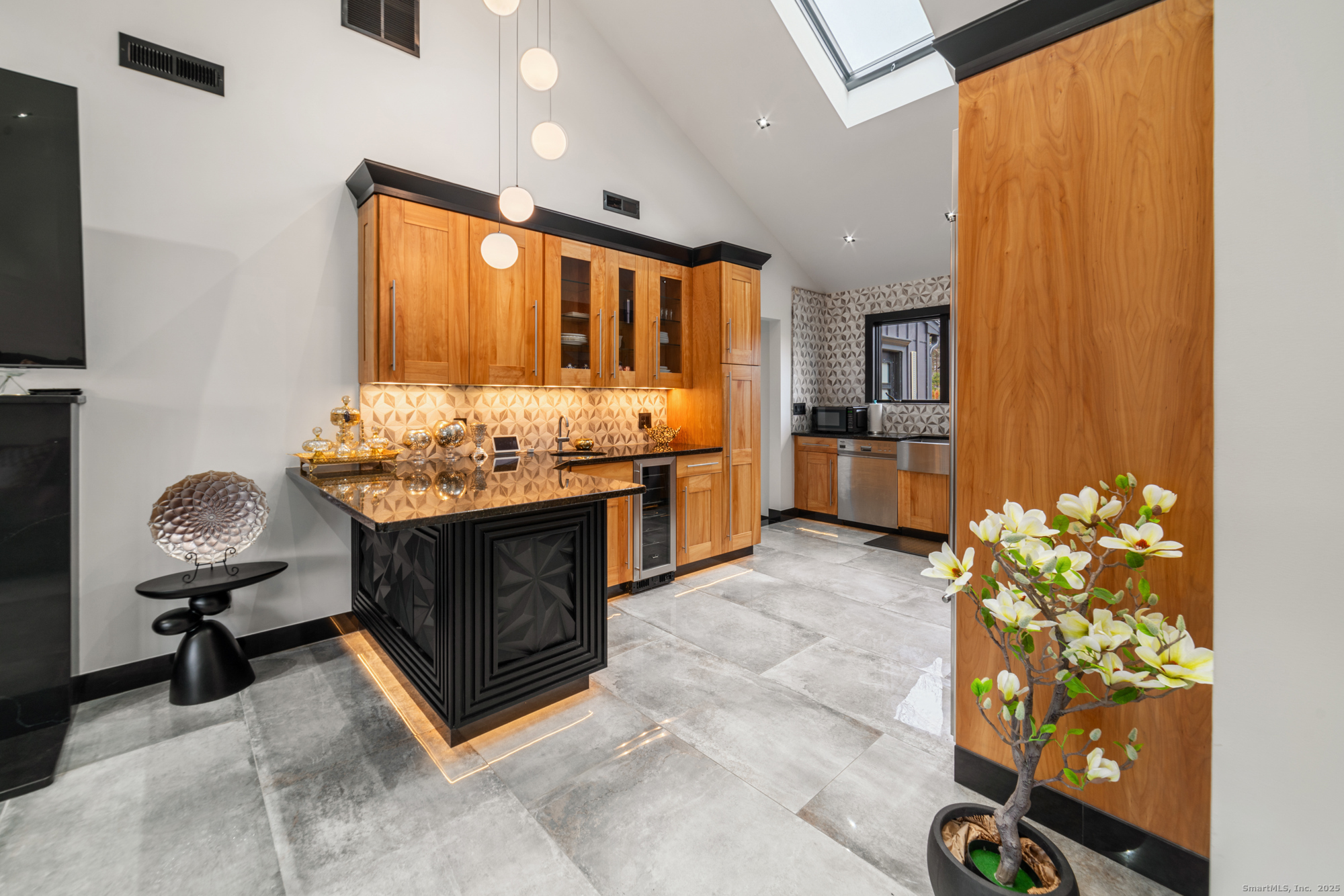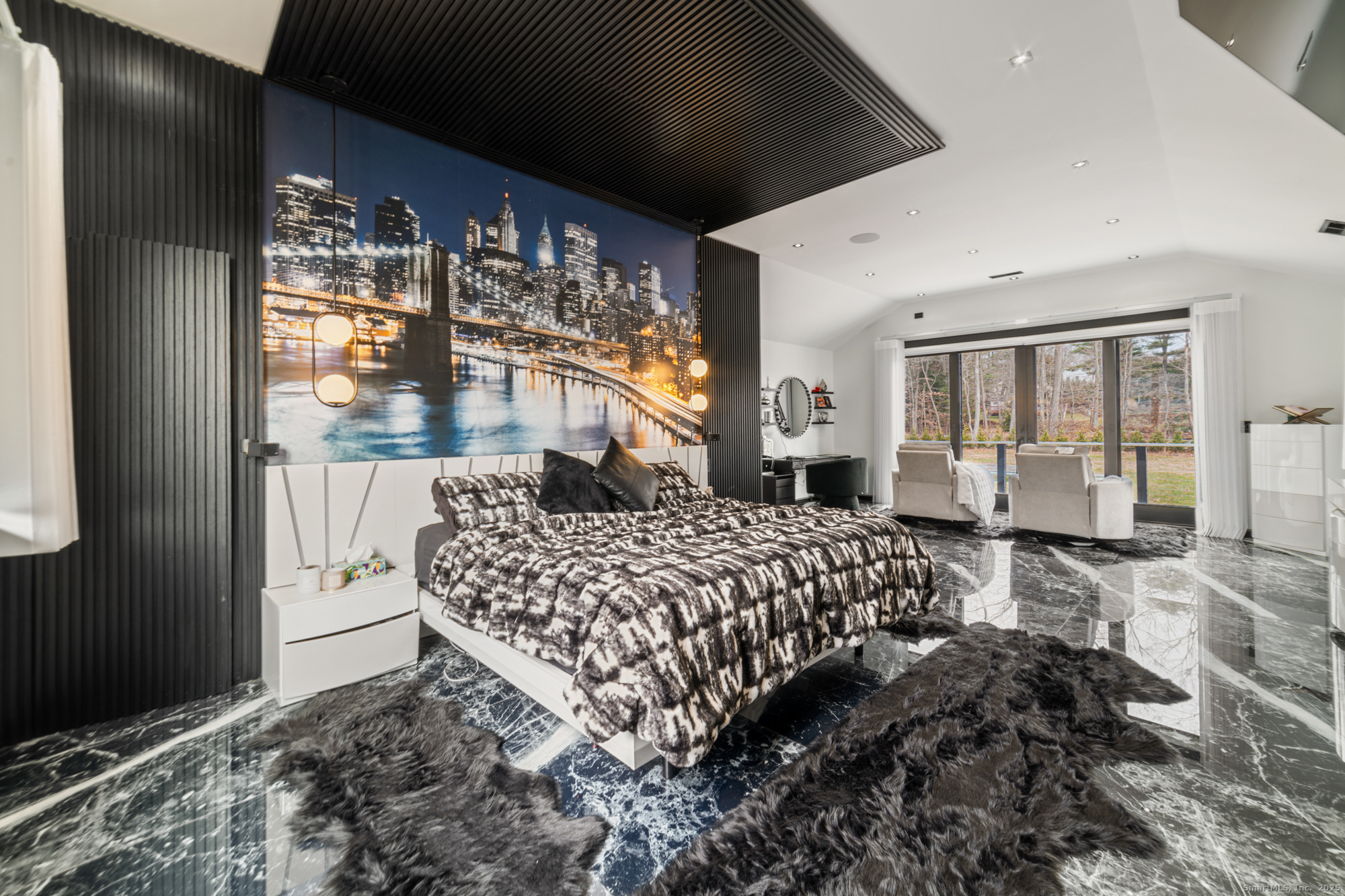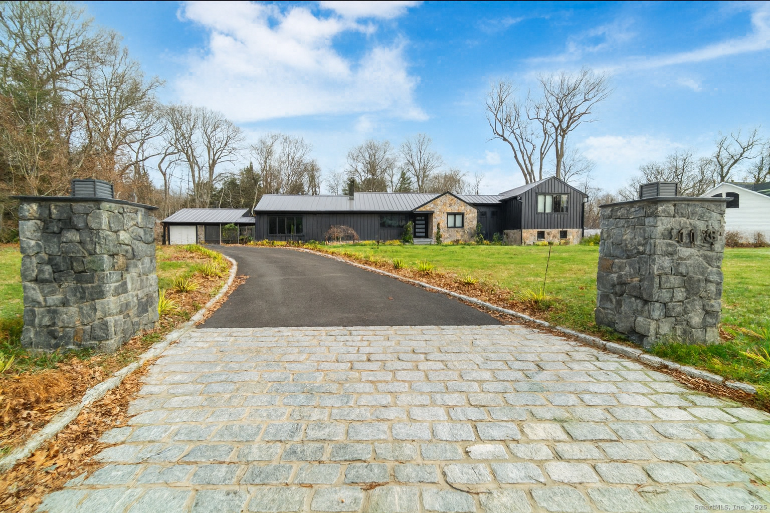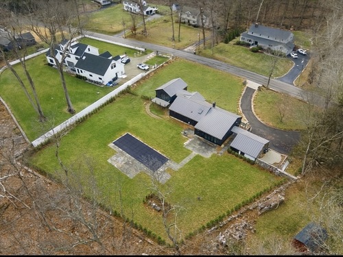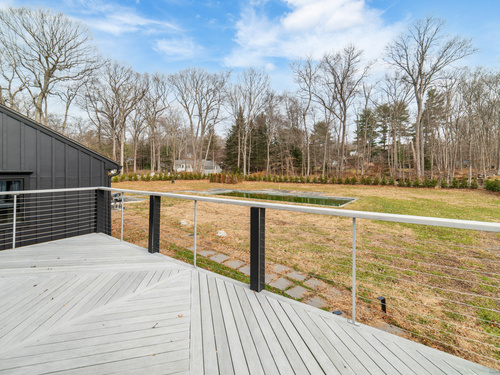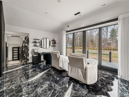 A beautifully renovated modern ranch set on a pristine acre in one of Stamford's most desirable neighborhoods. Thoughtfully designed with timeless elegance and contemporary comfort, this home offers effortless, elevated living. A sun-filled interior features soaring ceilings, wide-plank tile floors, and a seamless open flow. The formal living room, highlighted by a striking marble fireplace, leads into a stunning chef's kitchen with professional-grade appliances, custom cabinetry, granite counters, and an oversized peninsula. The adjacent dining room opens through French doors to peaceful views of the private grounds. The South wing hosts a luxurious primary suite with two custom walk-in closets, a serene sitting area with access to a private deck, and a spa-inspired bath with a soaking tub and rainfall shower. Two additional bedrooms and a beautifully updated full bath complete this wing. The finished walk-out lower level offers flexible space ideal for a home office, gym, playroom, or media room. Outside, your private oasis awaits- In ground pool surrounded by bluestone patios, and mature trees creating a serene and exclusive retreat. Perfectly located near schools, shopping, dining, and Metro-North, 113 Woodbrook Drive delivers the perfect balance of luxury, privacy, and convenience.