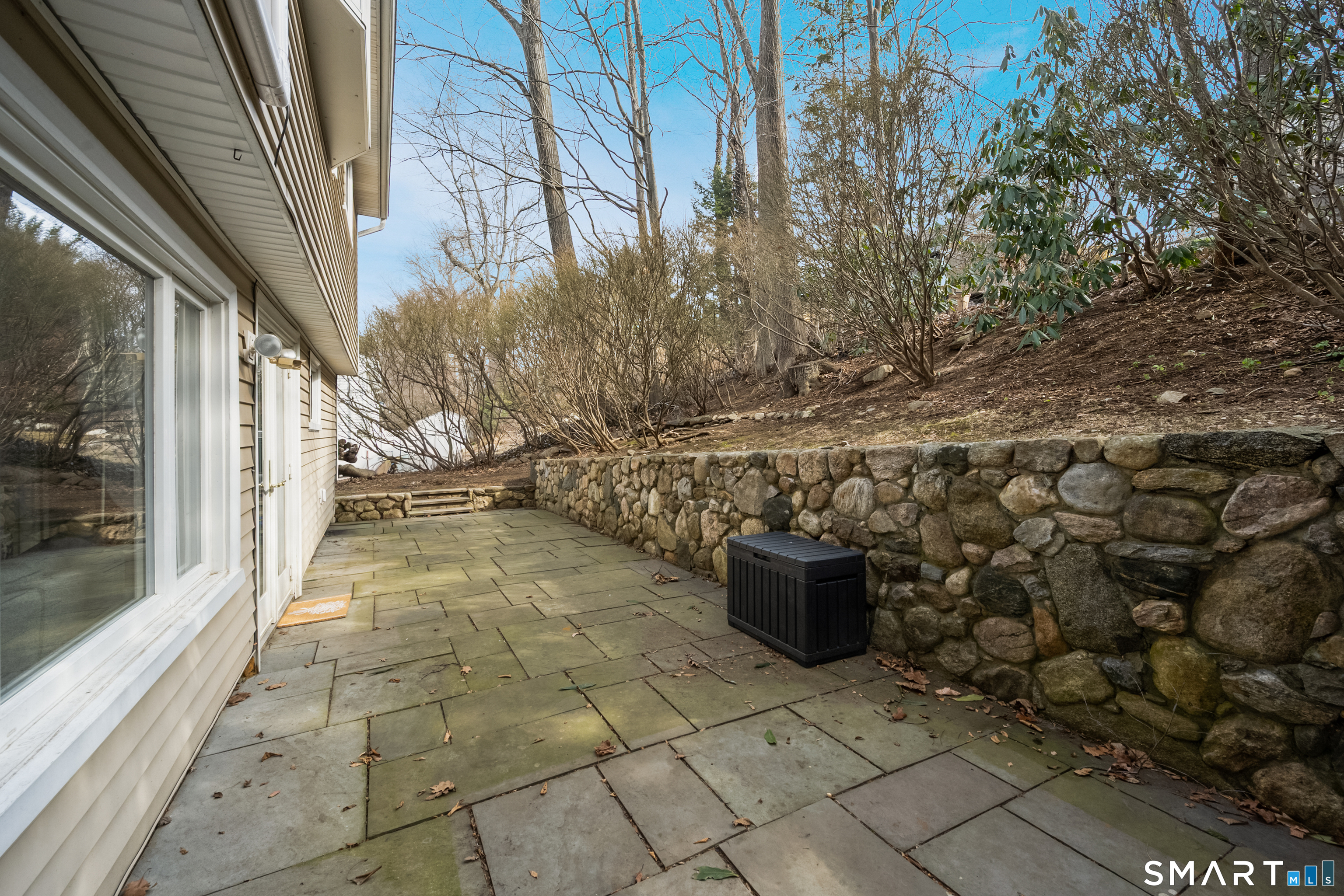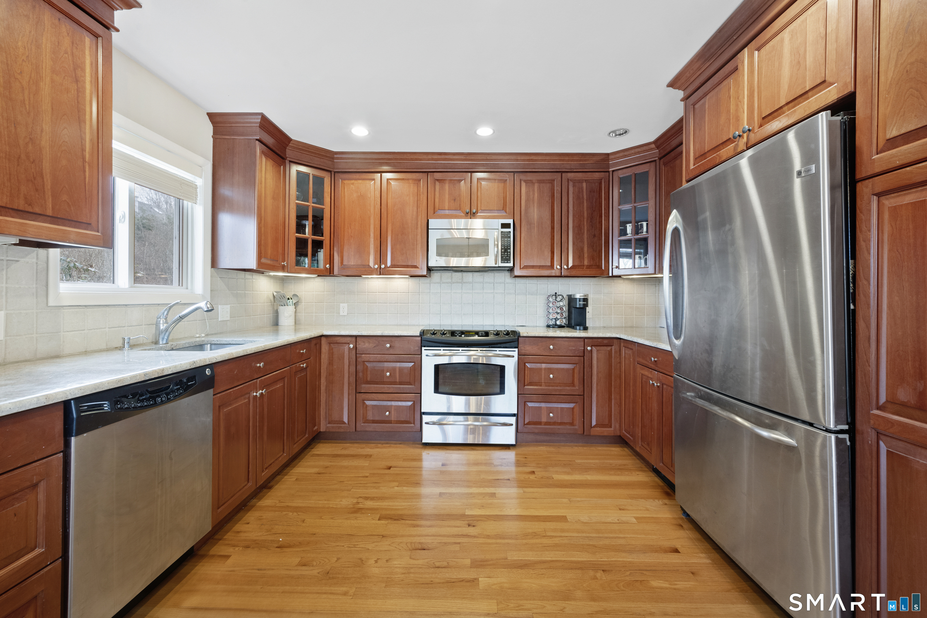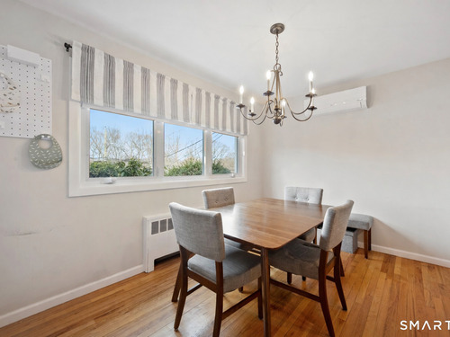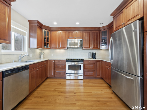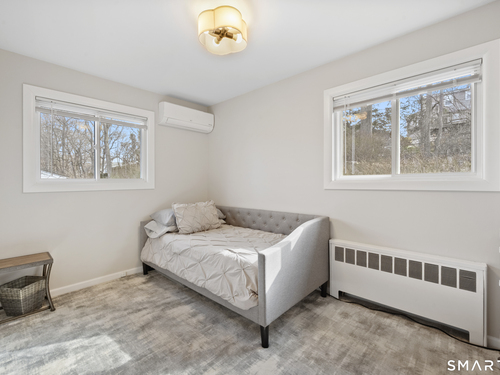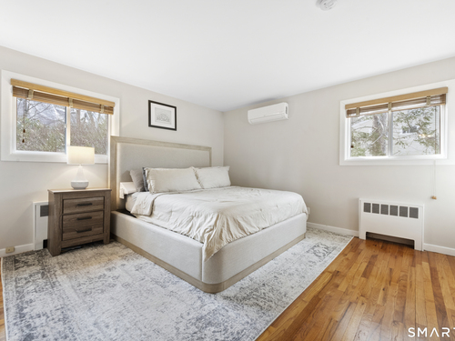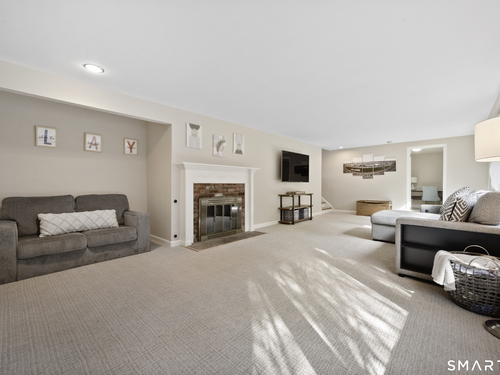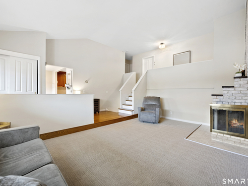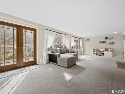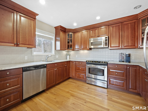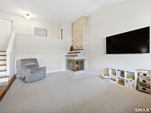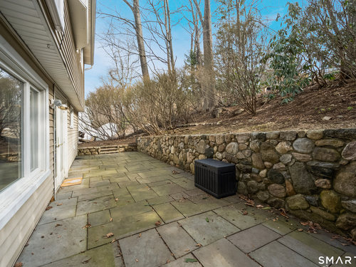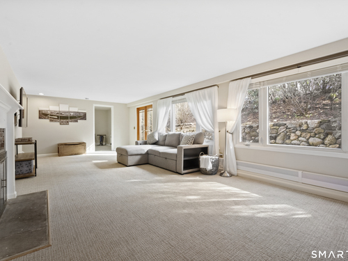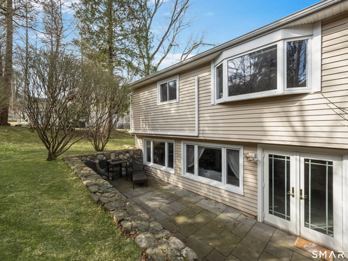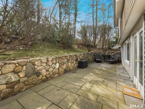 Welcome to 130 Wood Ridge in the sought after Mid Ridges in Stamford. Walk into the living room featuring an open concept and is highlighted with a beautiful brick fireplace. Off the living room is a spacious dining room for gatherings, and generous sized kitchen with stainless steel appliances, granite countertops, and custom cherrywood cabinets with ample storage space. The upper level includes the primary bedroom with a full ensuite, closets with built-in organizers, and hardwood floors and additional bedrooms and bath. Downstairs features a family room showcasing another fireplace with a custom mantle plus French doors opening to a slate patio. A striking rock wall adds character, and just off the family room you'll find a dedicated office with a half bath. Large laundry room and separate storage located in the lower level. Throughout the home, enjoy ductless A/C. Conveniently located in the Mid Ridges area, close to both High Ridge and Long Ridge Roads.