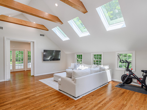 Tucked away at the end of a serene cul-de-sac, a stately gated entrance welcomes you to this exquisitely reimagined New England masterpiece, set amidst a picturesque park-like landscape. Over a half million dollars has been invested to elevate this home to an extraordinary level of craftsmanship, sophistication, and comfort. Step inside to experience an inviting open-concept living space, where radiant-heated hardwood floors bring warmth throughout the main level. The dining room, adorned with custom millwork, offers an intimate setting for memorable dinners by a striking marble fireplace. Just beyond, the living room impresses with its elegant coffered ceiling & newly designed built-ins topped with rich marble surface. Culinary enthusiasts will delight in the upscale eat-in kitchen, equipped with a professional-grade Viking range, microwave, & convection oven. Correra marble countertops provide a refined look while the walk-in pantry doubles as a stylish coffee bar. A conveniently placed entrance to the garage ensures effortless unloading after a day out. Ascend to the upper level to discover a stunning primary suite that boasts a soaring ceiling with exposed beams, two walk-in closets, and a sitting room. The spa-like ensuite bath is beautifully updated with radiant heated flooring and a luxurious walk-in double shower. A spacious family room above the garage offers versatility...it can be transformed into a fourth bedroom, a fitness studio, or an entertainment space.