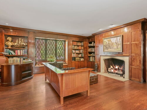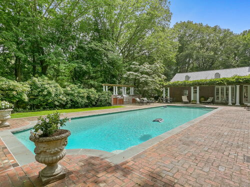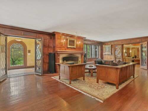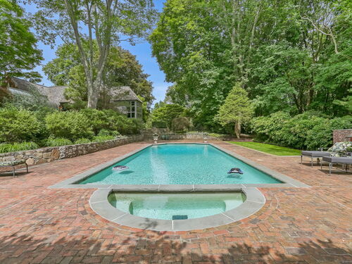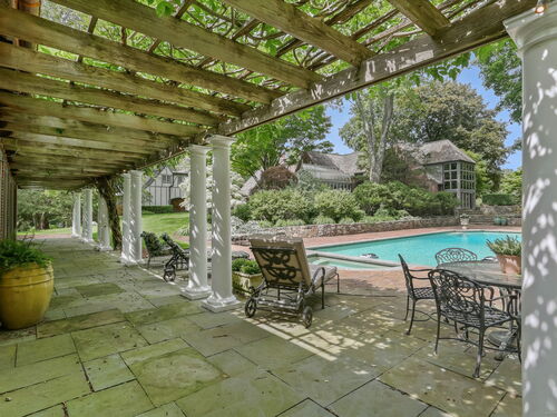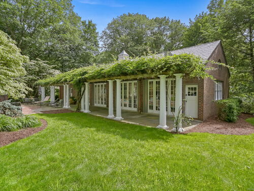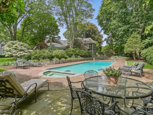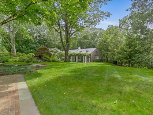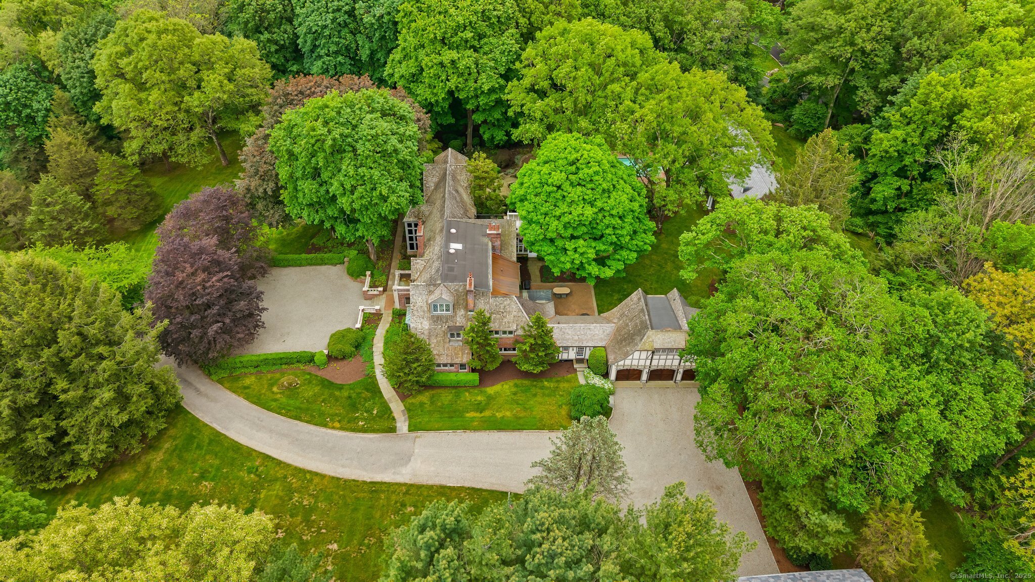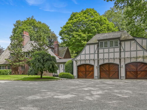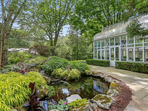 Historic charm meets modern luxury on 5 private acres in lower Weston. Set at the end of a long, tree-lined drive, this distinctive country estate offers rare privacy, character, and fully updated amenities. Once the personal retreat of Godspell creator John-Michael Tebelak, the property features a beautifully reimagined Tudor Revival residence expanded and renovated by noted architect Jack Franzen. The main home blends classic craftsmanship with contemporary comfort, offering 7 bedrooms, 8 full and 2 half baths, and a series of refined living spaces. Highlights include a dramatic two-story media and family wing with an 8x10' retractable theater screen, an elegant library, home office, and vibrant billiard room. The luxurious primary suite features a private balcony and spa-like bath, with additional ensuite bedrooms providing excellent flexibility. A sun-filled conservatory opens to stone terraces, koi pond, and sculpted gardens-ideal for quiet mornings or entertaining. A separate carriage house includes a fully private 1-bedroom guest cottage, and an additional 1,500 sq ft guest house offers upgraded kitchen, bedroom, and full bath-perfect for extended stays, multigenerational living, or work-from-home needs. Significant improvements throughout ensure turnkey, elevated country living close to Weston's top-rated schools, town center, and Westport amenities.
