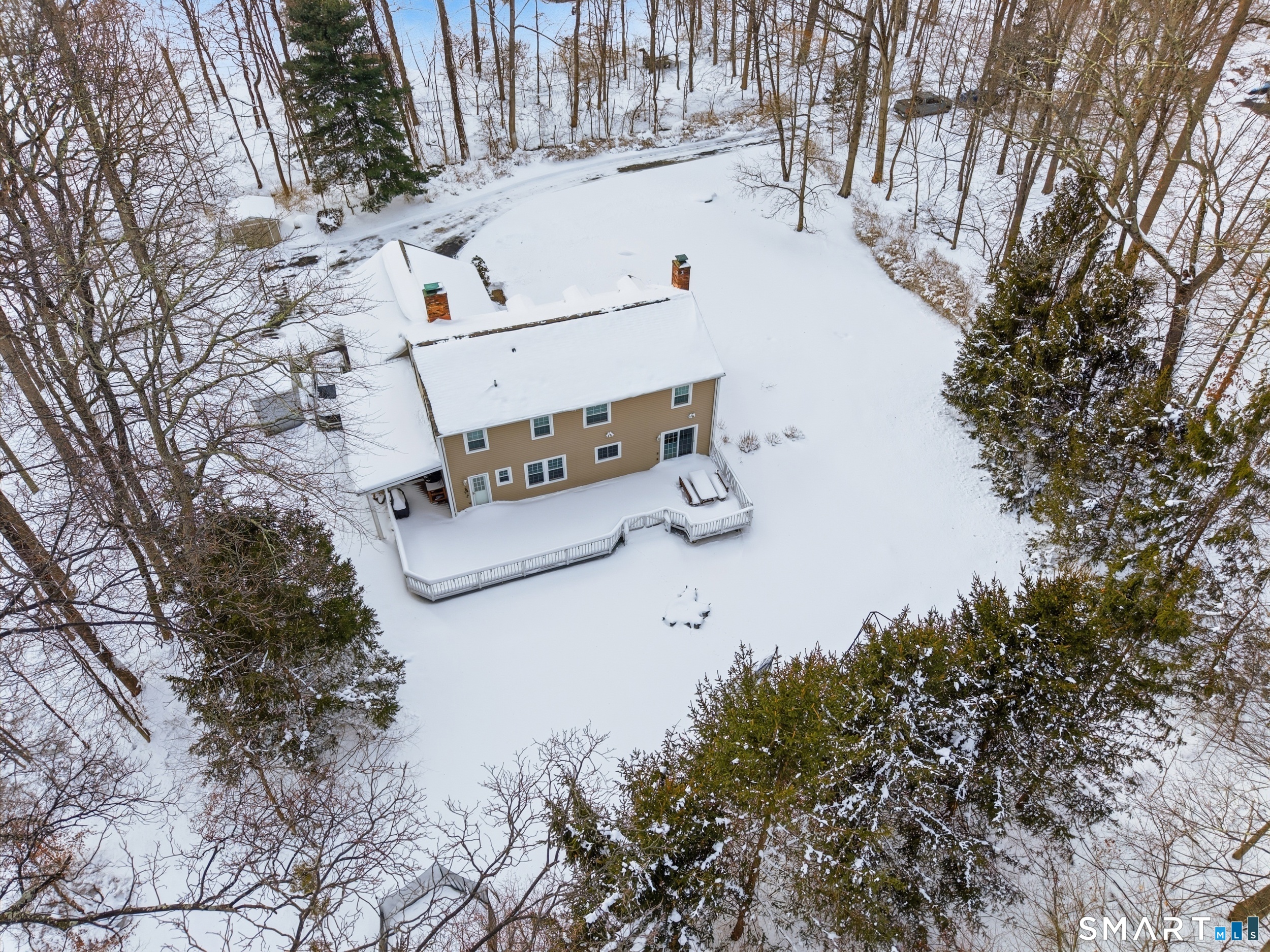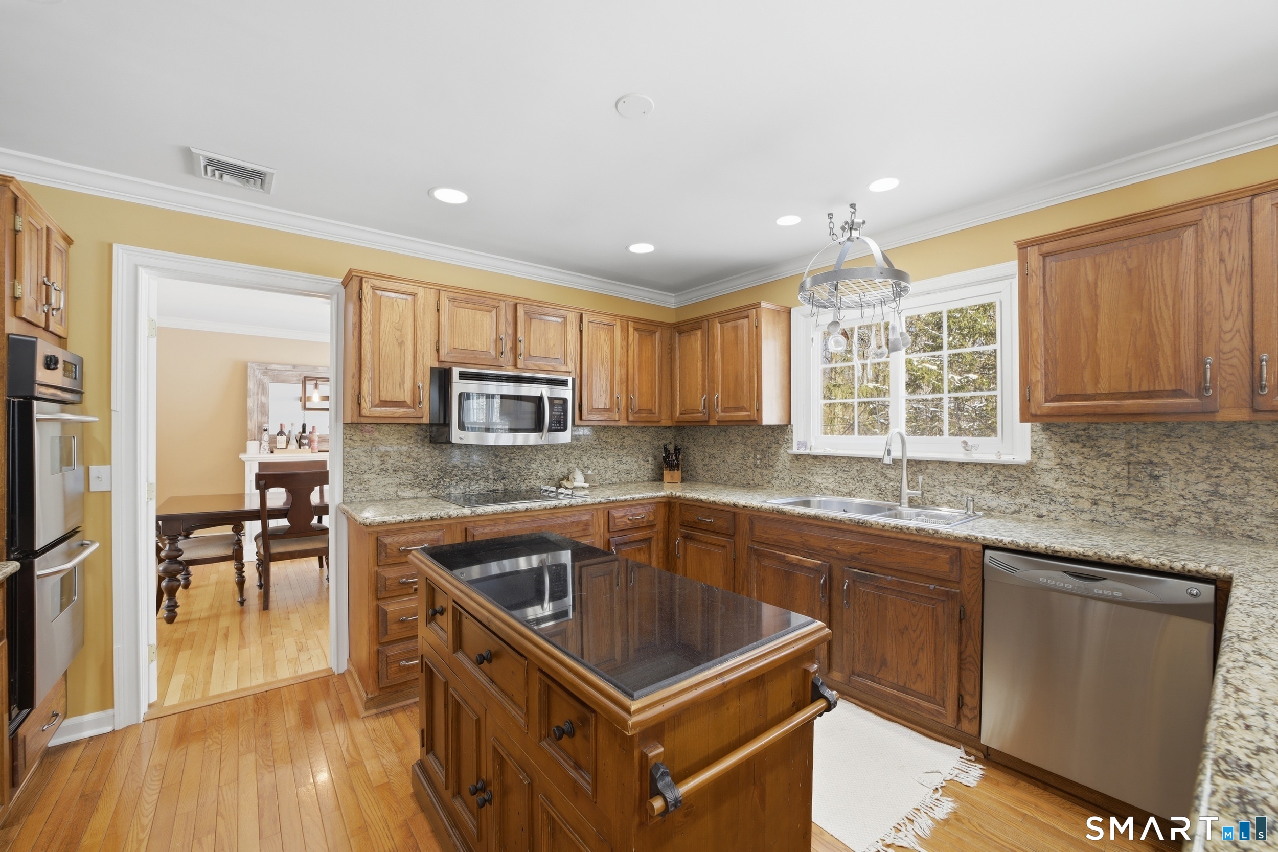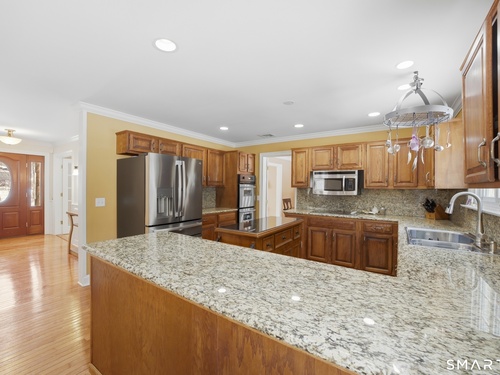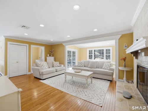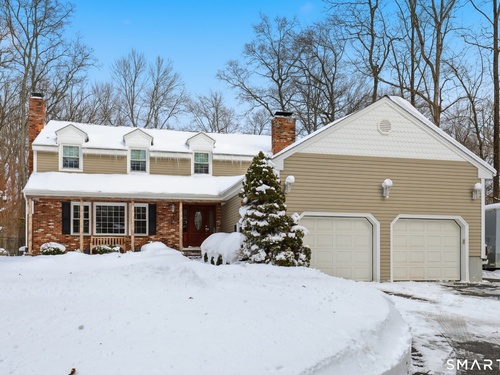Welcome to this beautifully maintained North Stamford home, thoughtfully designed for comfortable living and effortless entertaining. Nestled on a quiet cul-de-sac and set back from the road, the property offers exceptional privacy and a serene setting. Inside, the spacious living room with a classic wood-burning fireplace creates a warm and inviting atmosphere and flows seamlessly into a formal dining room with direct access to the deck and backyard, perfect for gatherings and indoor-outdoor living. The large eat-in kitchen serves as the heart of the home, featuring a dedicated breakfast area, granite countertops, stainless steel appliances, a dual wall oven, and abundant cabinetry, while the adjoining family room offers a second wood-burning fireplace, a powder room, and additional access to the deck and yard. Upstairs, the primary suite provides a true retreat with a private full bathroom and walk-in closet, complemented by four additional bedrooms, and another full bath. The expansive lower level adds valuable flexibility with a large recreation room, private office, and plentiful storage. A two-car garage with high ceilings completes the home. Ideally located just minutes from the Merritt Parkway, shopping, and dining, this property combines privacy, space, and everyday convenience in one exceptional offering.