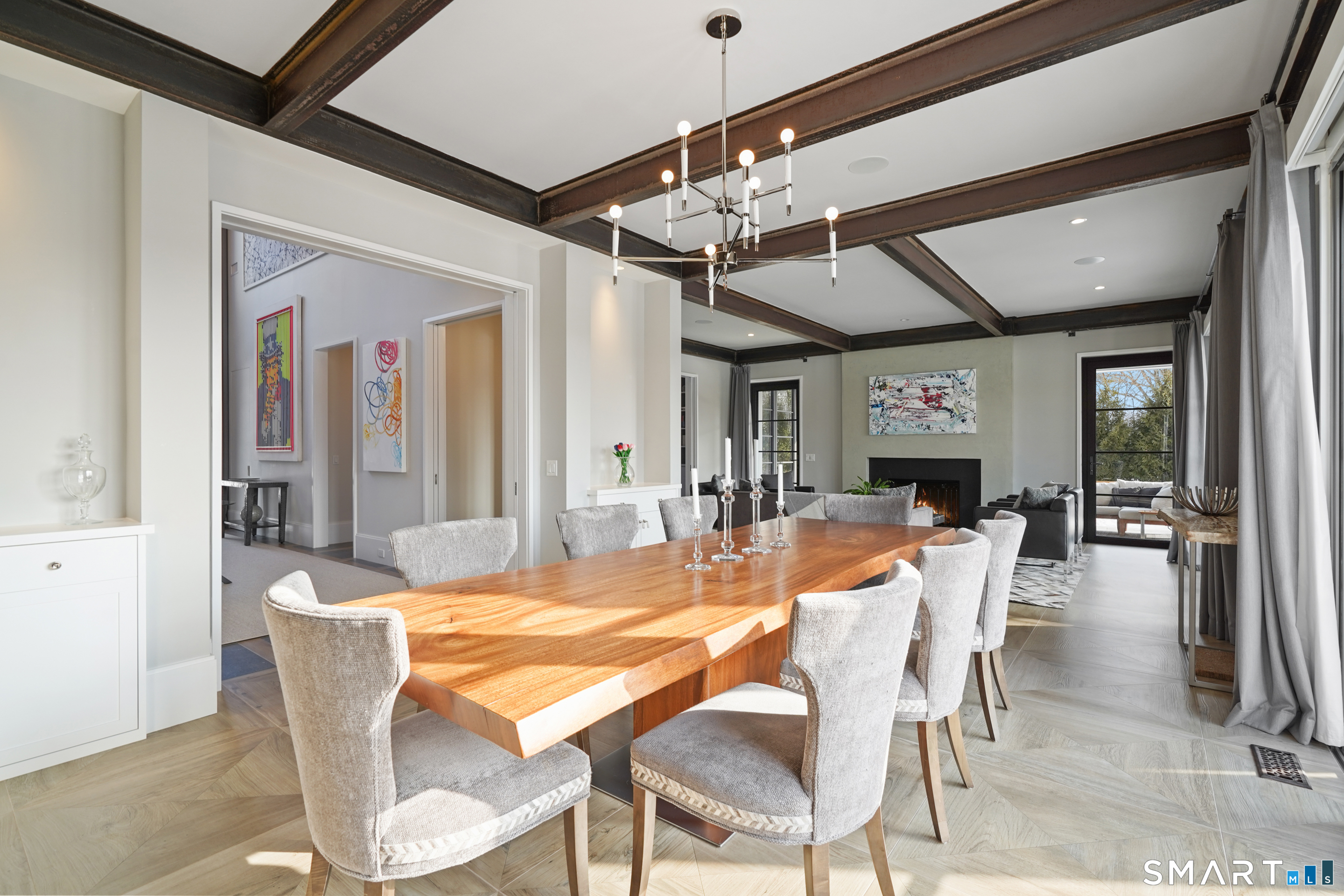 9 ft+ Ceilings, Fireplace, Patio/Terrace, Sliders, Hardwood Floor