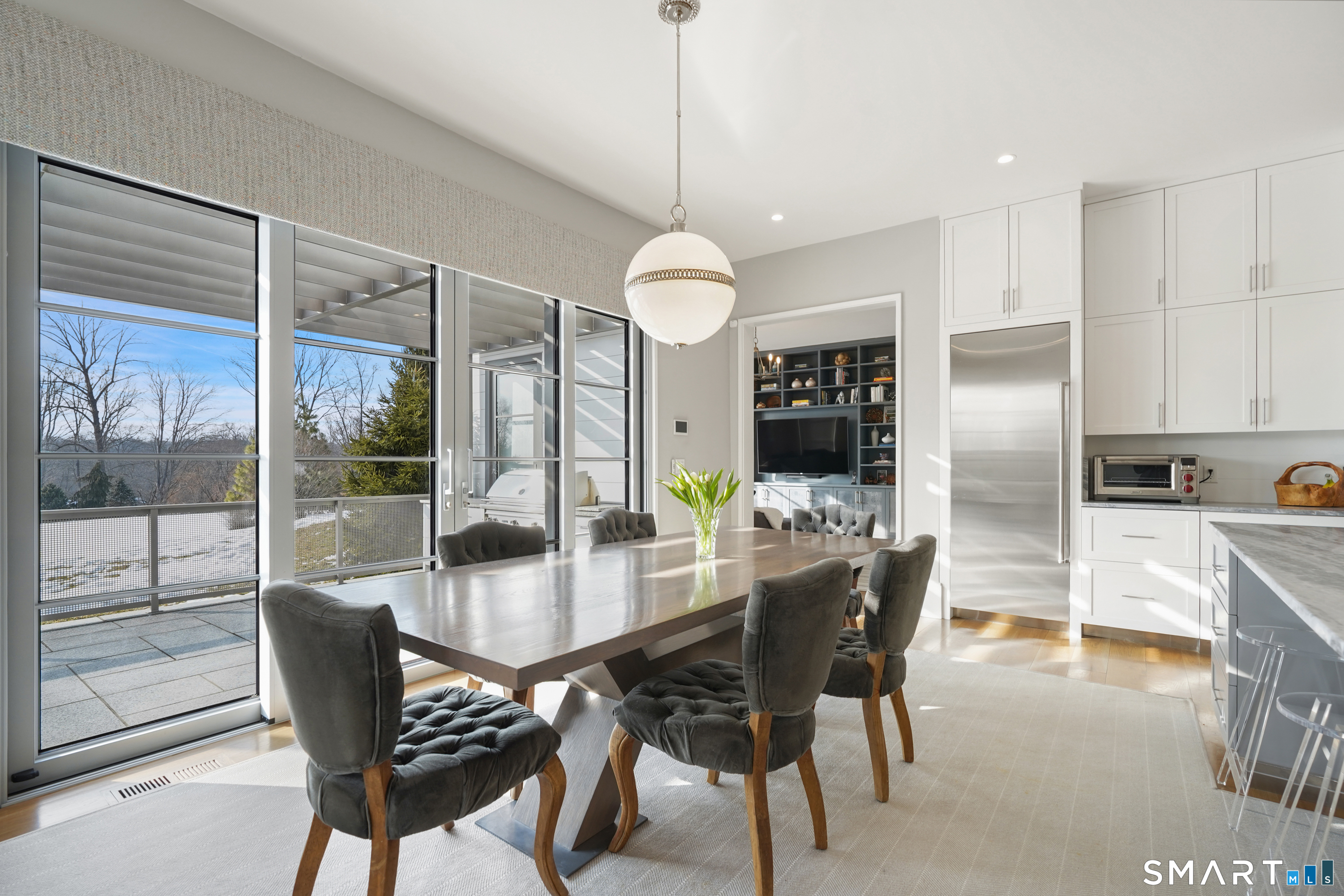 9 ft+ Ceilings, Dining Area, Island, Patio/Terrace, Sliders, Hardwood Floor