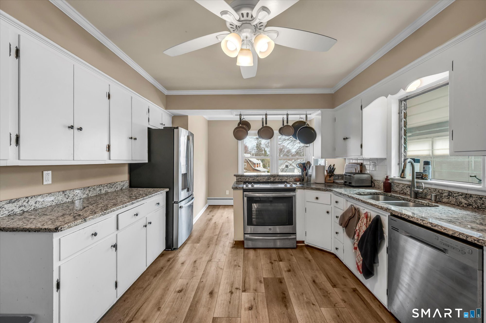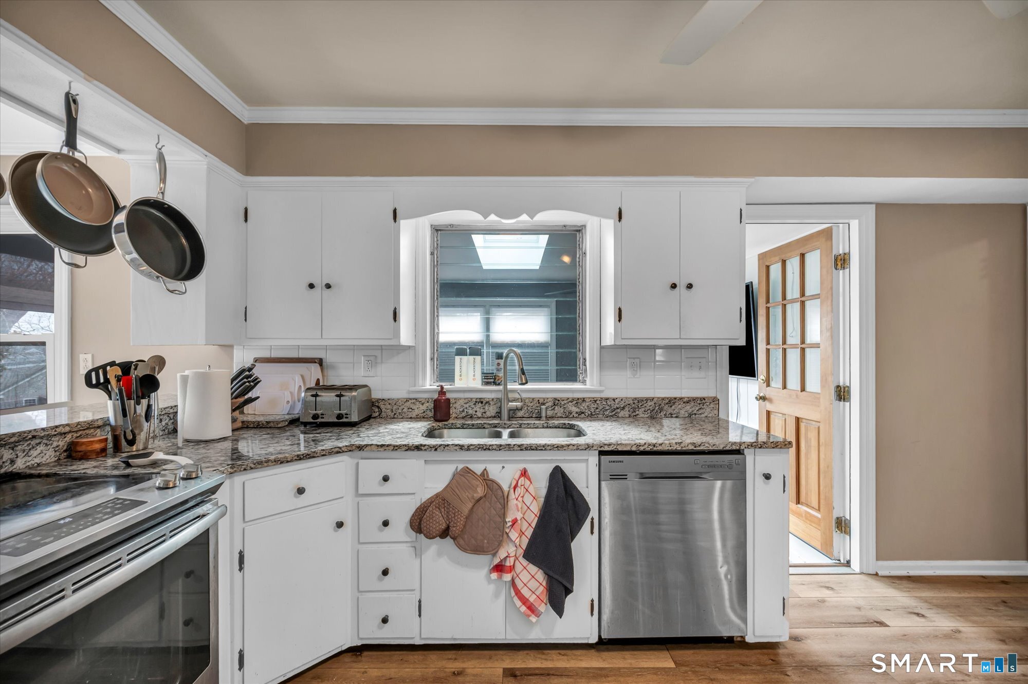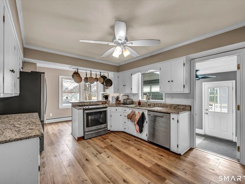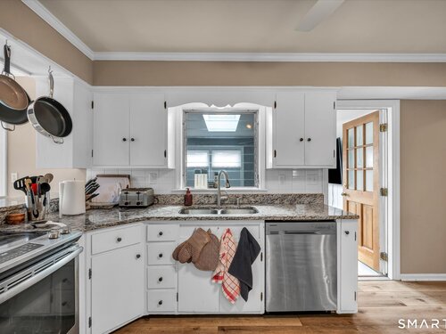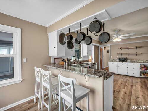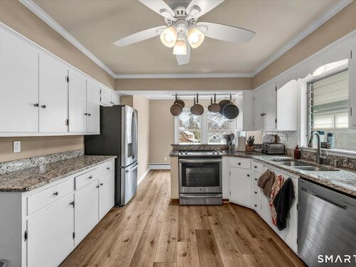 Welcome to 304 Huntington Road, nestled in Stratford's sought-after Paradise Green neighborhood! This charming Cape Cod-style home offers the perfect blend of classic character and modern updates. Step inside to discover gleaming hardwood floors throughout, a spacious living room anchored by a cozy brick fireplace, and an open dining area ideal for entertaining. The well-appointed kitchen features granite countertops, stainless steel appliances, and ample cabinet space. A first-floor bedroom and full bath provide convenient single-level living, while the second floor offers two spacious bedrooms and a full bathroom - perfect for family or guests. Enjoy year-round comfort in the heated sunroom, currently used as a home office/flex space, with skylights and beautiful views of the backyard. The heated lower level adds even more living space with a recreation room and additional room ideal for a home office, gym, or playroom. Outside, a large deck overlooks a spacious backyard - perfect for summer entertaining. The oversized 2-car garage and driveway with room for 6+ vehicles make parking a breeze. Additional highlights include updated windows, a new oil tank, and a prime location just minutes from downtown Stratford, shopping, dining, and major commuter routes. Don't miss this Paradise Green gem - schedule your showing today!
