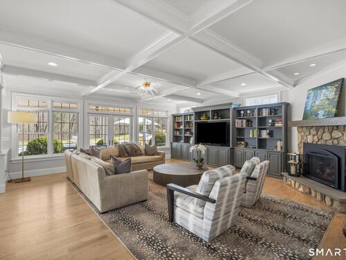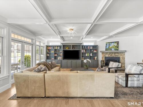 Built-Ins, Fireplace, French Doors, Hardwood Floor