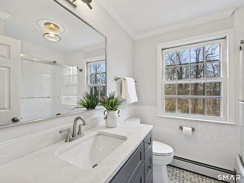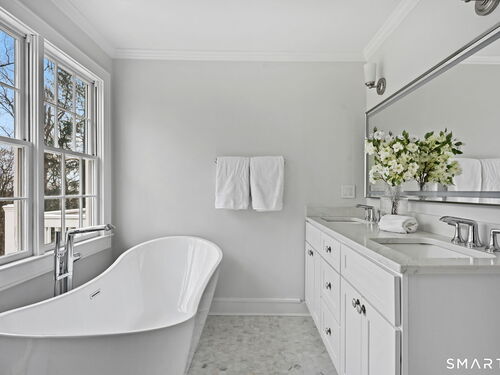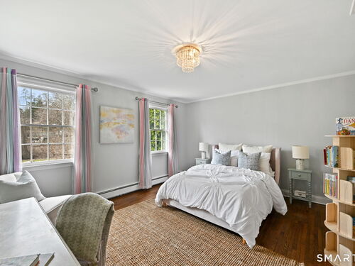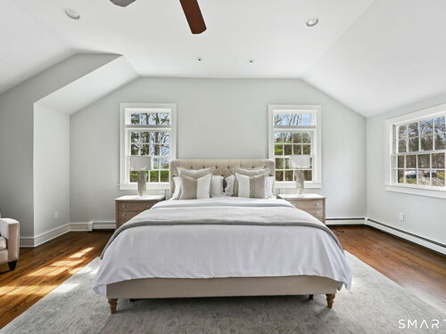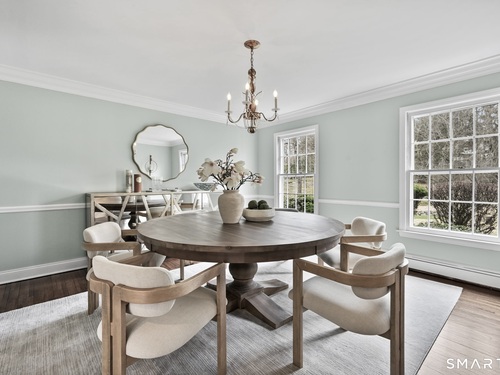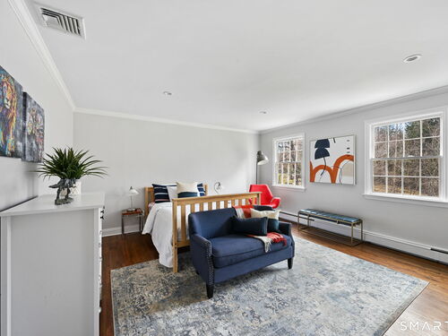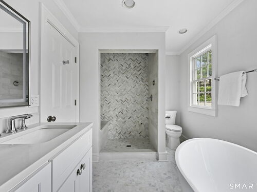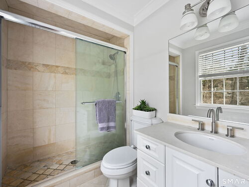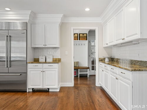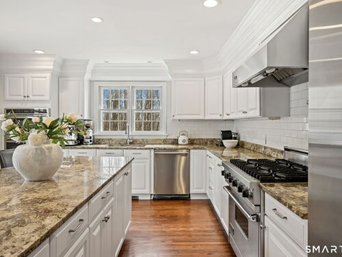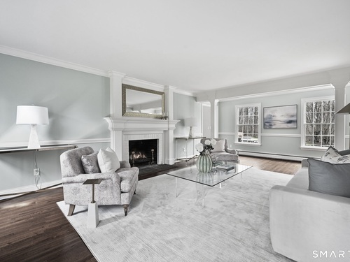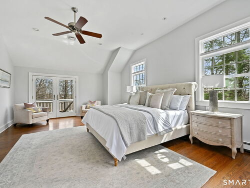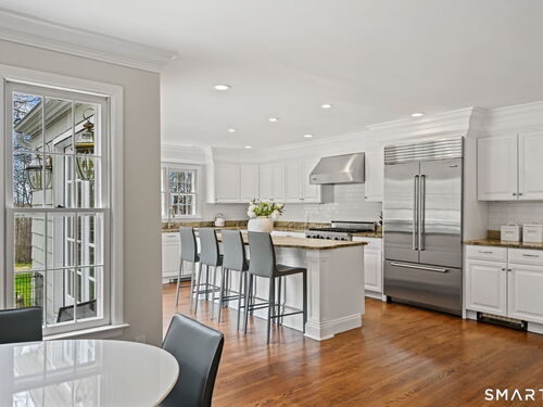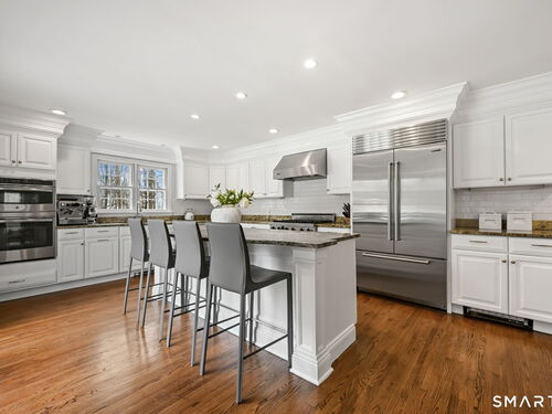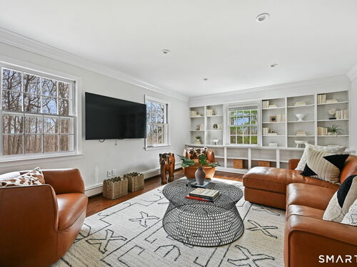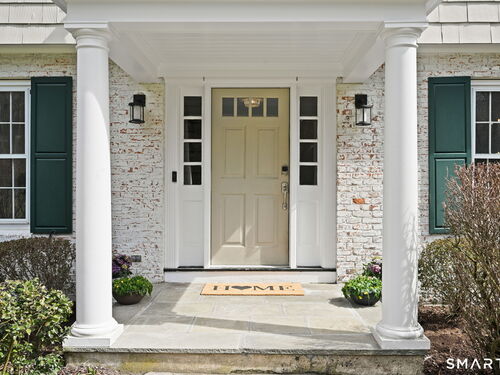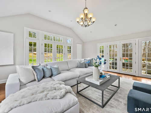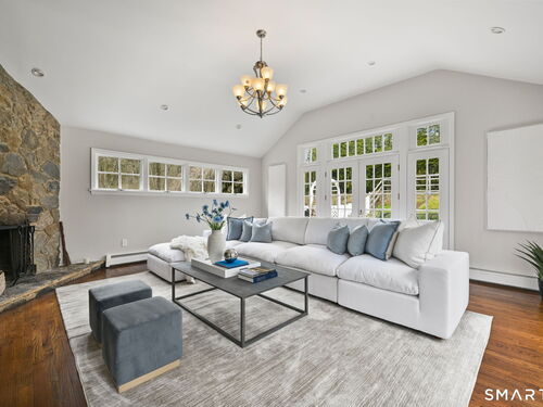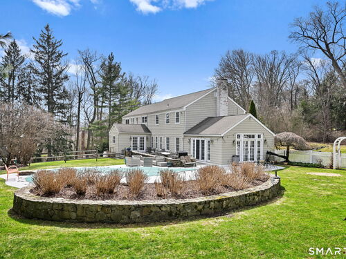 Enchanting Private Country Estate offering classic design and exceptional lifestyle flexibility. Privately set at the end of a country lane among prestigious estates on one of New Canaan's premier streets, this property delivers rare seclusion just minutes from town and train and acclaimed award-winning schools. Recently refreshed throughout, the home features a spacious primary suite with vaulted ceilings and a Juliette balcony overlooking beautifully landscaped grounds with multiple patios, a pool with waterfall spa, and mature perennial plantings. The suite is complemented by a spa-like bath and an expansive walk-in dressing room. Four additional bedrooms include a first-floor guest suite or flexible office. The gourmet kitchen is appointed with high-end appliances and opens to a bright, airy layout with seamless access to the patio-ideal for entertaining. An oversized family room with a fieldstone fireplace and French doors enhances the indoor-outdoor flow, while a large library/playroom with built-ins adds versatility to the main level. The lower level provides a relaxed recreation space, perfect for a game of pool. The expansive grounds also feature a large yard with a playground and ample open space for recreation and outdoor enjoyment. Surrounded by serene, private landscaping, this home offers a true sense of tranquility. A rare offering combining an ideal layout with every modern amenity-completely move-in ready.