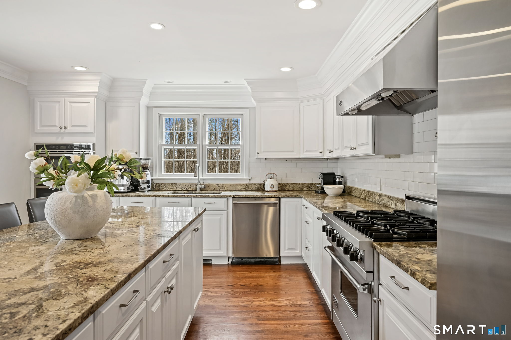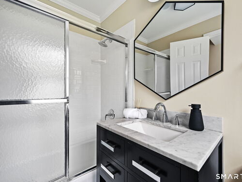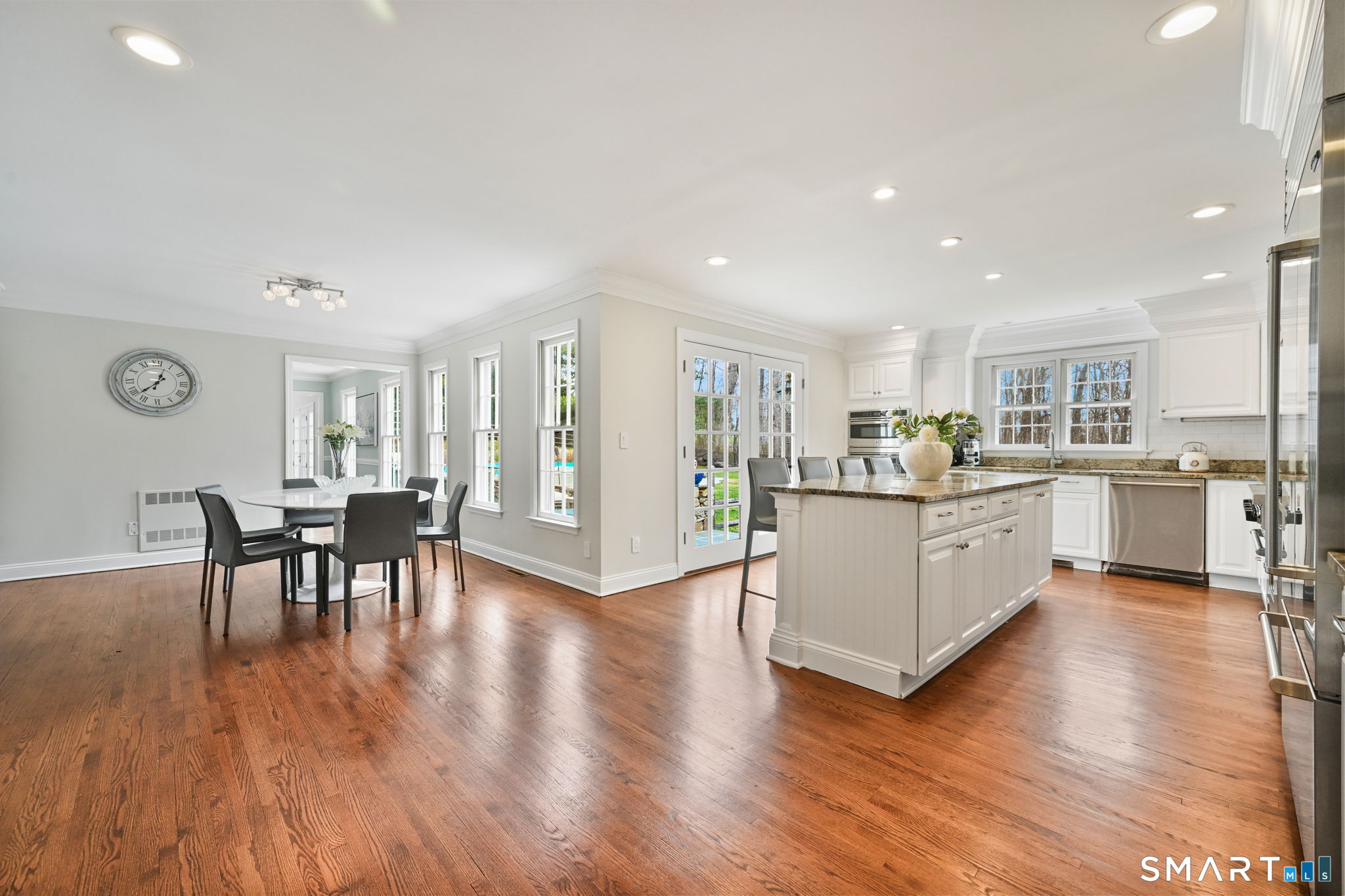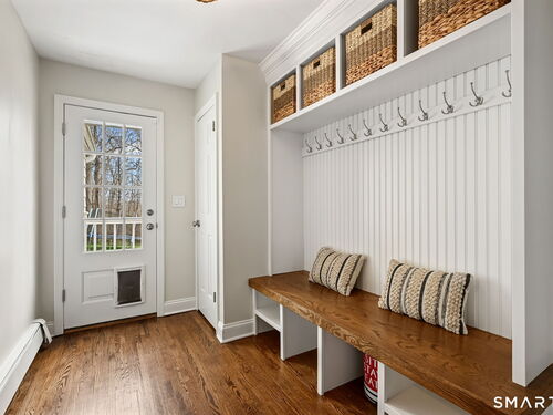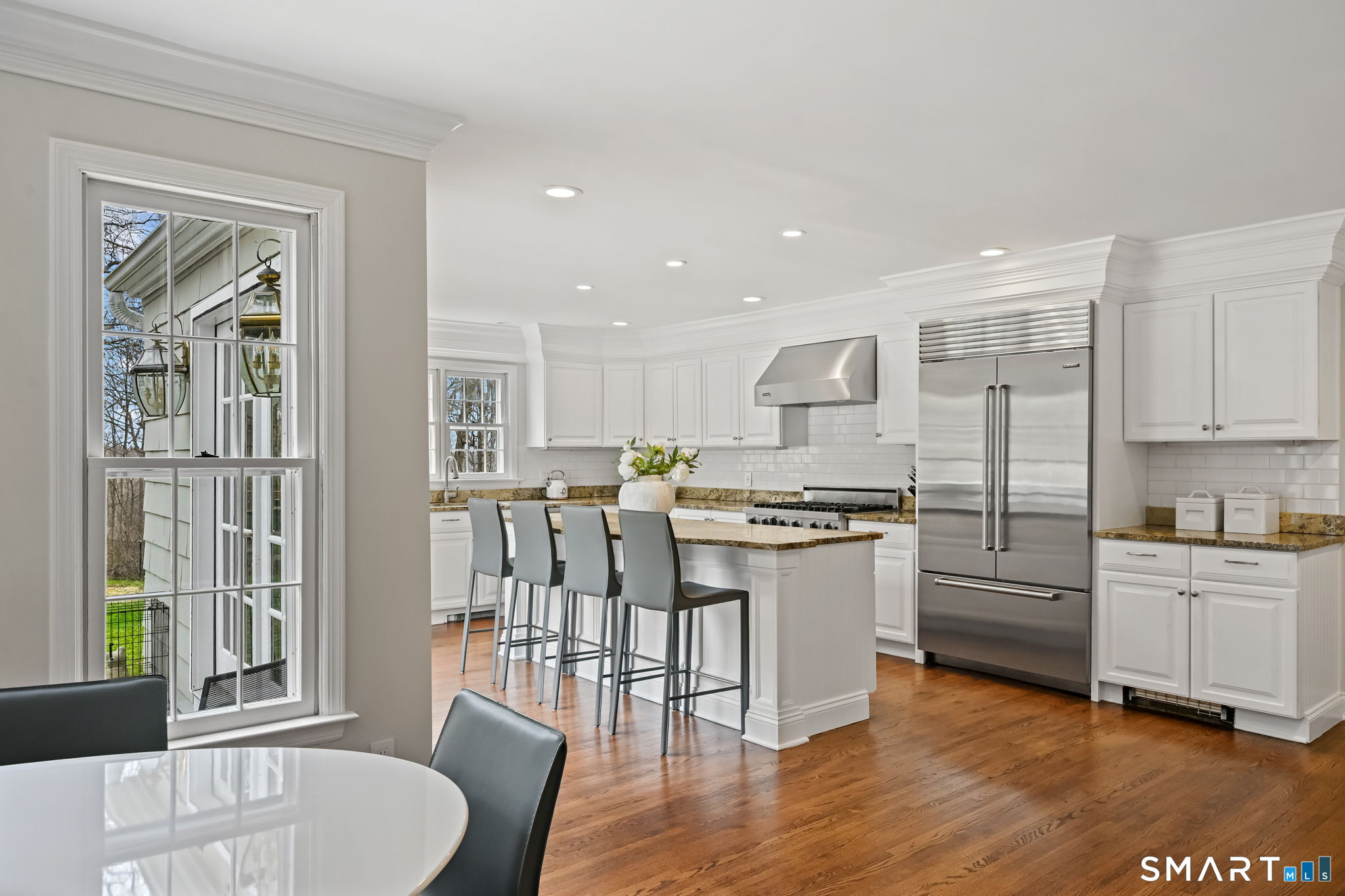 Enchanting Private Country Estate offering classic design and exceptional lifestyle flexibility. Privately set at the end of a country lane among prestigious estates on one of New Canaan's premier streets, this property delivers rare seclusion just minutes from town and train and acclaimed award-winning schools. Recently refreshed throughout, the home features a spacious primary suite with vaulted ceilings and a Juliette balcony overlooking beautifully landscaped grounds with multiple patios, a pool with waterfall spa, and mature perennial plantings. The suite is complemented by a spa-like bath and an expansive walk-in dressing room. Four additional bedrooms include a first-floor guest suite or flexible office. The gourmet kitchen is appointed with high-end appliances and opens to a bright, airy layout with seamless access to the patio-ideal for entertaining. An oversized family room with a fieldstone fireplace and French doors enhances the indoor-outdoor flow, while a large library/playroom with built-ins adds versatility to the main level. The lower level provides a relaxed recreation space, perfect for a game of pool. The expansive grounds also feature a large yard with a playground and ample open space for recreation and outdoor enjoyment. Surrounded by serene, private landscaping, this home offers a true sense of tranquility. A rare offering combining an ideal layout with every modern amenity-completely move-in ready.