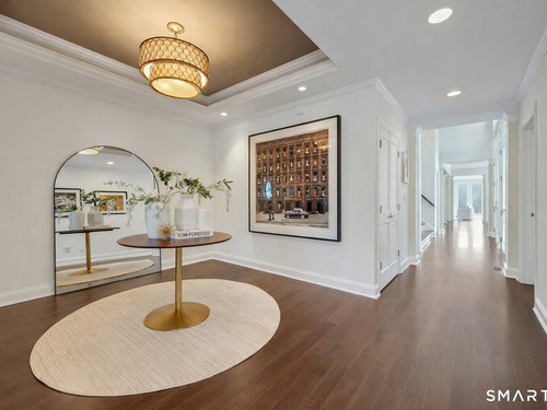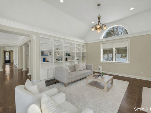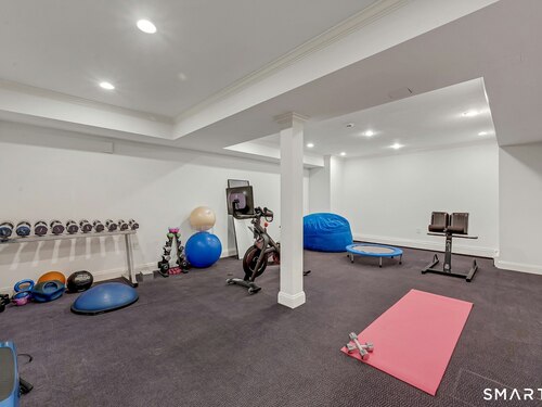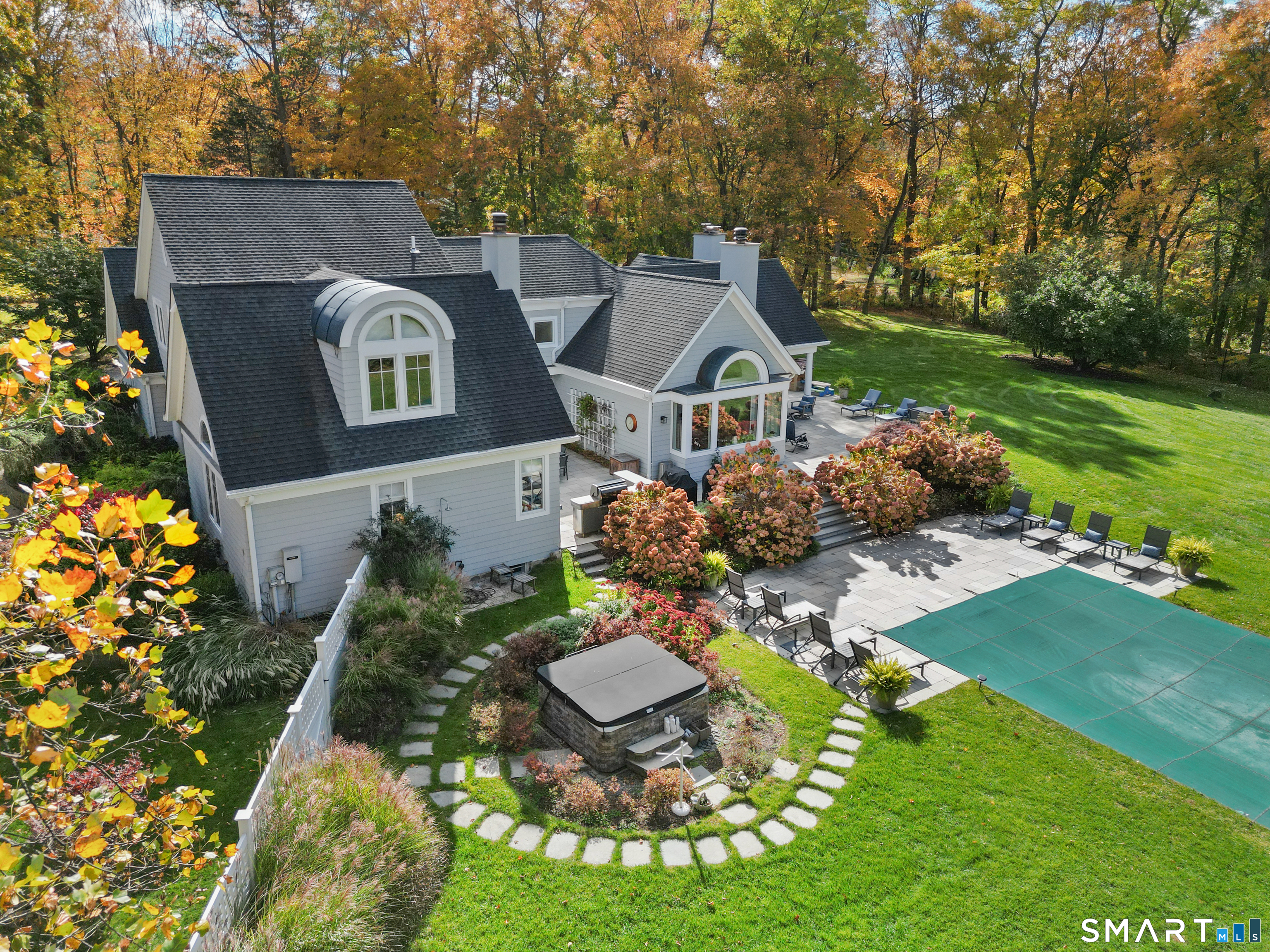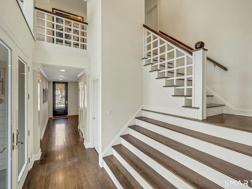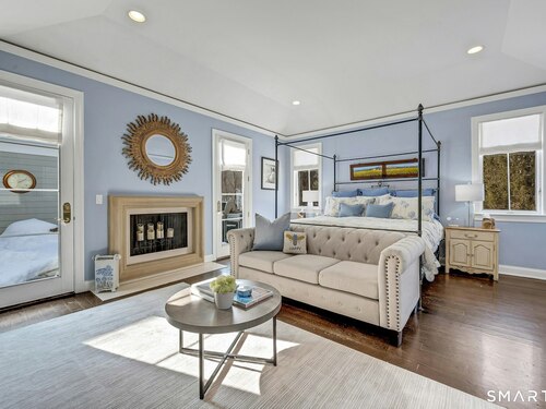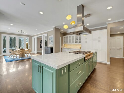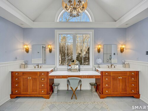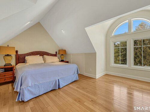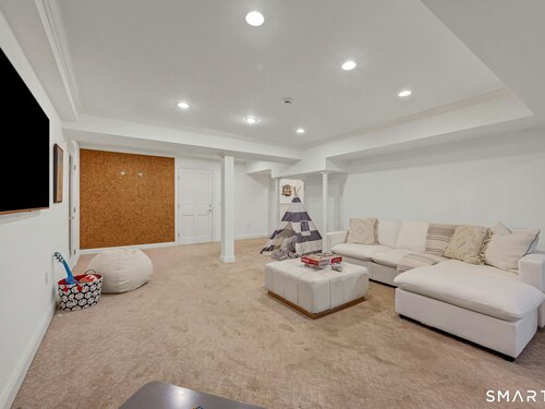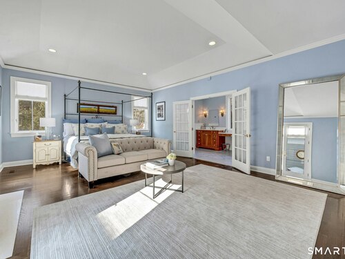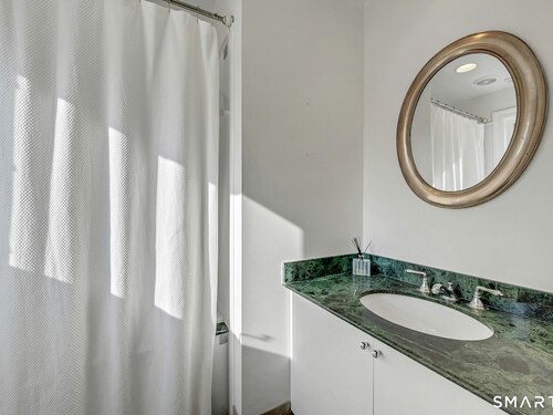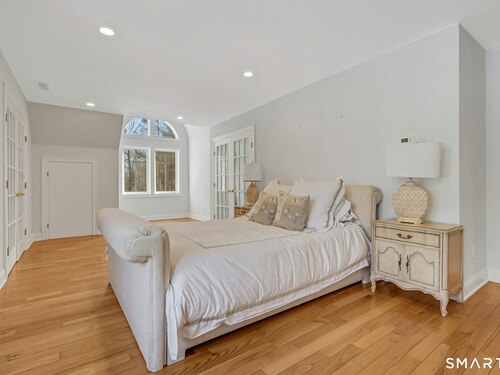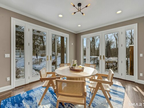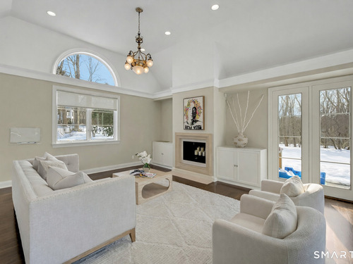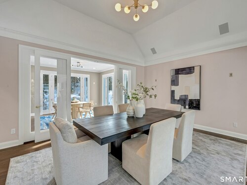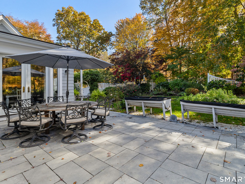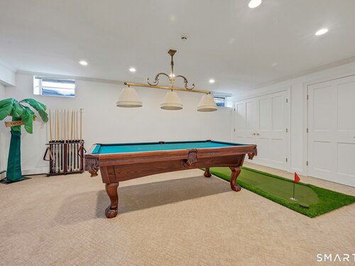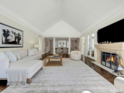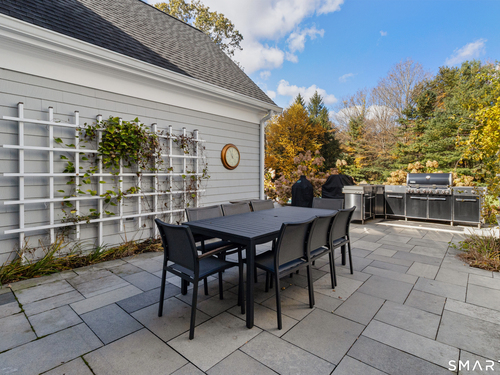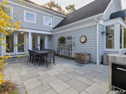 Welcome to this North Stamford retreat, gracefully set on 2.34 flat acres along the Greenwich border. Here, privacy and comfort meet refined updates in a home that feels expansive without being oversized. Thoughtfully designed with four bedrooms - including a desirable first-floor primary suite with coffered ceiling - the layout offers both flexibility and ease. The updated chef's kitchen opens to sunlit dining and living spaces highlighted by vaulted ceilings and exceptional natural light. Upstairs, a second potential primary suite and two additional bedrooms. A finished lower level adds an additional 1800 square feet and includes a gym, playroom, game room, wine cellar and extensive storage. Recent upgrades include a beautifully reimagined primary bath, new windows, and whole-property high-speed WiFi - seamlessly extending indoors and out. This home is an entertainer's dream! A striking pebble-finished gunite pool and spa, outdoor shower, professional landscaping and three distinct bluestone terraces create a resort-like feel. A home like this doesn't come along often!