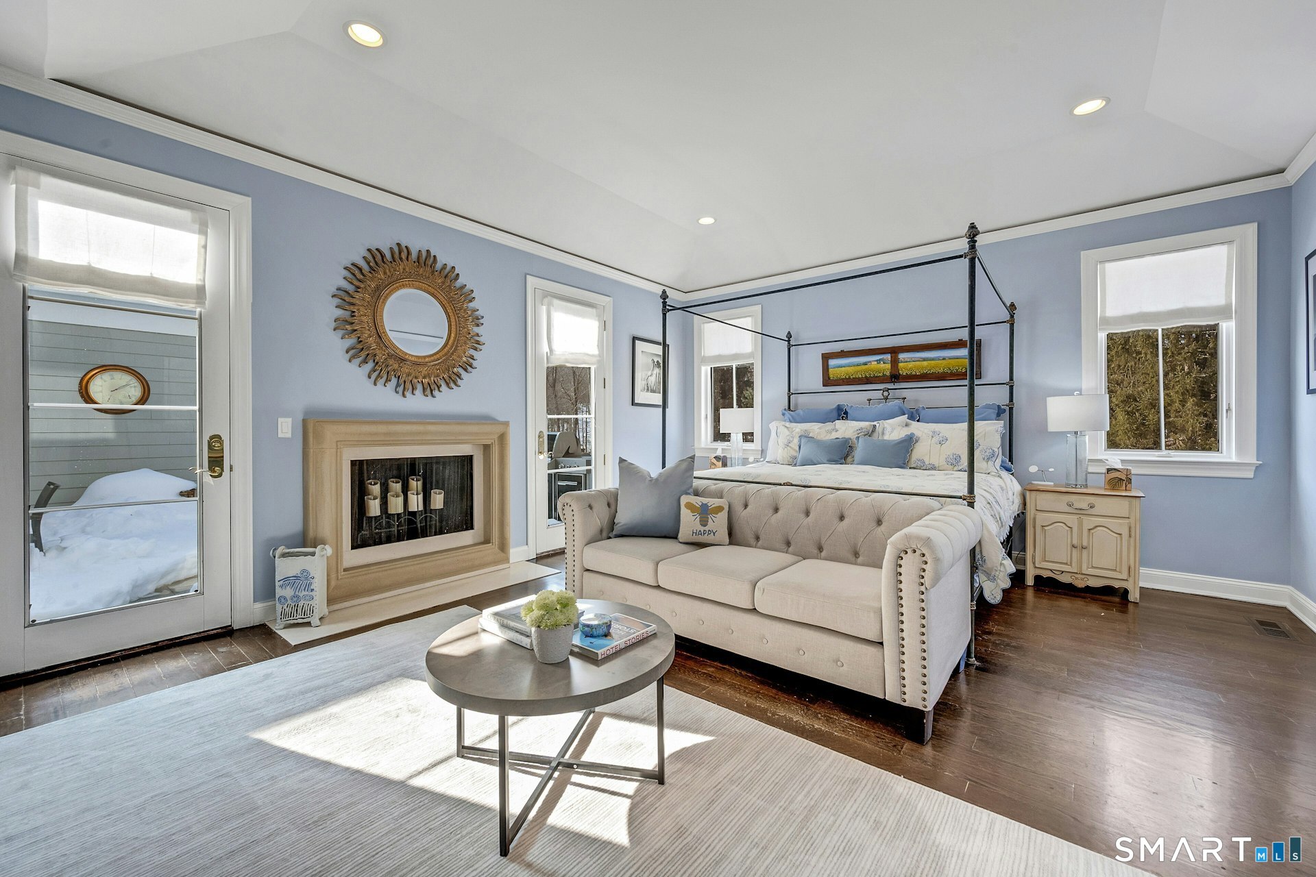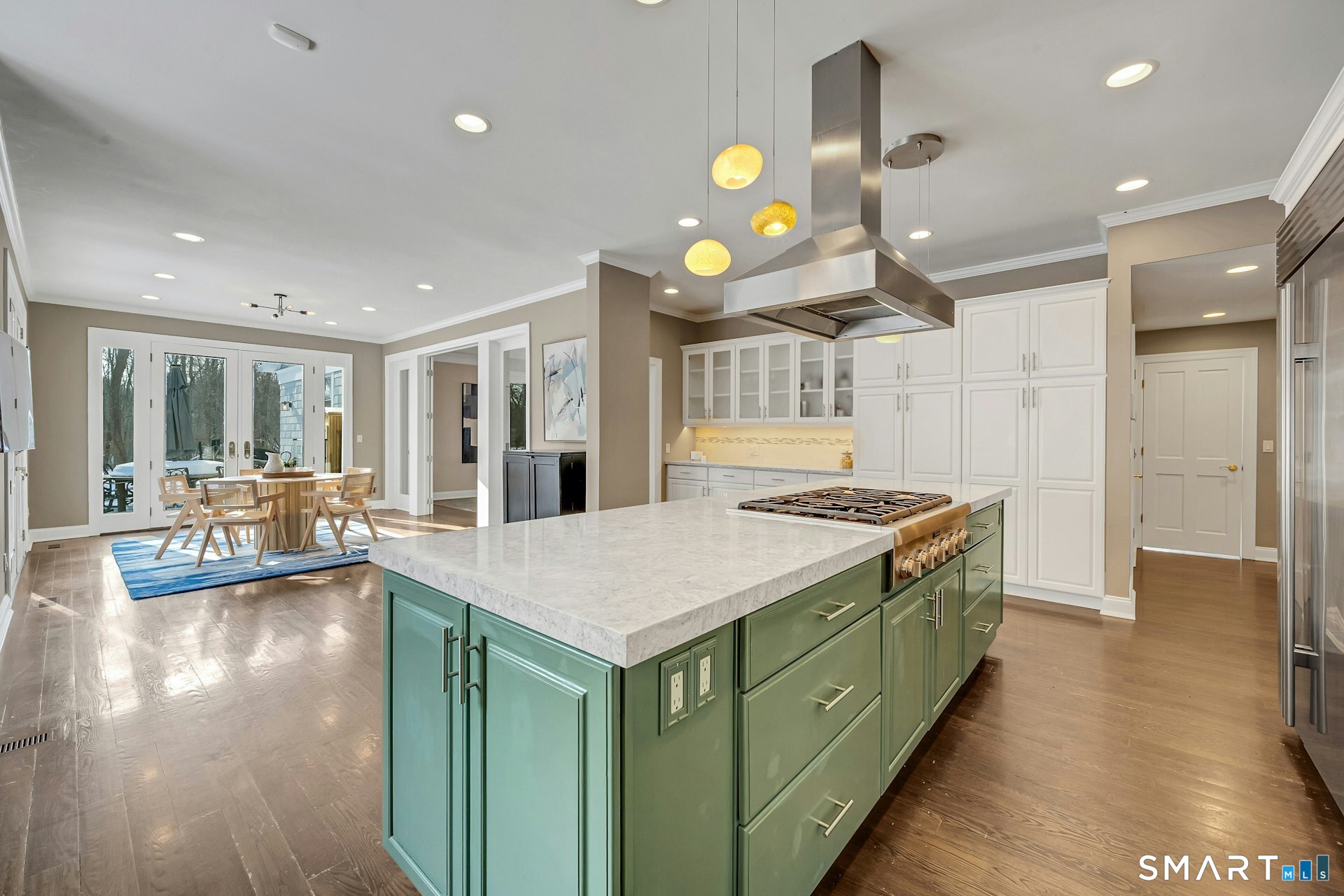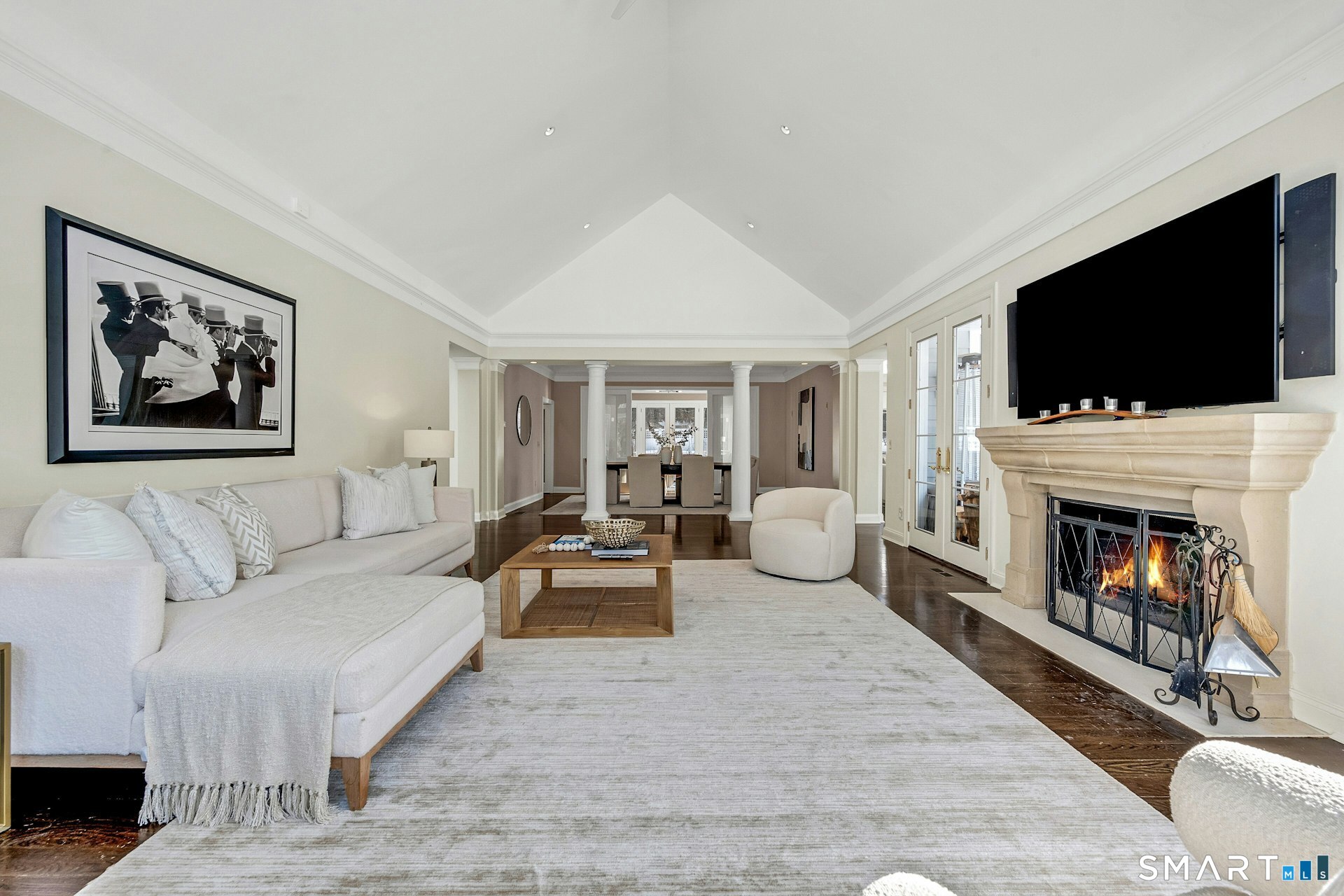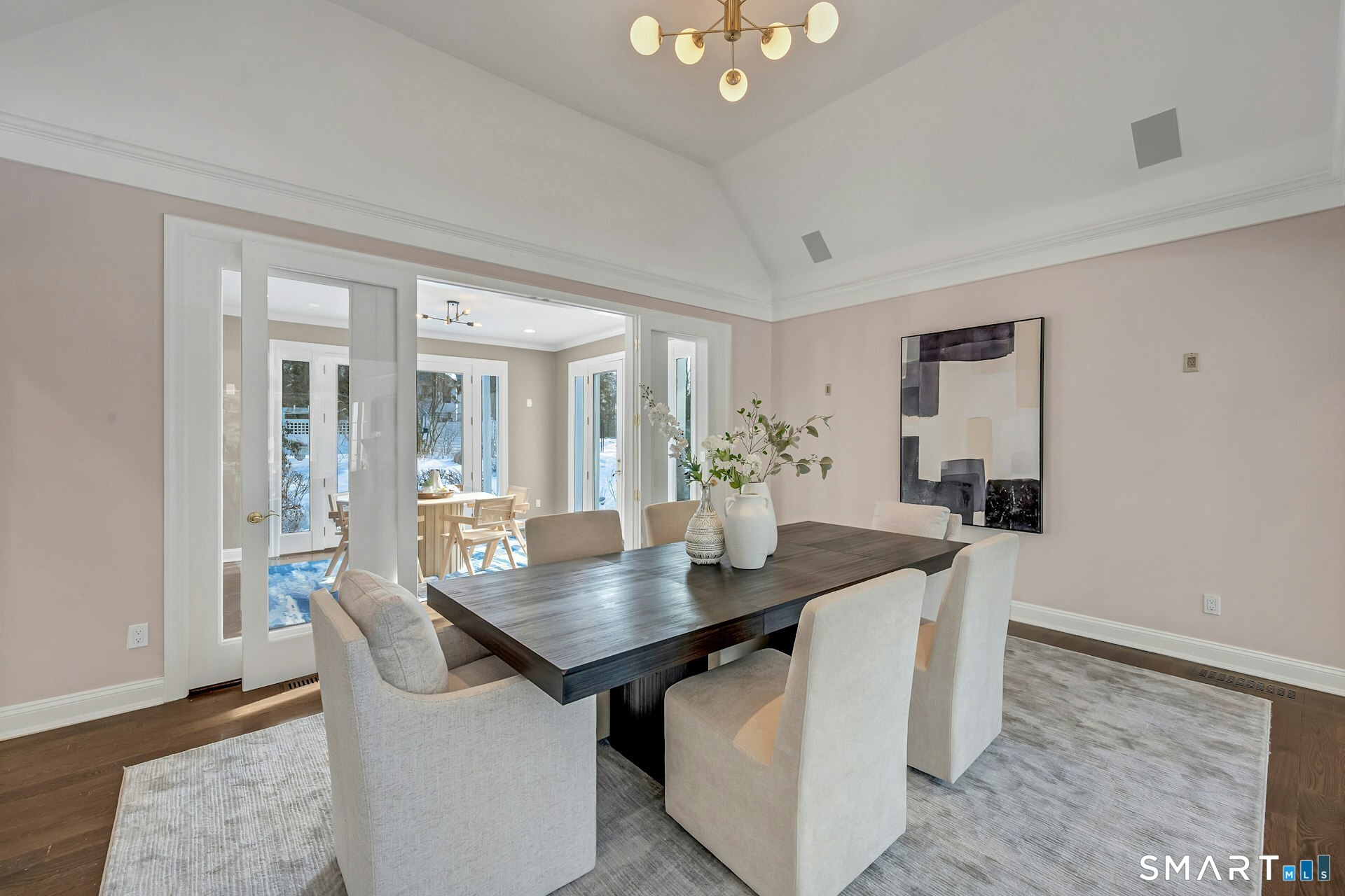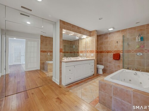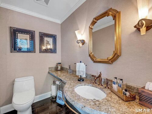 Welcome to this North Stamford retreat, gracefully set on 2.34 flat acres along the Greenwich border. Here, privacy and comfort meet refined updates in a home that feels expansive without being oversized. Thoughtfully designed with four bedrooms - including a desirable first-floor primary suite with coffered ceiling - the layout offers both flexibility and ease. The updated chef's kitchen opens to sunlit dining and living spaces highlighted by vaulted ceilings and exceptional natural light. Upstairs, a second potential primary suite and two additional bedrooms. A finished lower level adds an additional 1800 square feet and includes a gym, playroom, game room, wine cellar and extensive storage. Recent upgrades include a beautifully reimagined primary bath, new windows, and whole-property high-speed WiFi - seamlessly extending indoors and out. This home is an entertainer's dream! A striking pebble-finished gunite pool and spa, outdoor shower, professional landscaping and three distinct bluestone terraces create a resort-like feel. A home like this doesn't come along often!